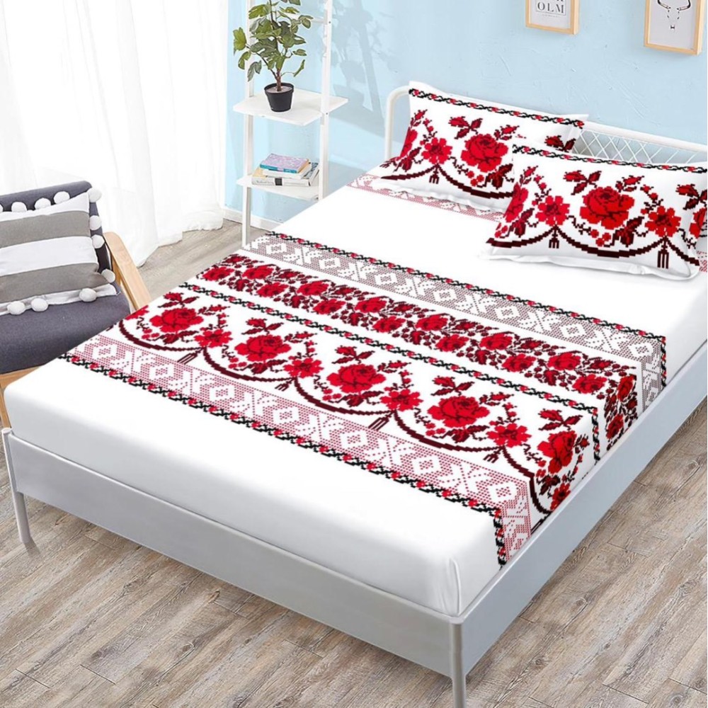 Cearsaf cu elastic, FINET, 180x200cm, 2 fete de perne 50x70cm, Alb-Rosu, model traditional, Johny Home Pucioasa, cod produs: SPR-G-231