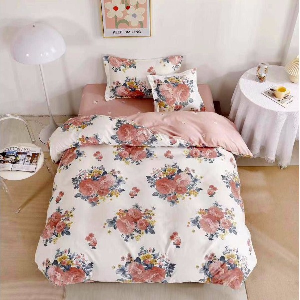 Lenjerie pat 1 PERSOANA, FINET, 4 piese, cu ELASTIC, Roz pudra, flori, Johny Home Pucioasa, cod produs: SPR-T60-102