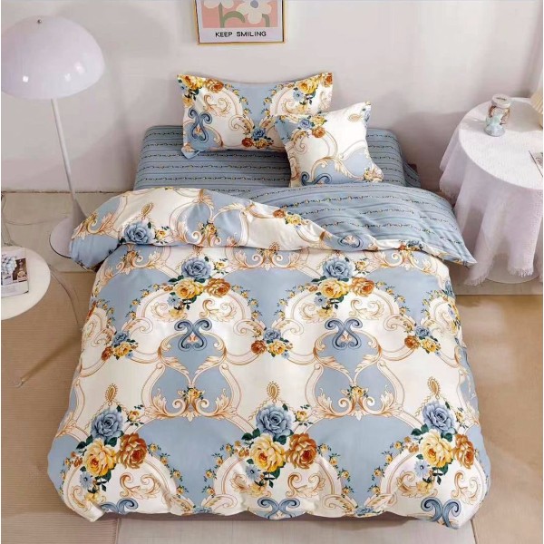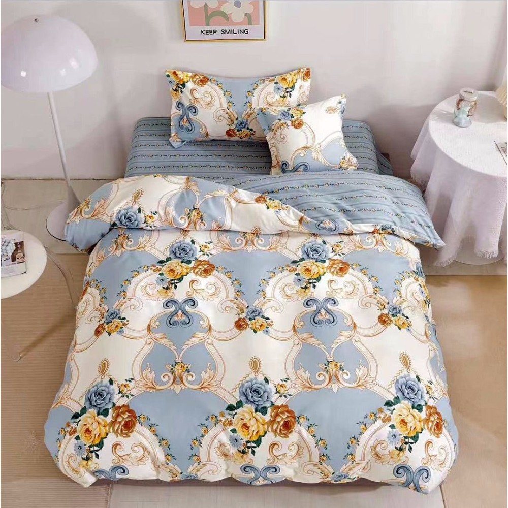 Lenjerie pat 1 PERSOANA, FINET, 4 piese, cu ELASTIC, Bleu, flori, Johny Home Pucioasa, cod produs: SPR-T60-107