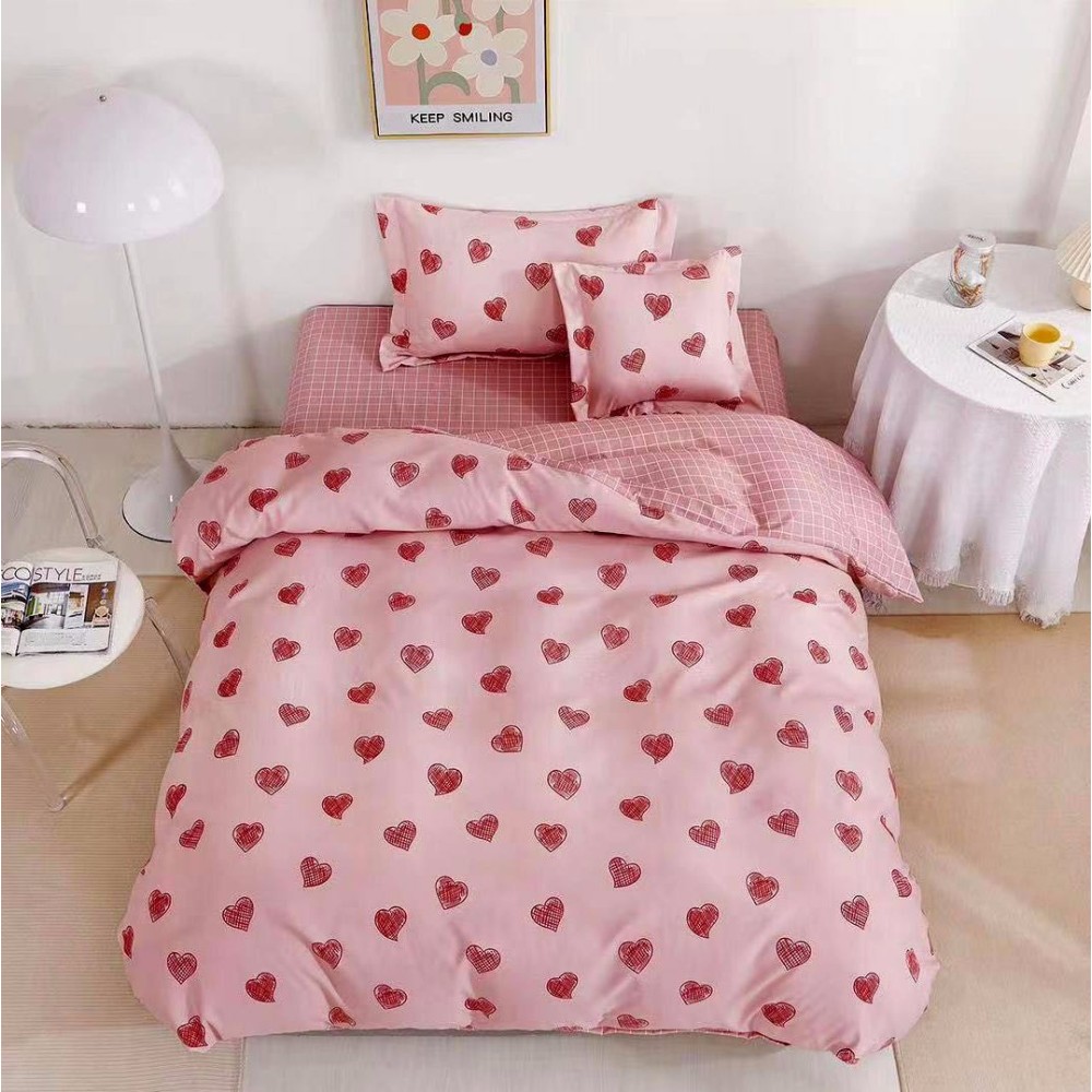 Lenjerie pat 1 PERSOANA, FINET, 4 piese, cu ELASTIC, Roz, inimioare, Johny Home Pucioasa, cod produs: SPR-T60-110