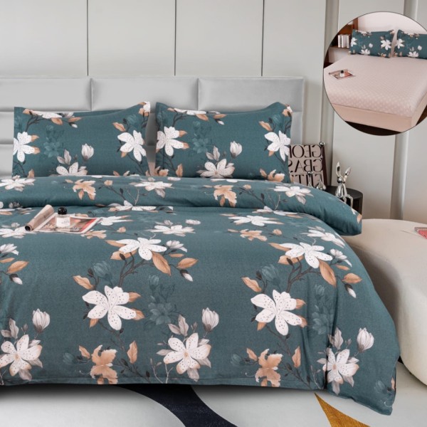 Lenjerie pat dublu, bumbac satinat, cu ELASTIC, 4 PIESE, verde, flori, CumparaMisim, cod produs: INS-LS-108