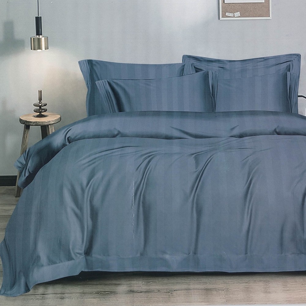 Lenjerie HoReCa DeLuxe, pat dublu, Damasc cu Dunga latã de 3cm, 6 piese, Albastru, JOJO Home, cod produs: DKN46