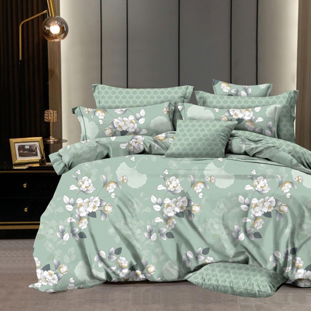 Lenjerie pat dublu, FINET, 6 piese, Verde, flori, Johny Home Pucioasa, cod produs: DKF29