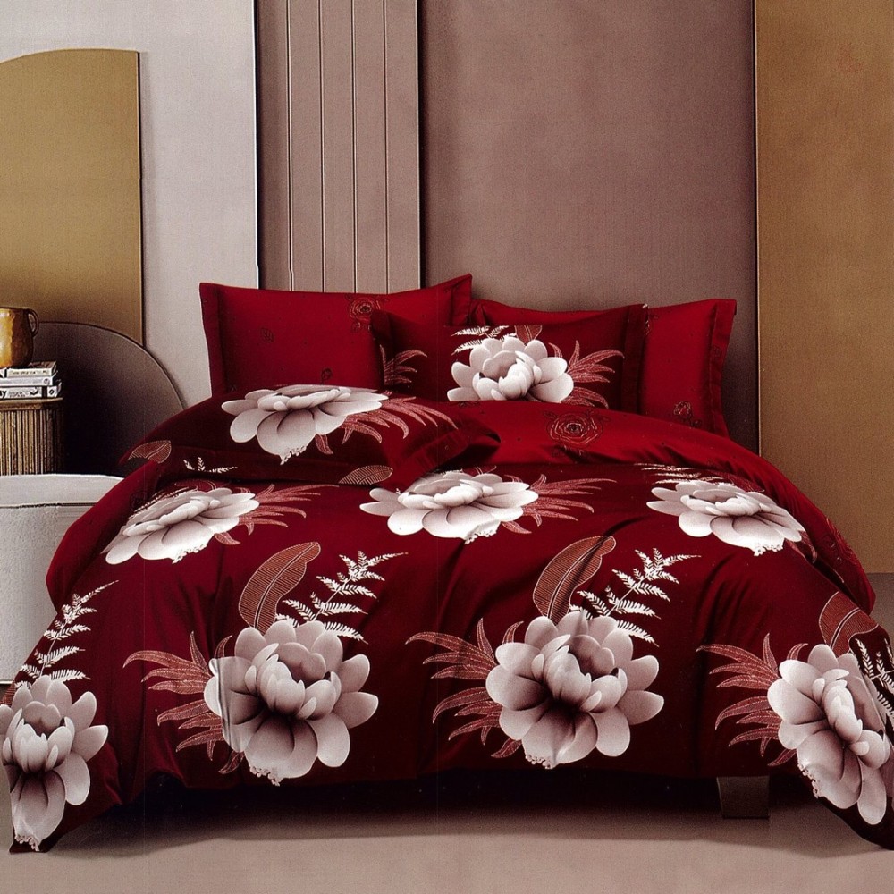 Lenjerie pat dublu, FINET, 6 piese, Rosu, flori, Johny Home Pucioasa, cod produs: DKF55
