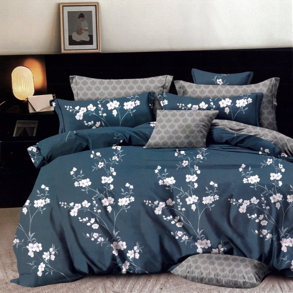 Lenjerie pat dublu, FINET, 6 piese, cu ELASTIC, Albastru, flori, Johny Home Pucioasa, cod produs: DKT29