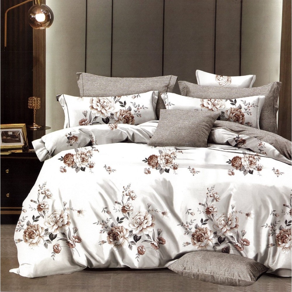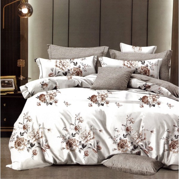 Lenjerie pat dublu, FINET, 6 piese, cu ELASTIC, Bej, flori, Johny Home Pucioasa, cod produs: DKT53