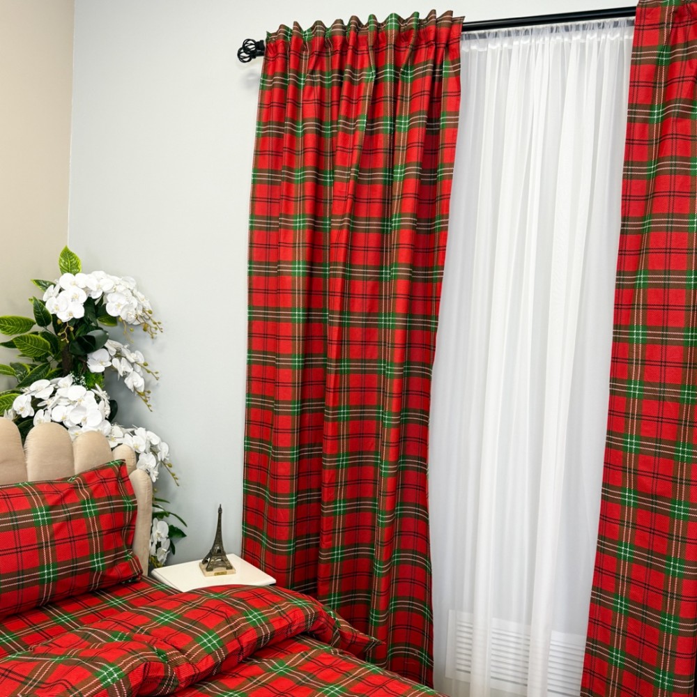 Două draperii 150 cm lățime x 235 cm înălțime – Draperiile sunt prevăzute cu rejansă pentru montare ușoară pe orice bară de draperii. Fabricate din același material de bumbac ranforsat, draperiile au o opacitate medie spre scăzută, ceea ce înseamnă că filtrează frumos lumina naturală, creând o atmosferă caldă și plăcută, fără a bloca complet lumina. Draperiile permit luminii să pătrundă și să ofere un efect de iluminare naturală difuză, perfectă pentru decorul de Crăciun și pentru orice alt sezon.