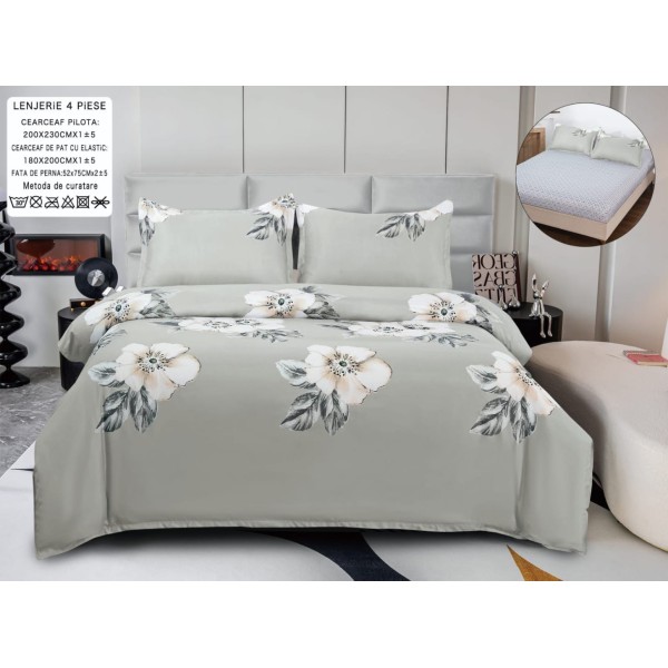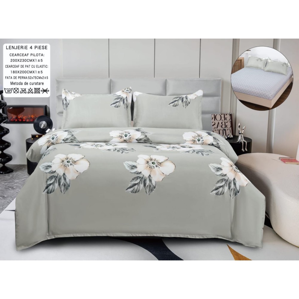 Lenjerie pat dublu, bumbac satinat, Cearșaf cu ELASTIC 180x200cm, 4 PIESE, Gri, flori, CumparaMisim, cod produs: INS-LS-158