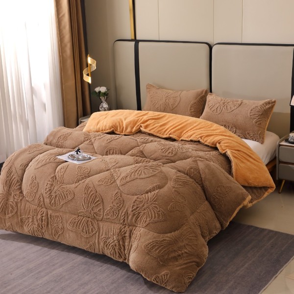 Pilota Groasă Cocolino Gofrat 3D cu Fluturi în Relief și Dos din Blăniță Sherpa, Umplutură Vatelină Siliconică, 200x230 cm + 2 Fețe de Pernă 50x70 cm - Căldură și Rafinament pentru Un Somn Odihnitor, Maro, cod produs: BCC-PC21
