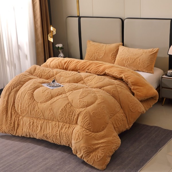 Pilota Groasă Cocolino Gofrat 3D cu Fluturi în Relief și Dos din Blăniță Sherpa, Umplutură Vatelină Siliconică, 200x230 cm + 2 Fețe de Pernă 50x70 cm - Căldură și Rafinament pentru Un Somn Odihnitor, BEJ, cod produs: BCC-PC23