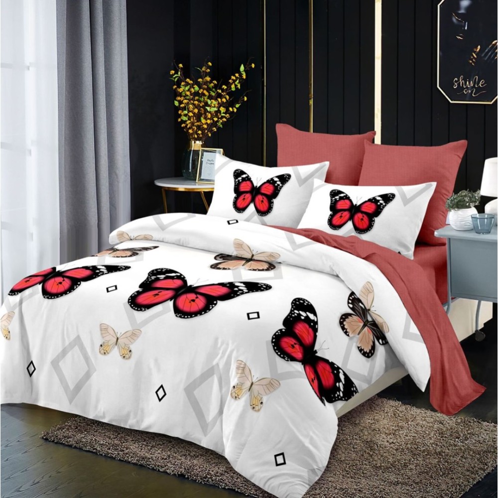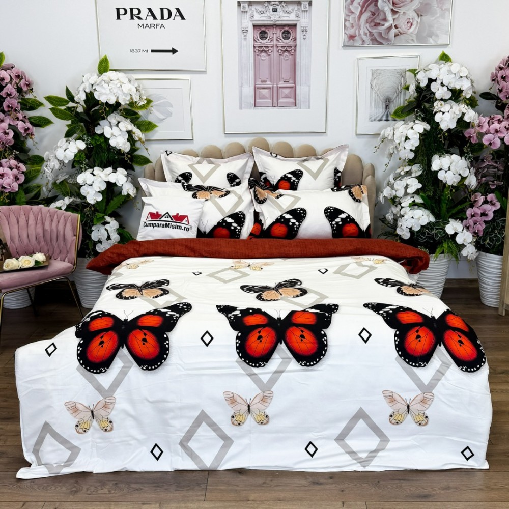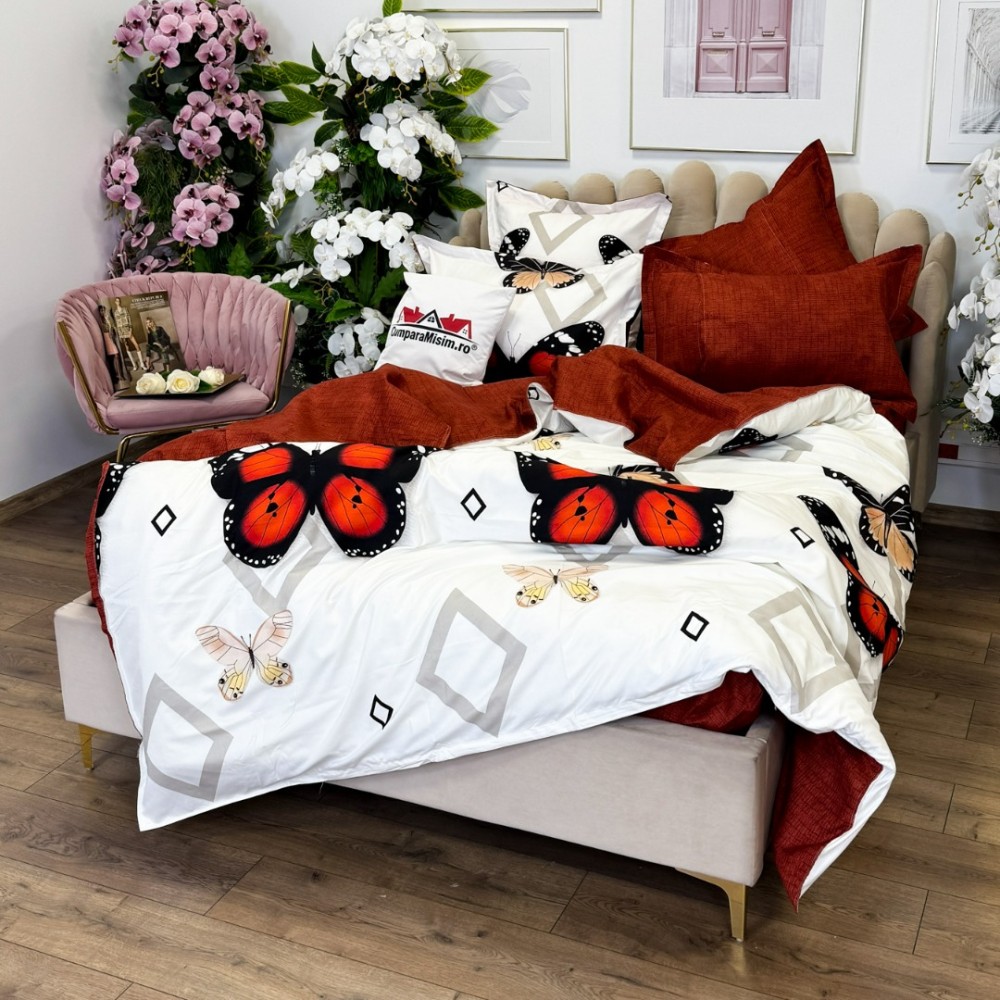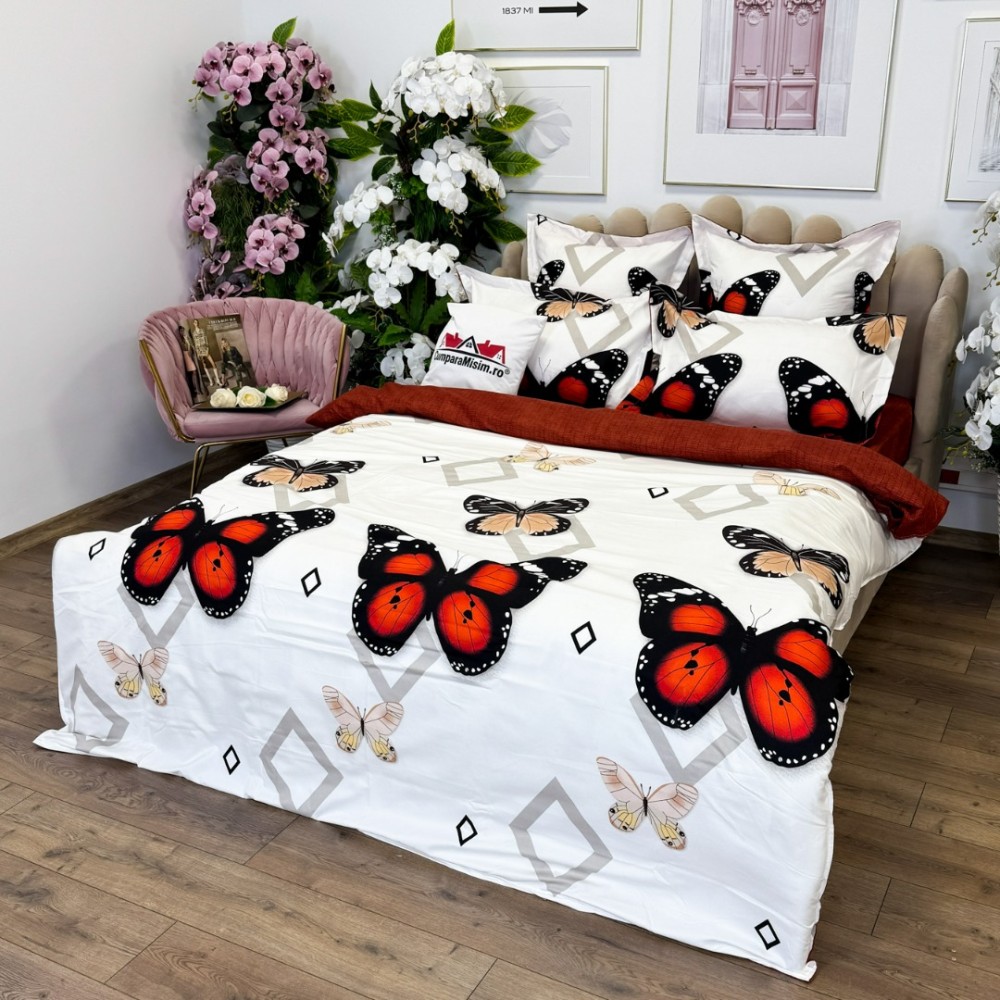 Lenjerie pat dublu, FINET, cu elastic, 6 piese, Rosu, fluturi, forme geometrice, Primavara Casa, cod produs: PRM-FE-B935