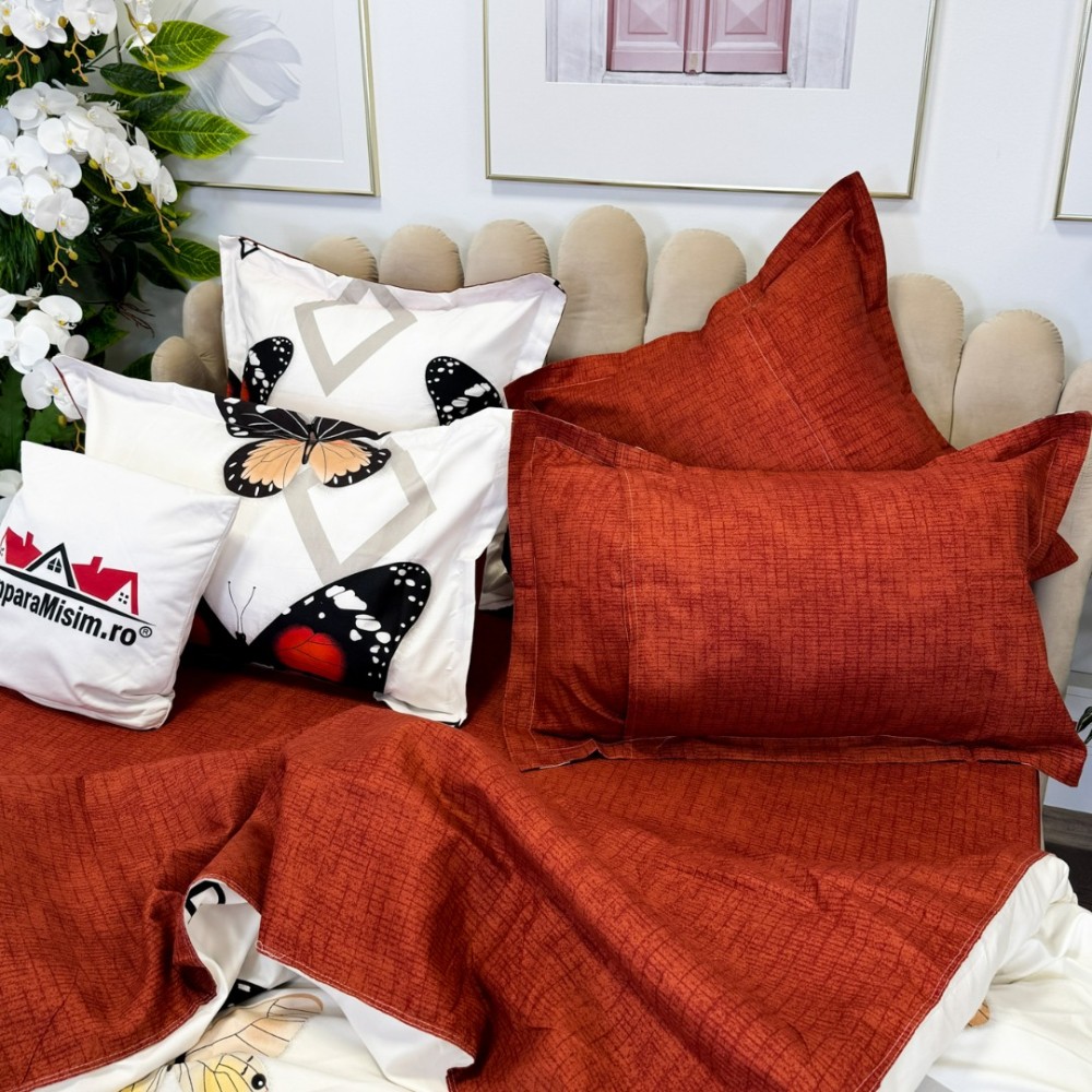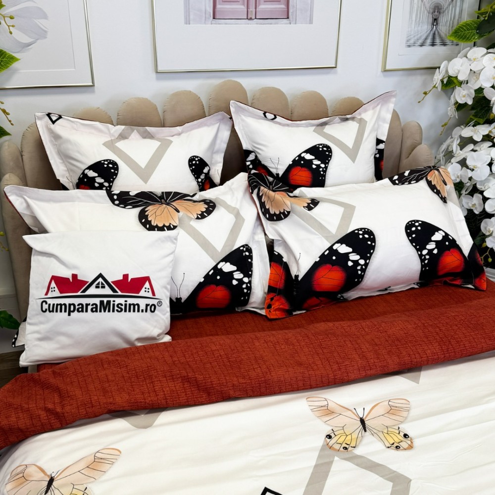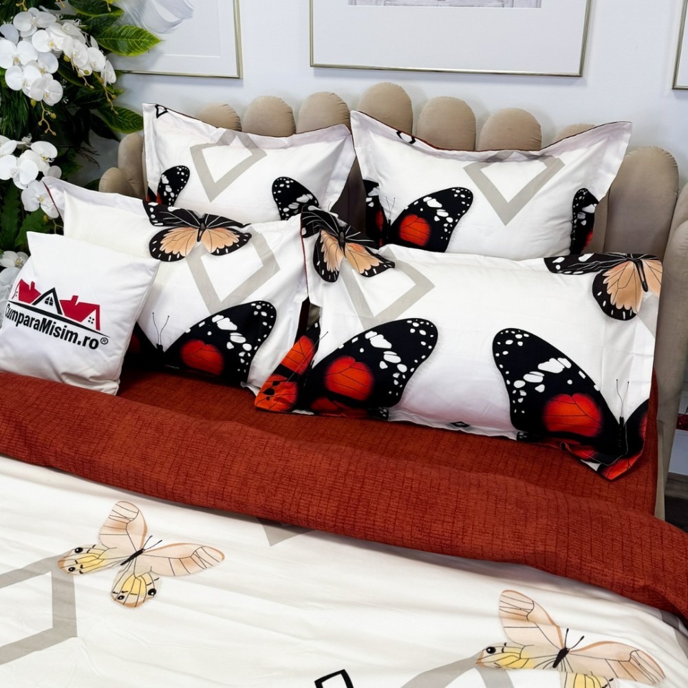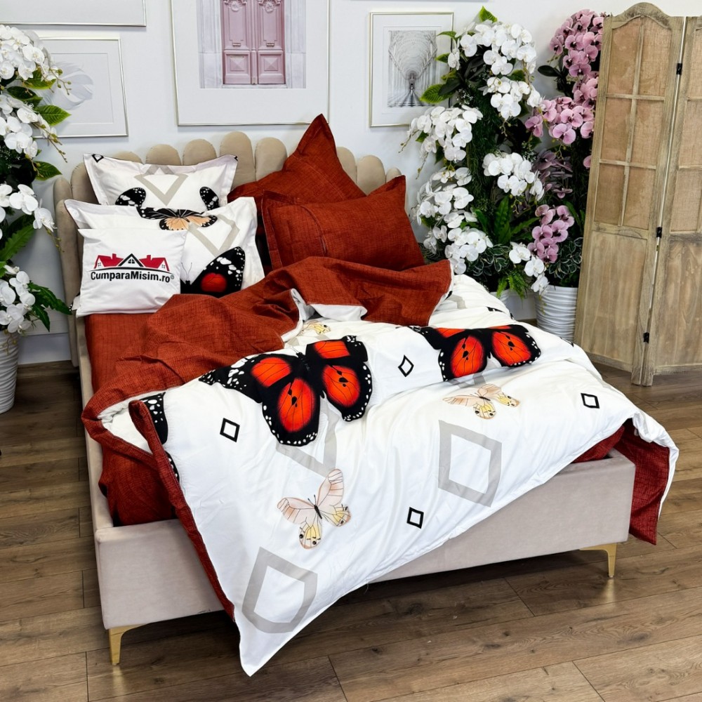 Lenjerie pat dublu, FINET, cu elastic, 6 piese, Rosu, fluturi, forme geometrice, Primavara Casa, cod produs: PRM-FE-B935