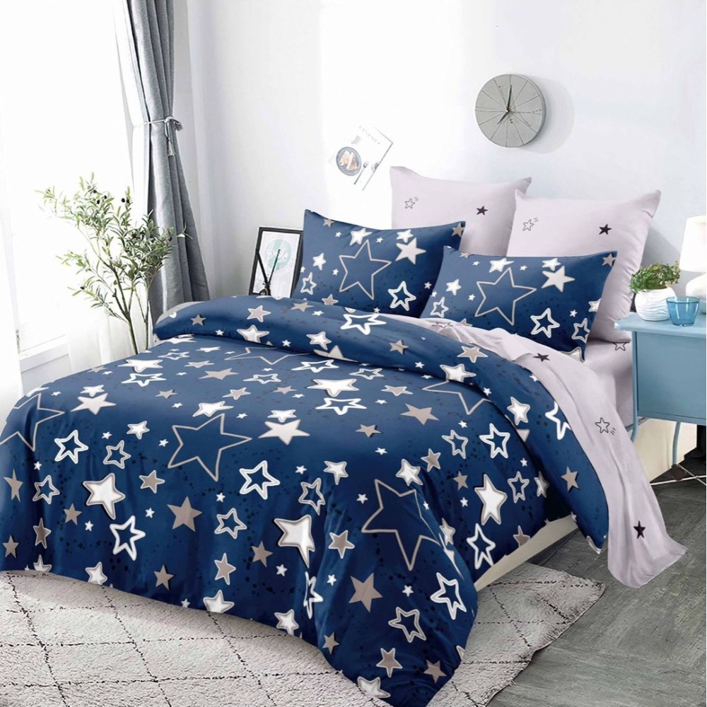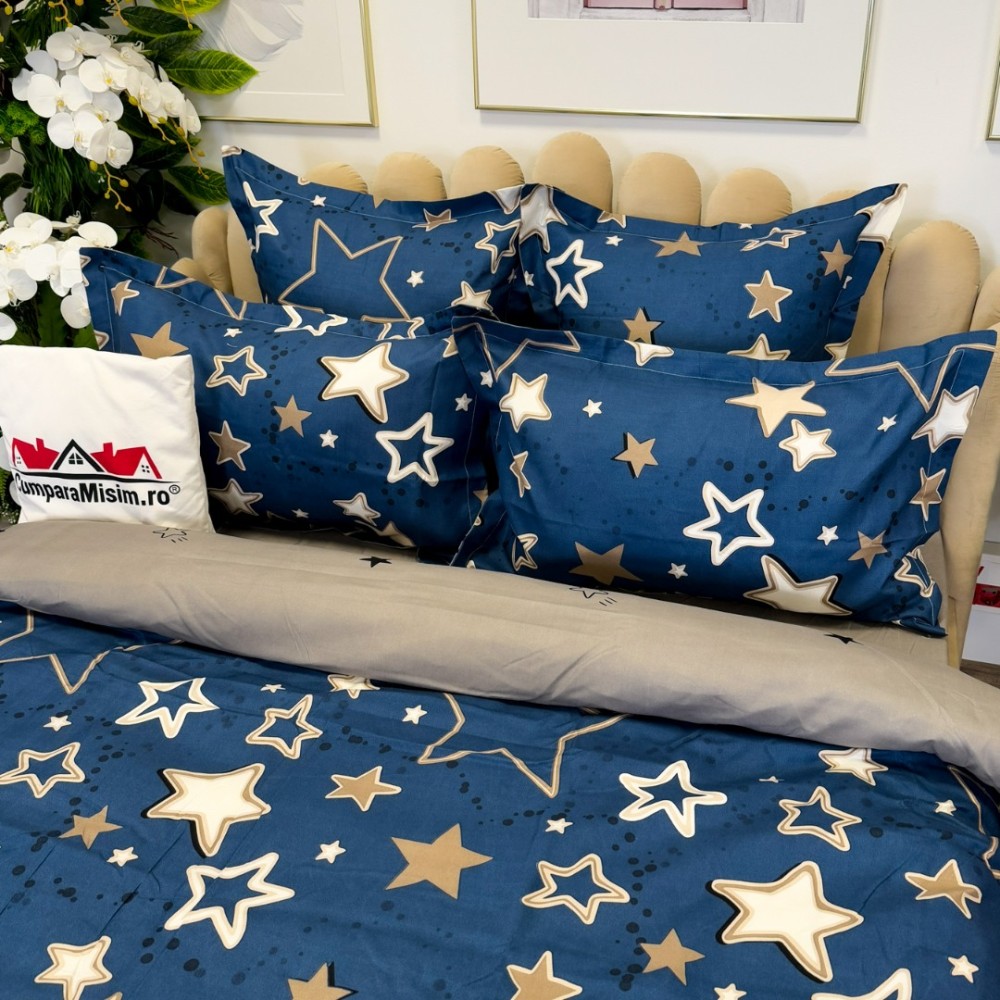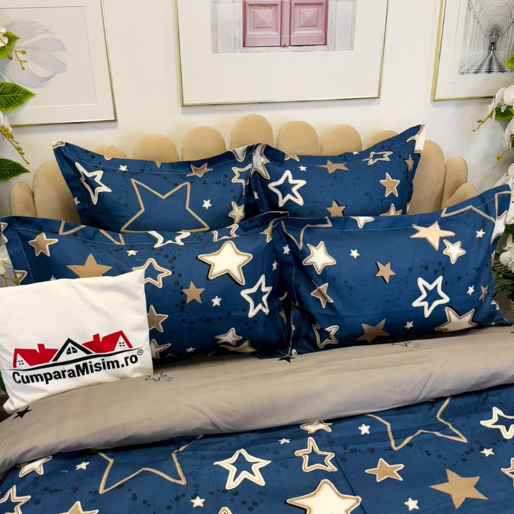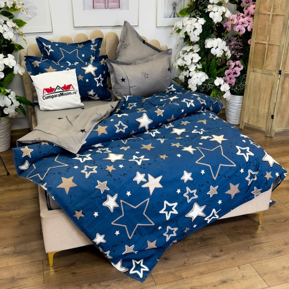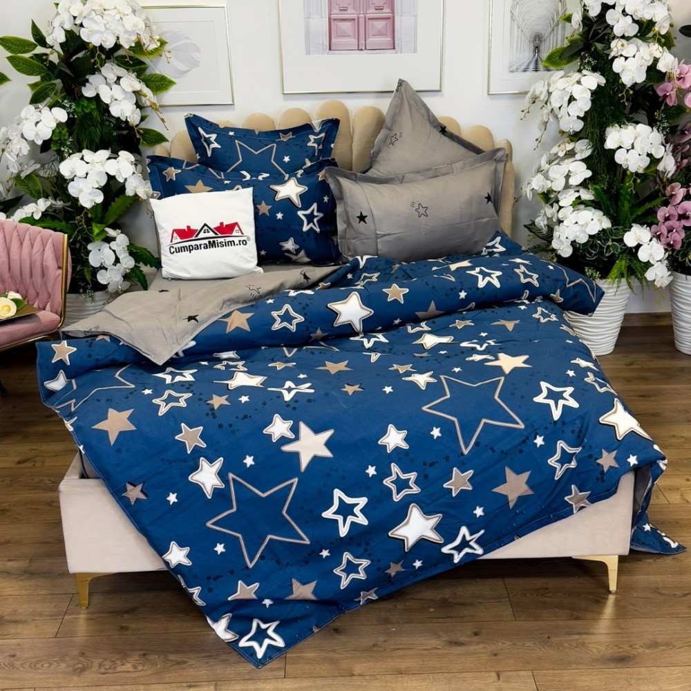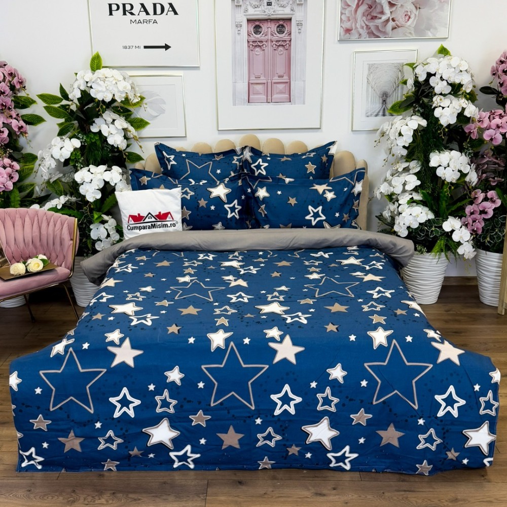 Lenjerie pat dublu, FINET, cu elastic, 6 piese, Albastru, stelute, Primavara Casa, cod produs: PRM-FE-B952
