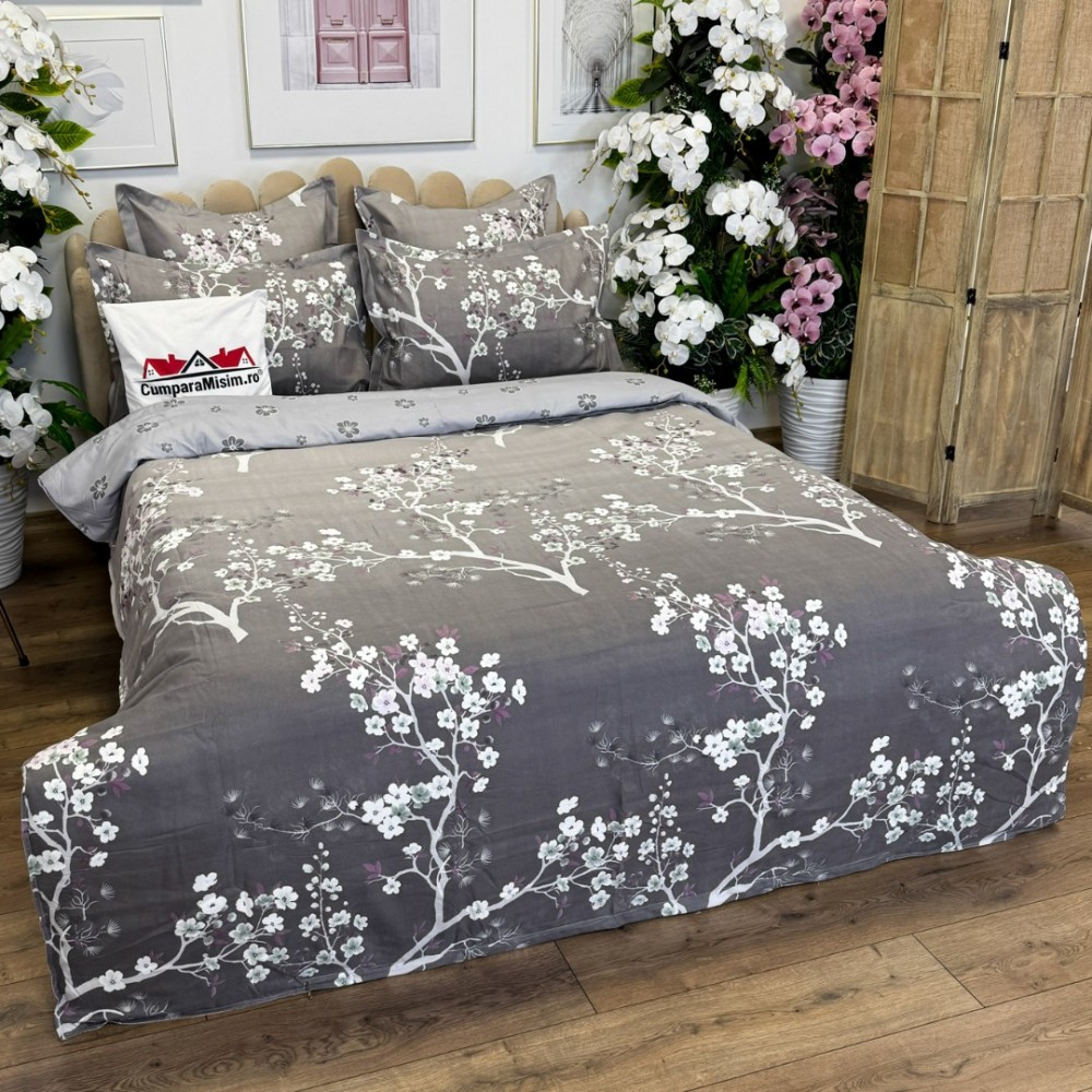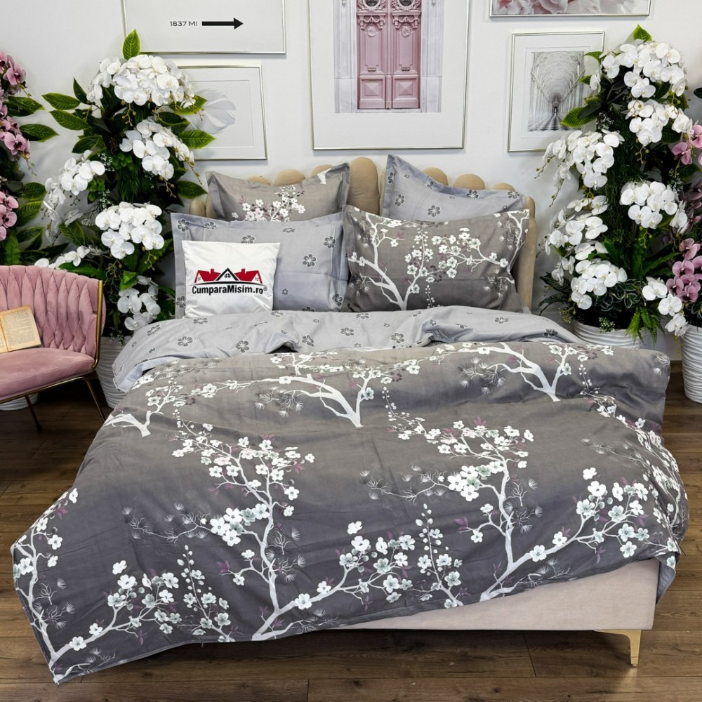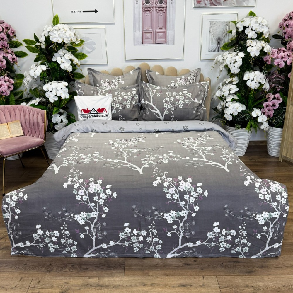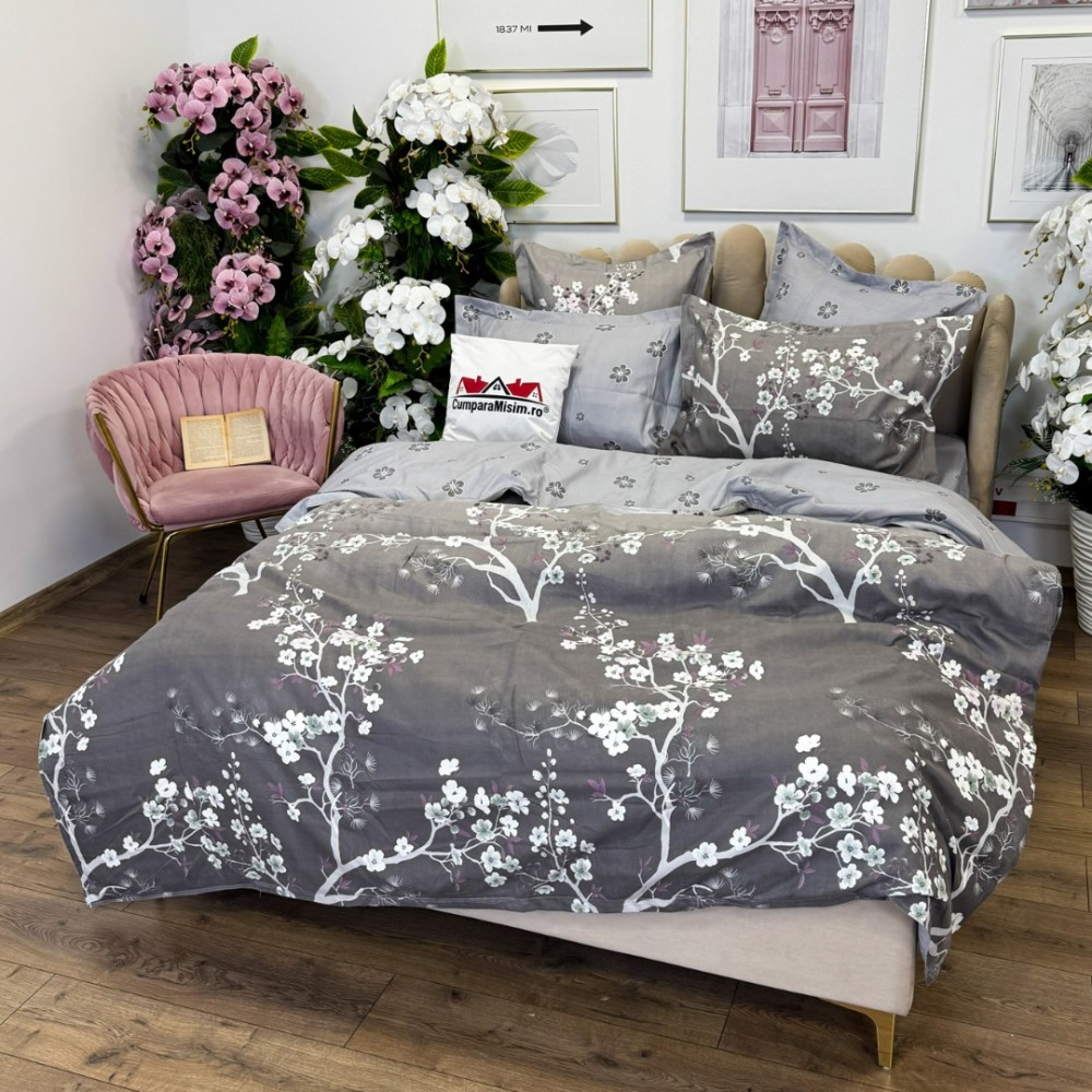Lenjerie pat dublu, FINET, cu elastic, 6 piese, Gri, flori, Primavara Casa, cod produs: PRM-FE-B954