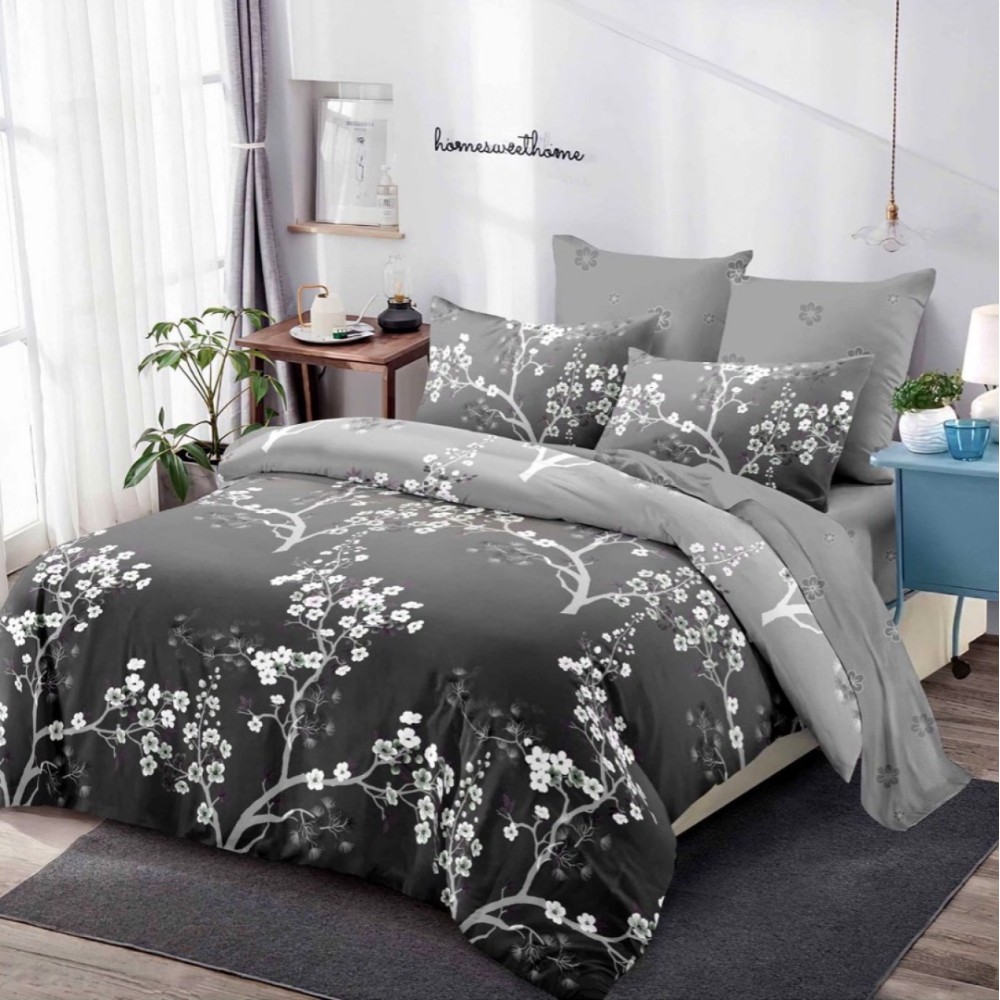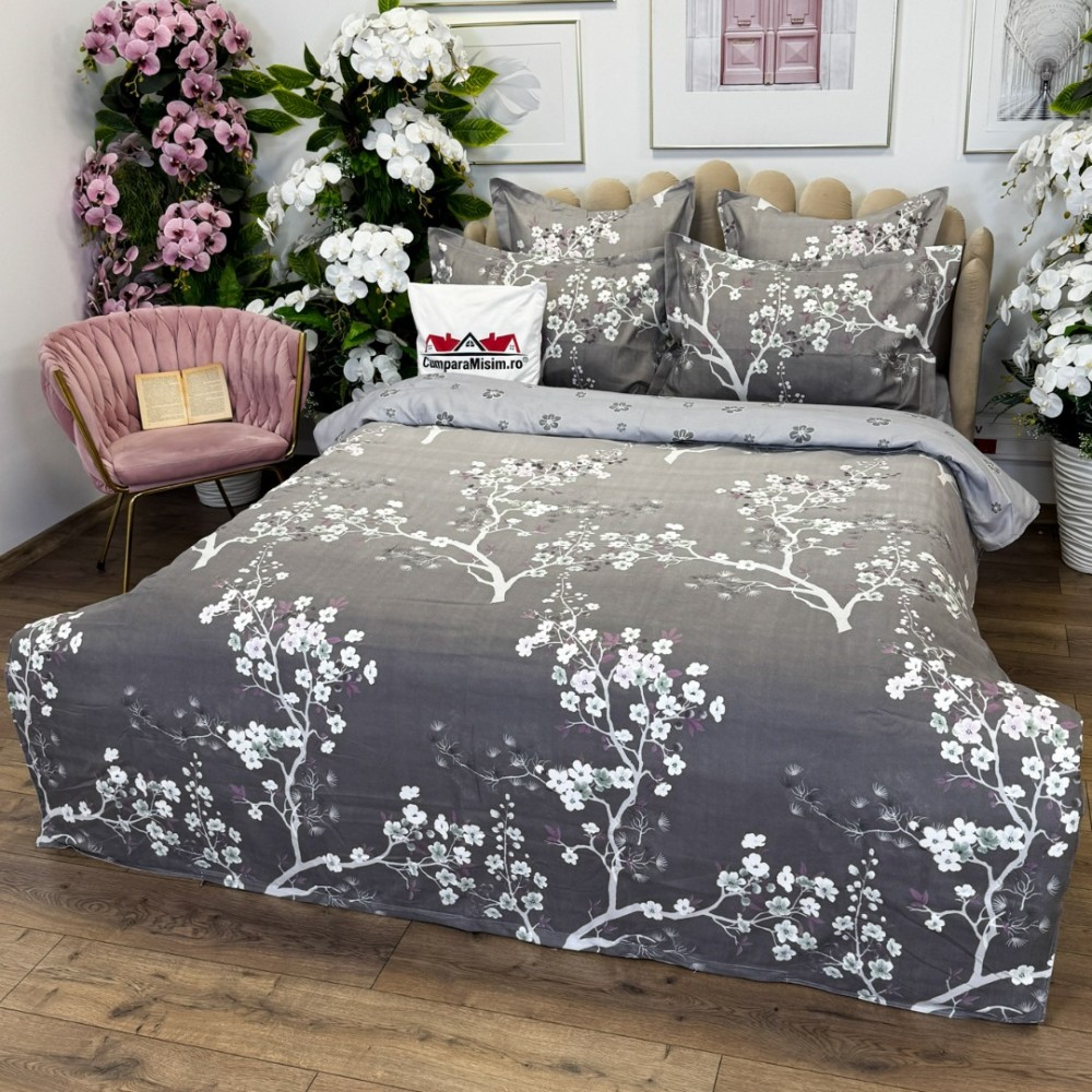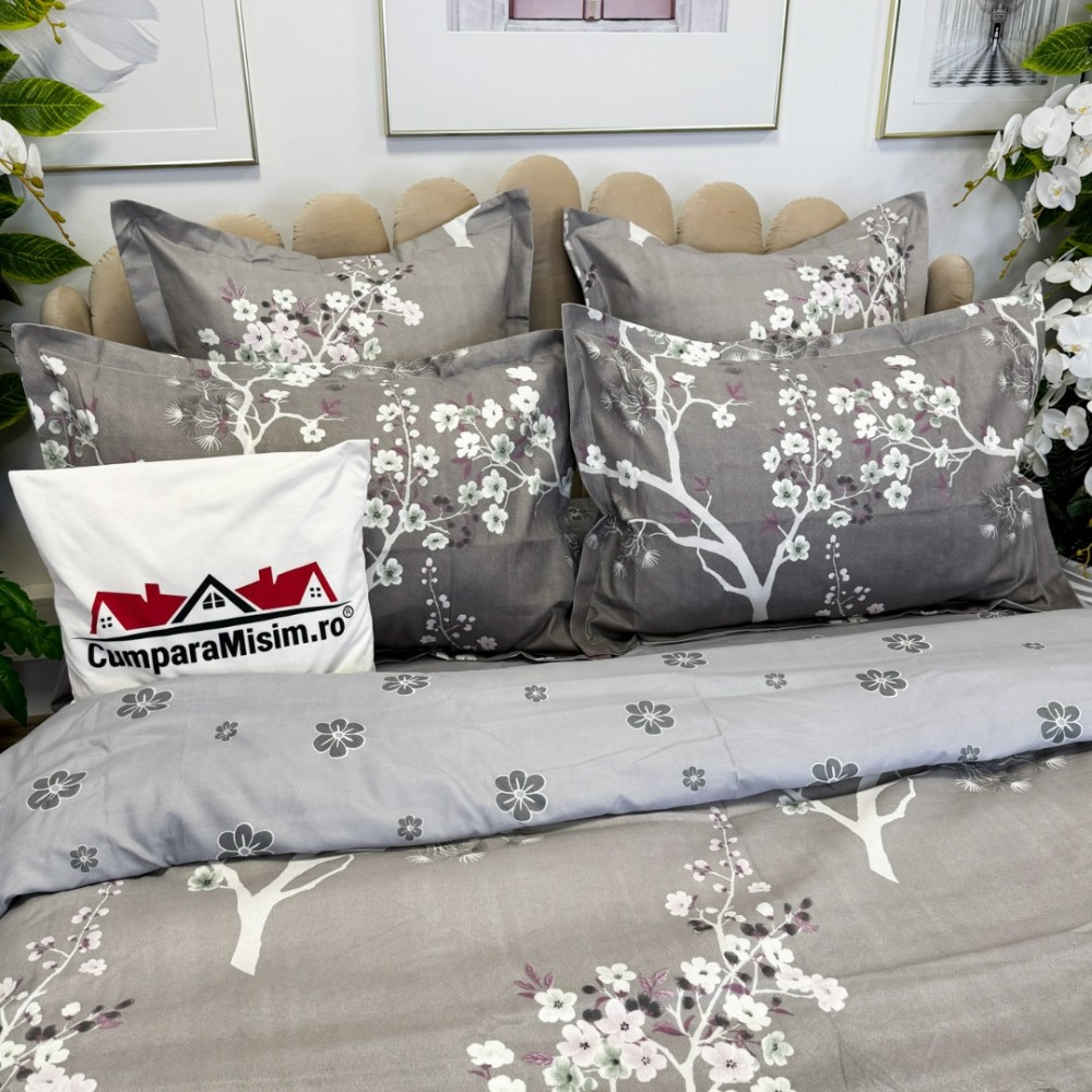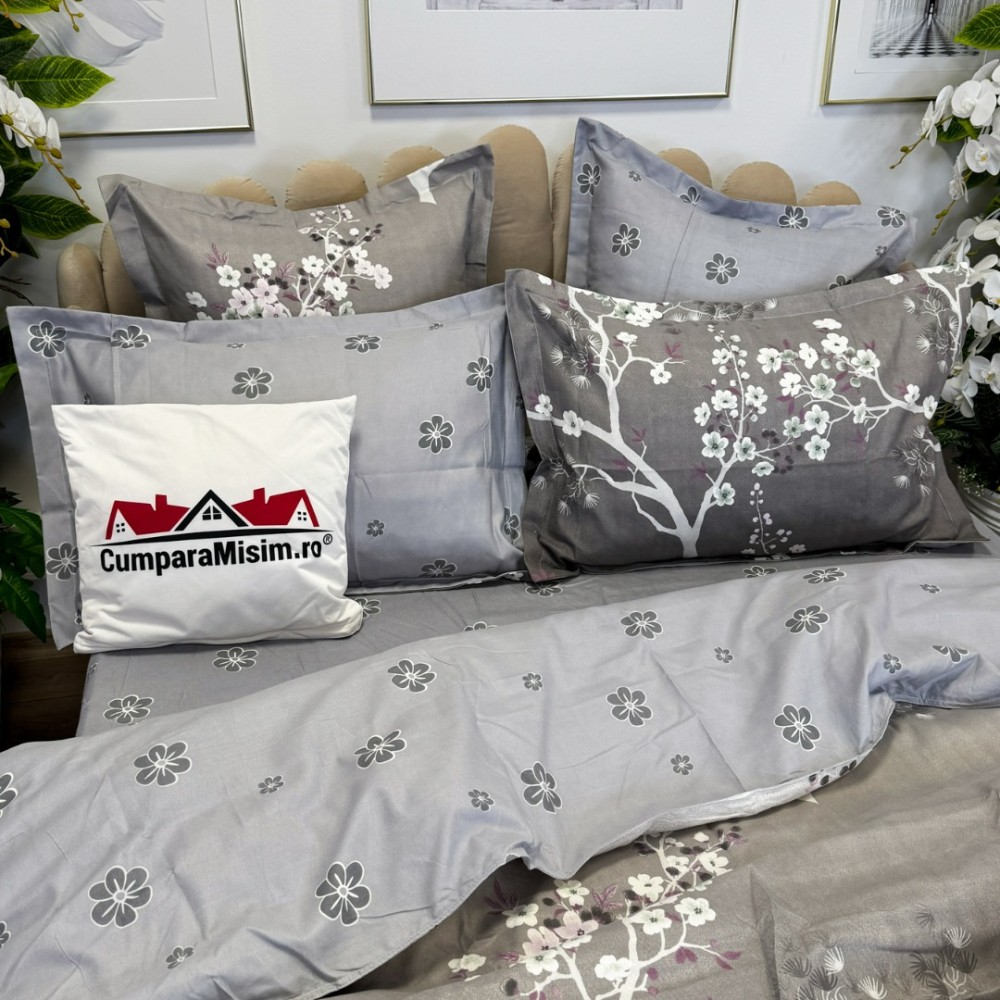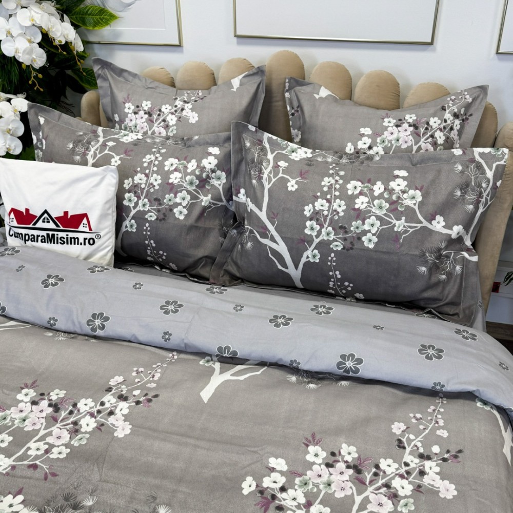 Lenjerie pat dublu, FINET, cu elastic, 6 piese, Gri, flori, Primavara Casa, cod produs: PRM-FE-B954