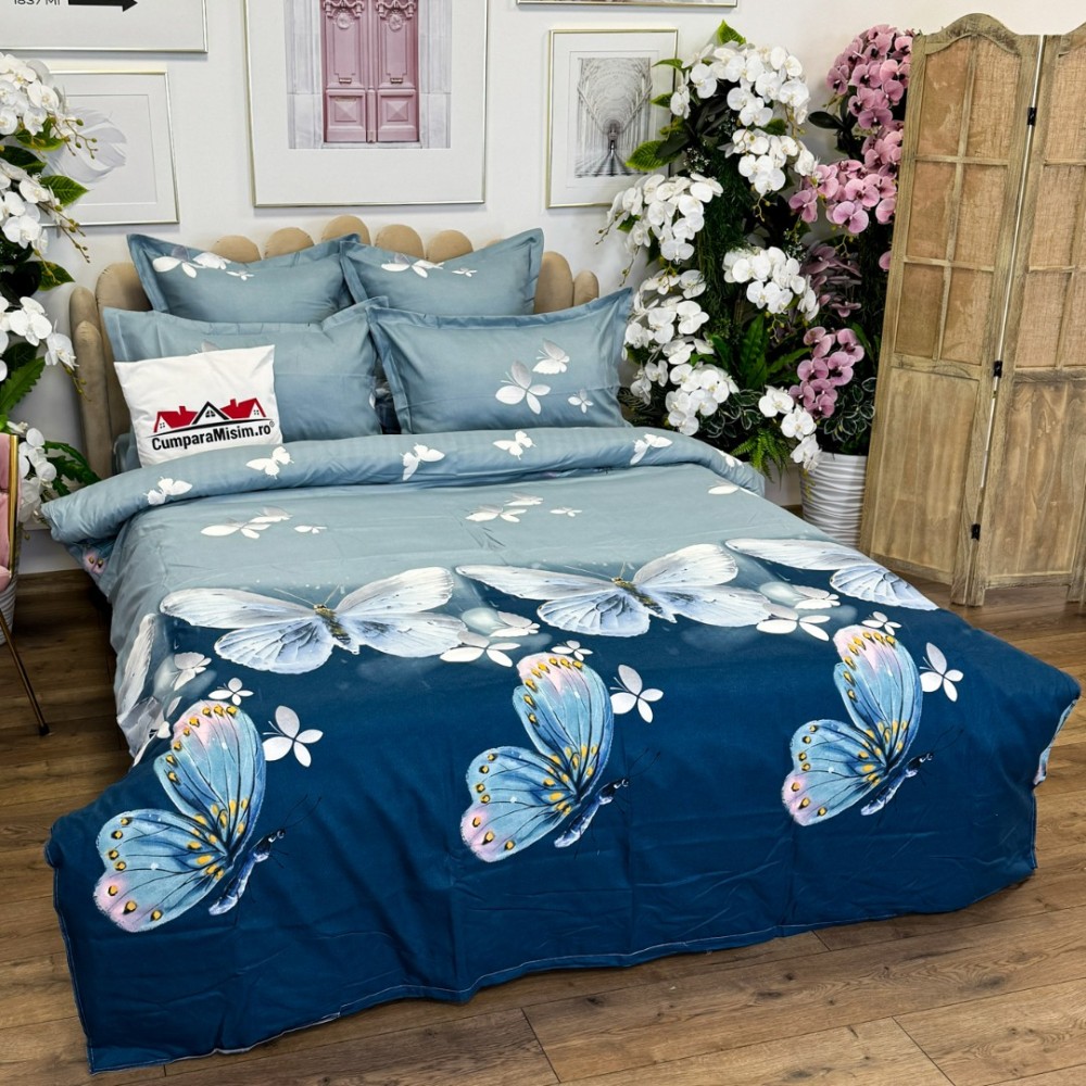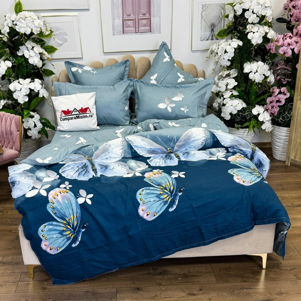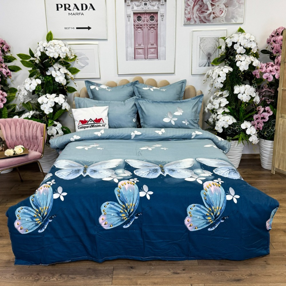 Lenjerie pat dublu, FINET, cu elastic, 6 piese, Albastru. fluturi, Primavara Casa, cod produs: PRM-FE-B979