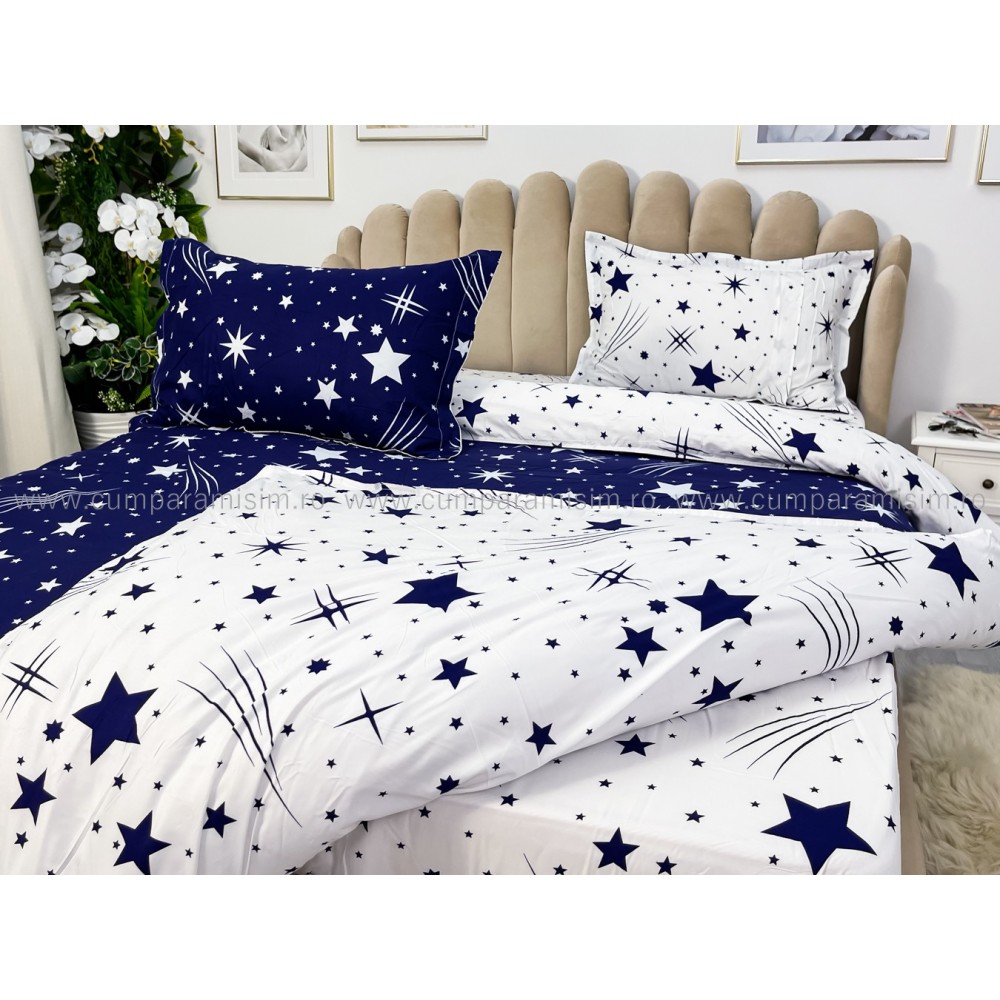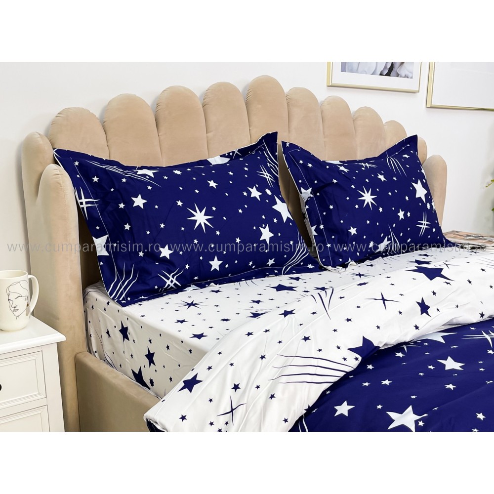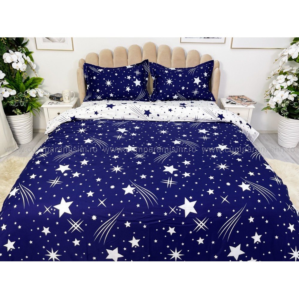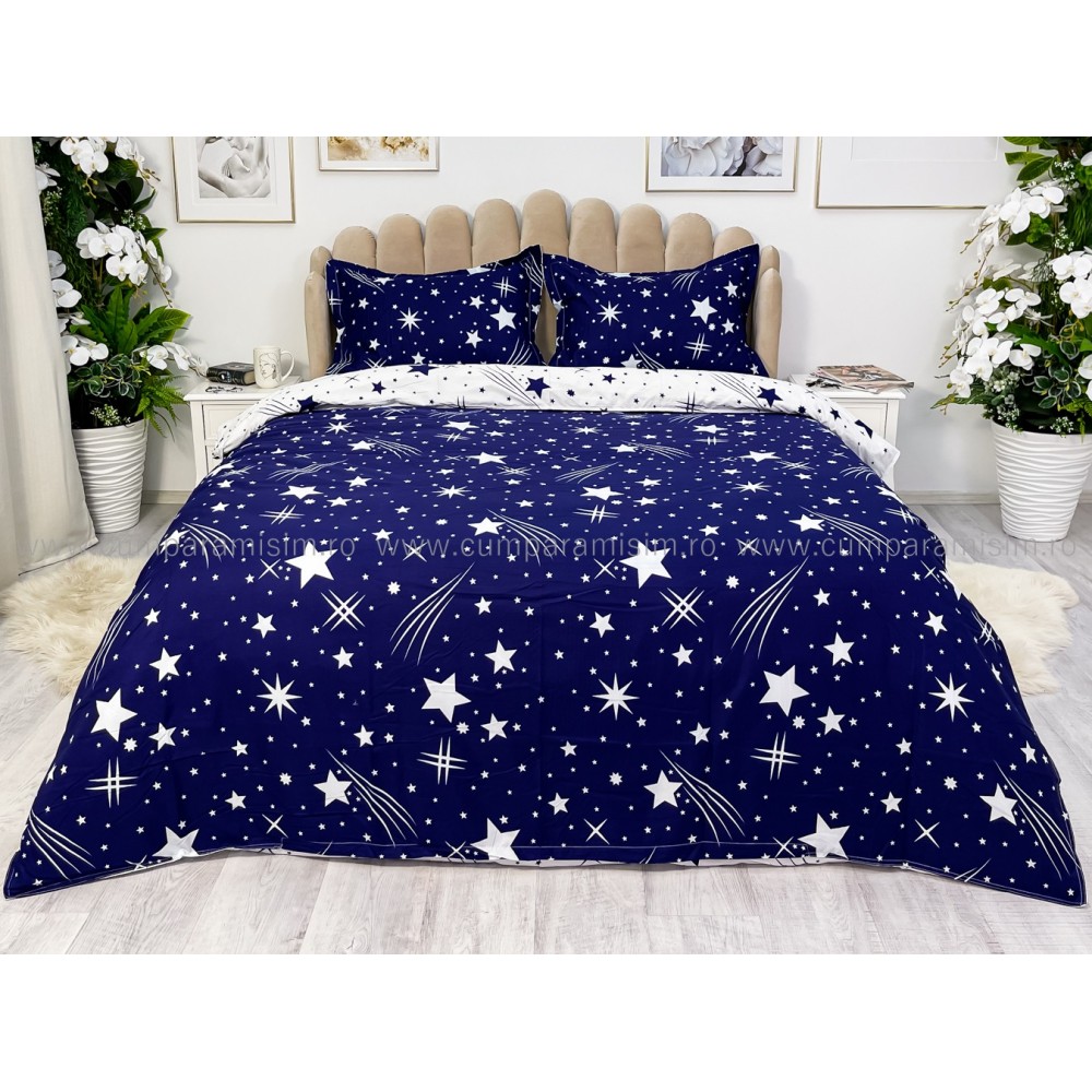 Lenjerie pat dublu cu doua feţe, bumbac satinat, 4 piese, Albastru, stelute, Johny Home Pucioasa, cod produs: SPR-A50-241