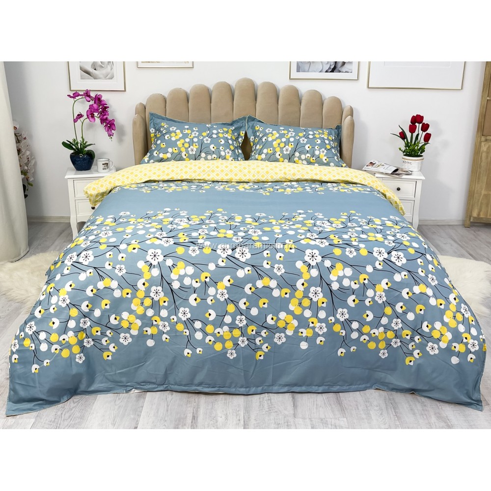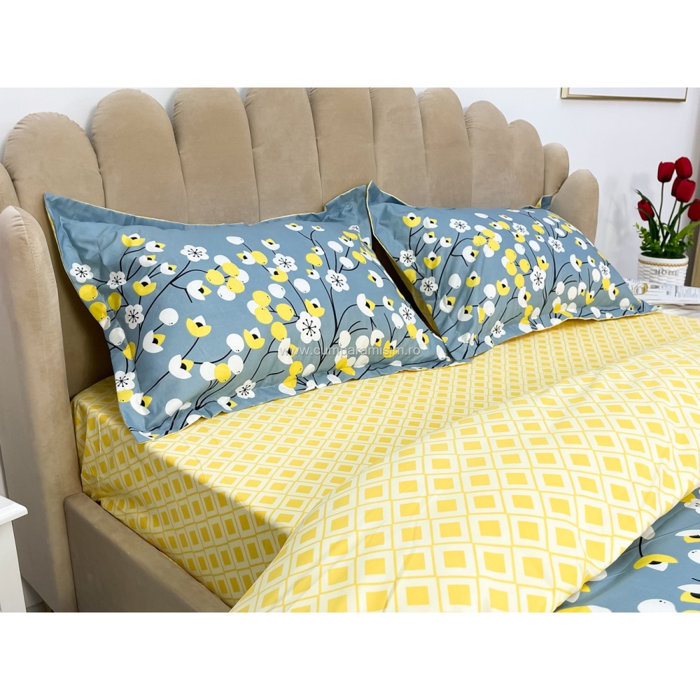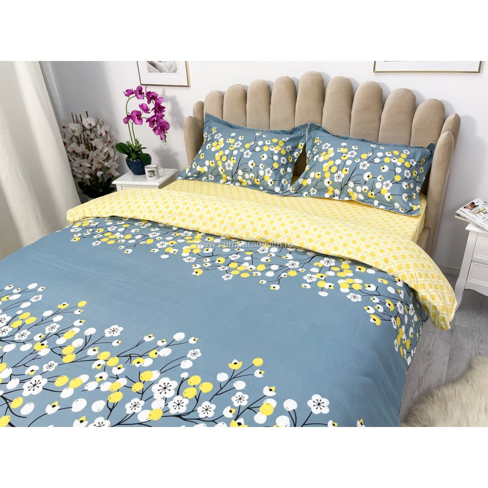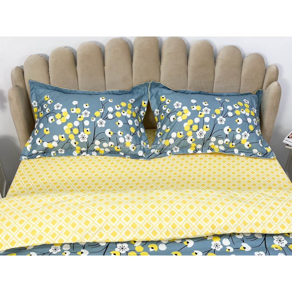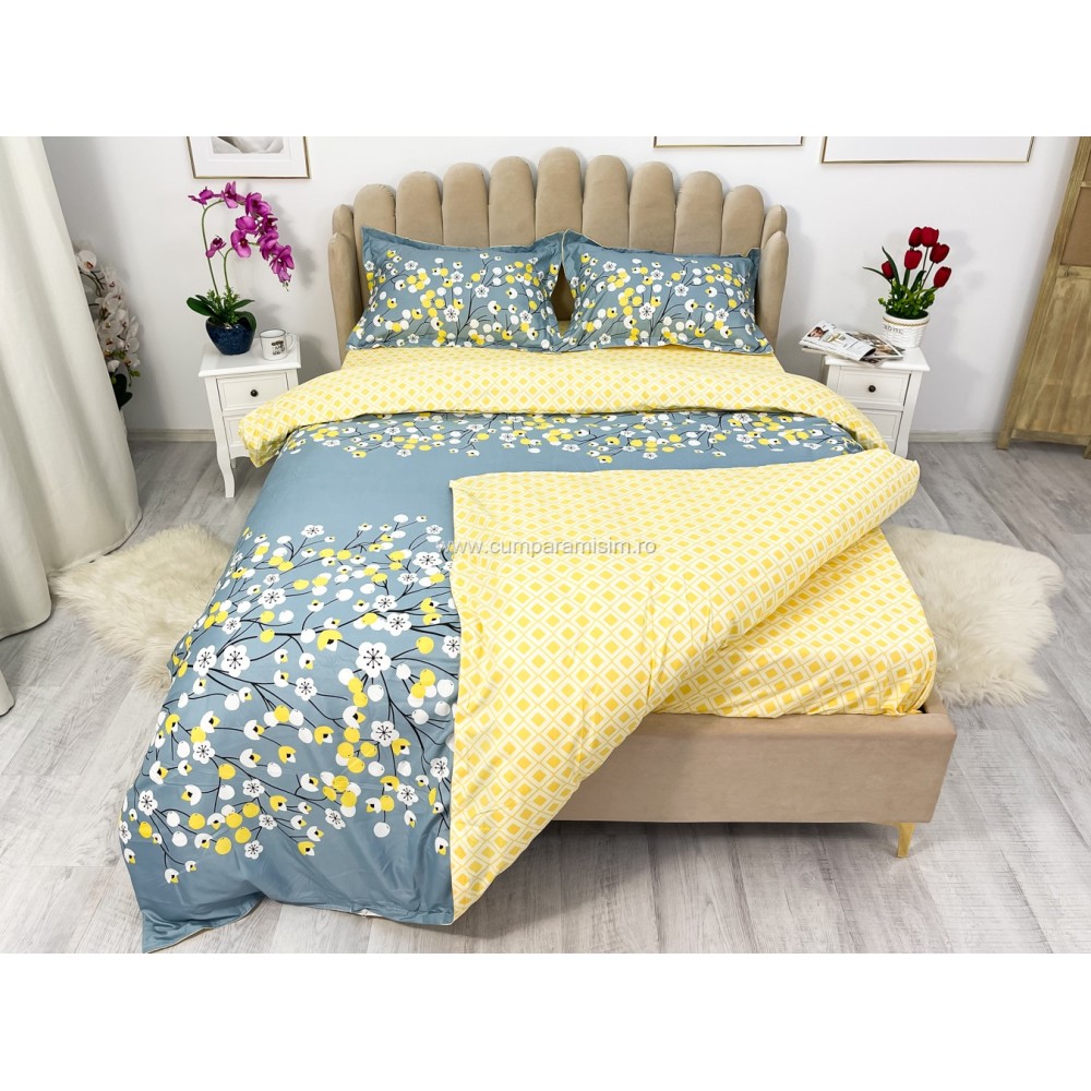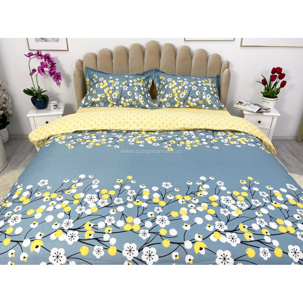 Lenjerie pat dublu cu doua feţe, bumbac satinat, 4 piese, Albastru, floricele, Johny Home Pucioasa, cod produs: SPR-A50-437