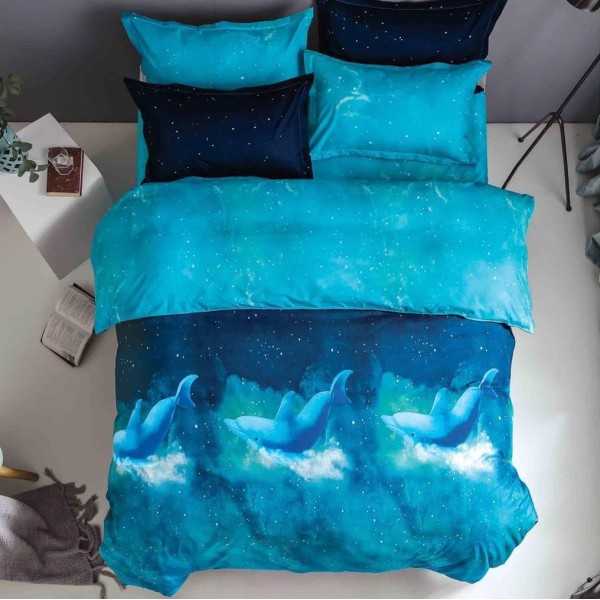 Lenjerie pat dublu cu doua feţe, bumbac satinat, 4 piese, Albastru, delfini, Johny Home Pucioasa, cod produs: SPR-A50-562