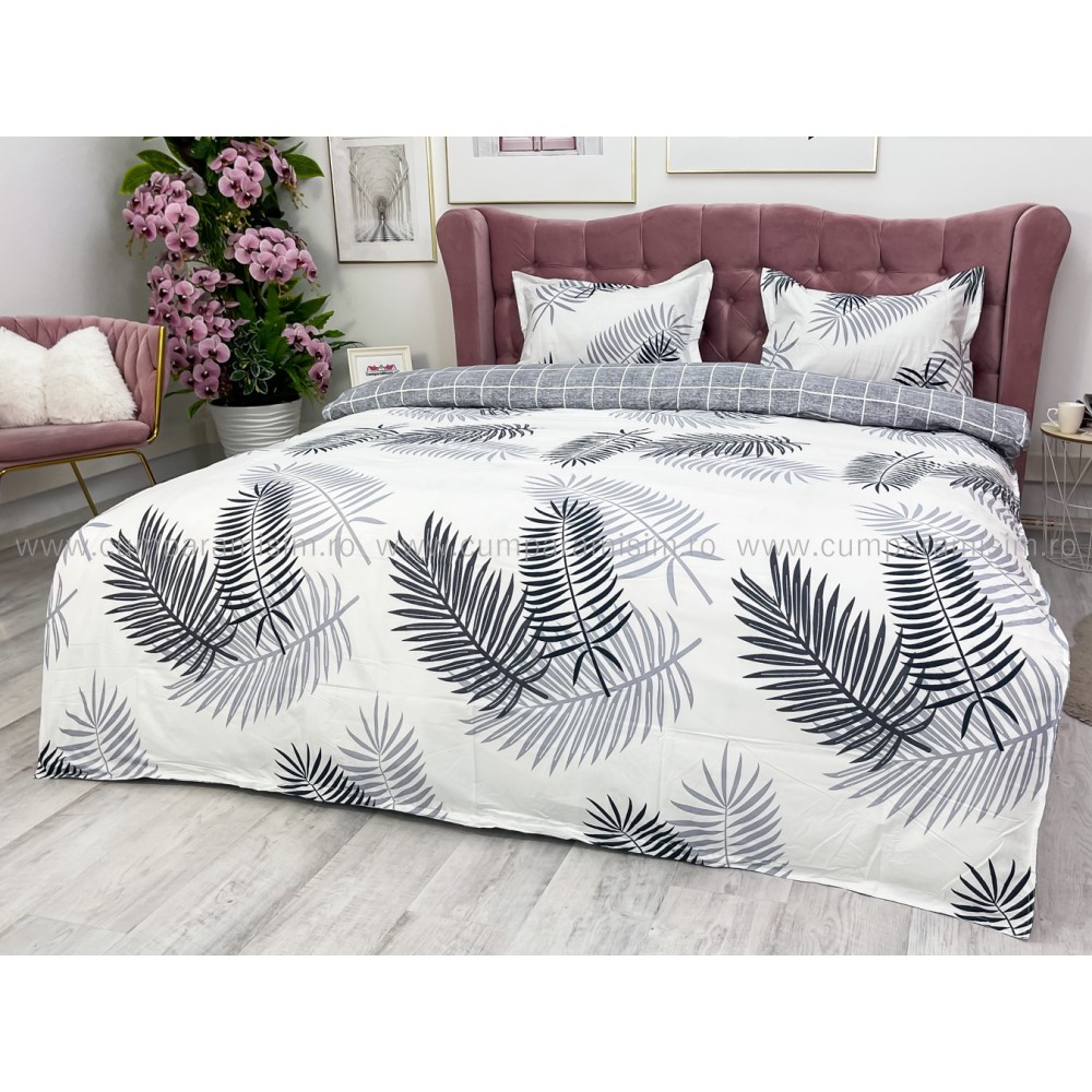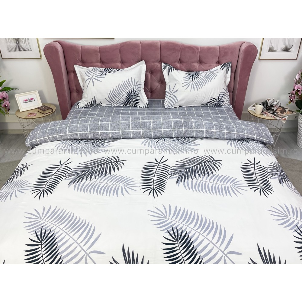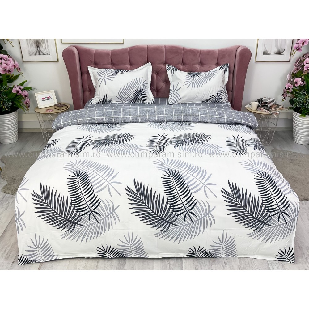 Lenjerie pat dublu cu doua feţe, bumbac satinat, 4 piese, Gri, frunze, Johny Home Pucioasa, cod produs: SPR-A50-592
