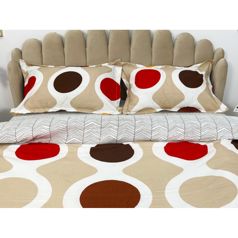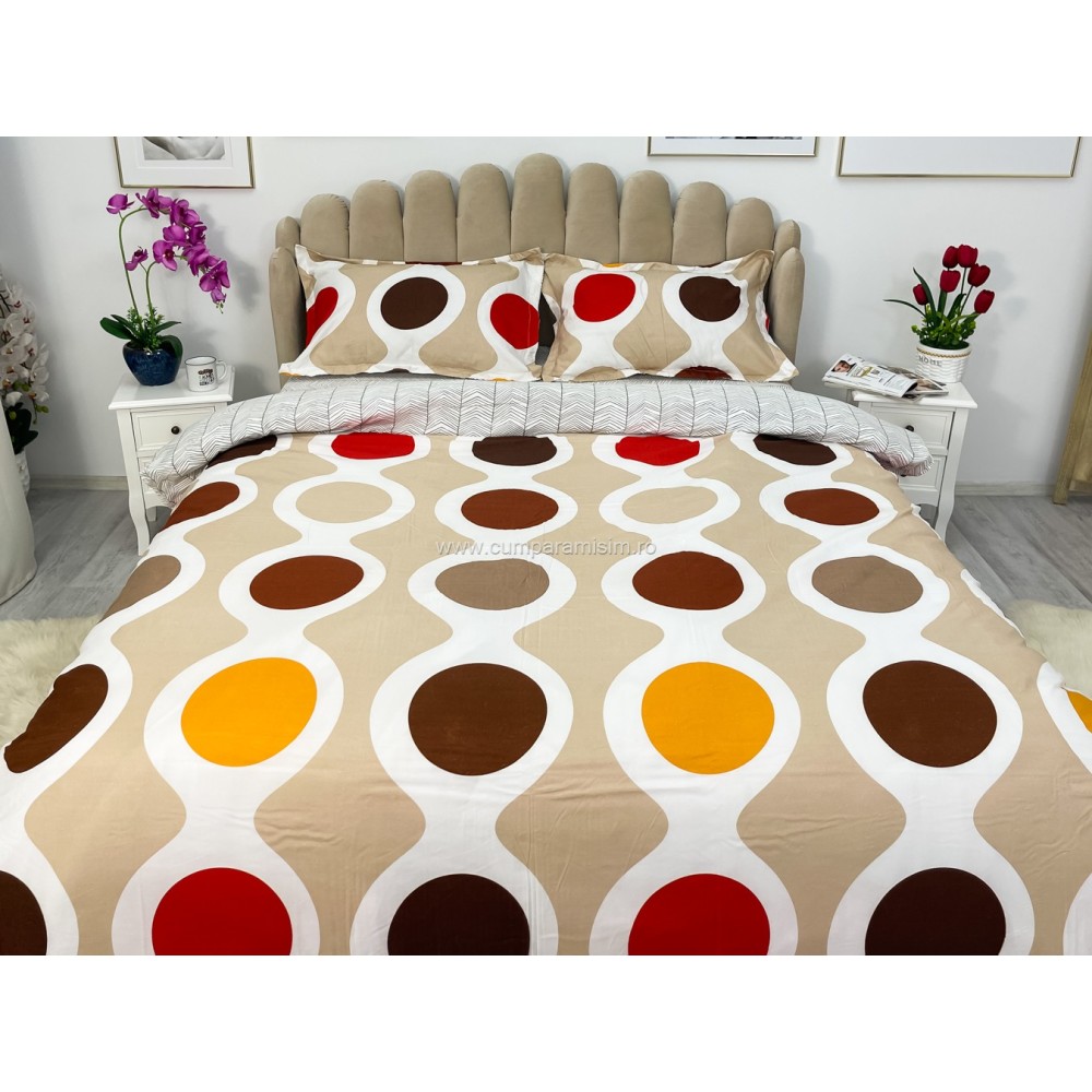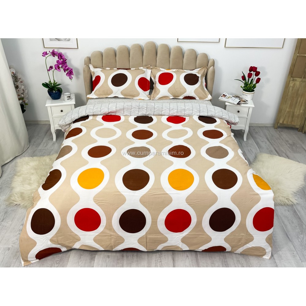 Lenjerie pat dublu cu doua feţe, bumbac satinat, 4 piese, Maro, cercuri, Johny Home Pucioasa, cod produs: SPR-A50-556