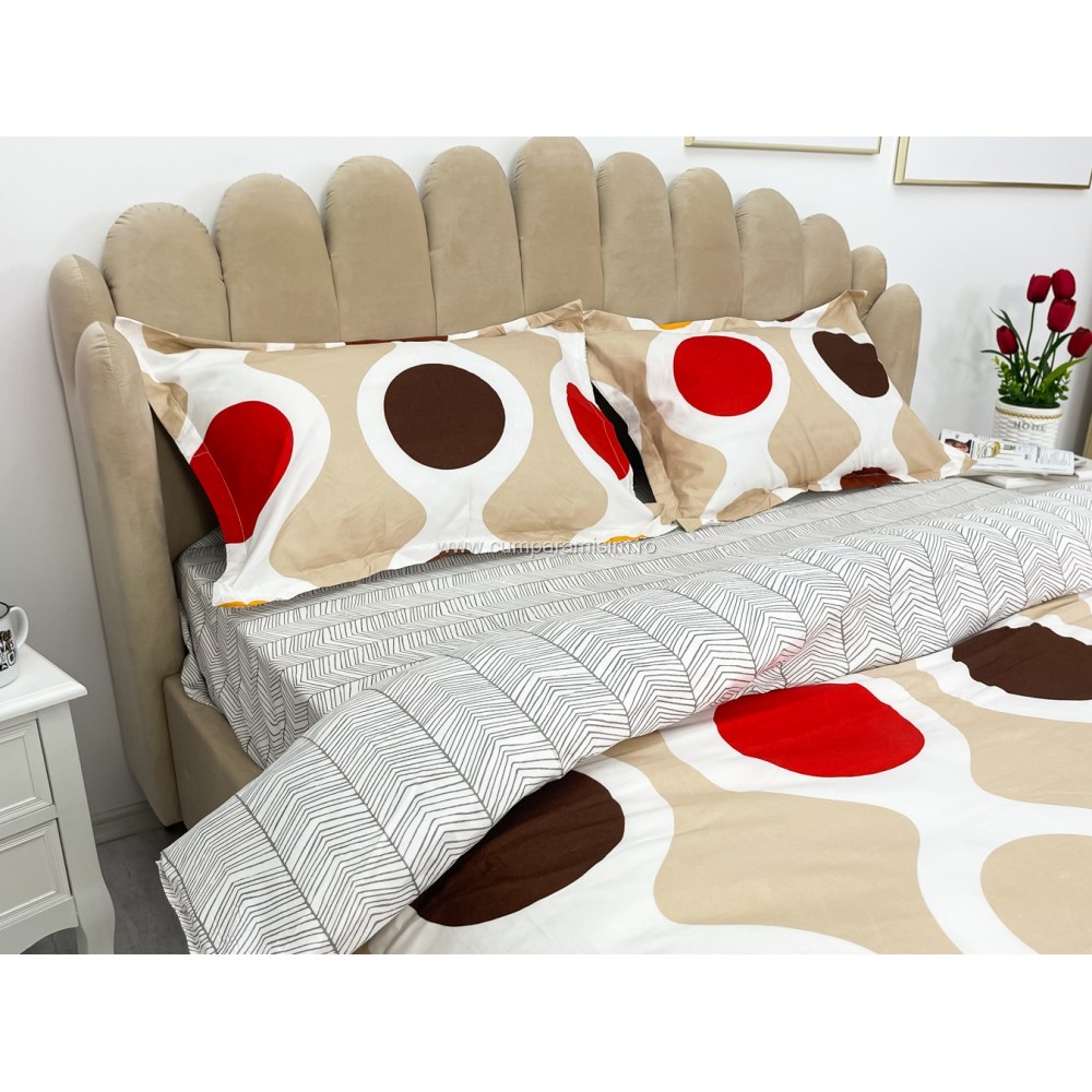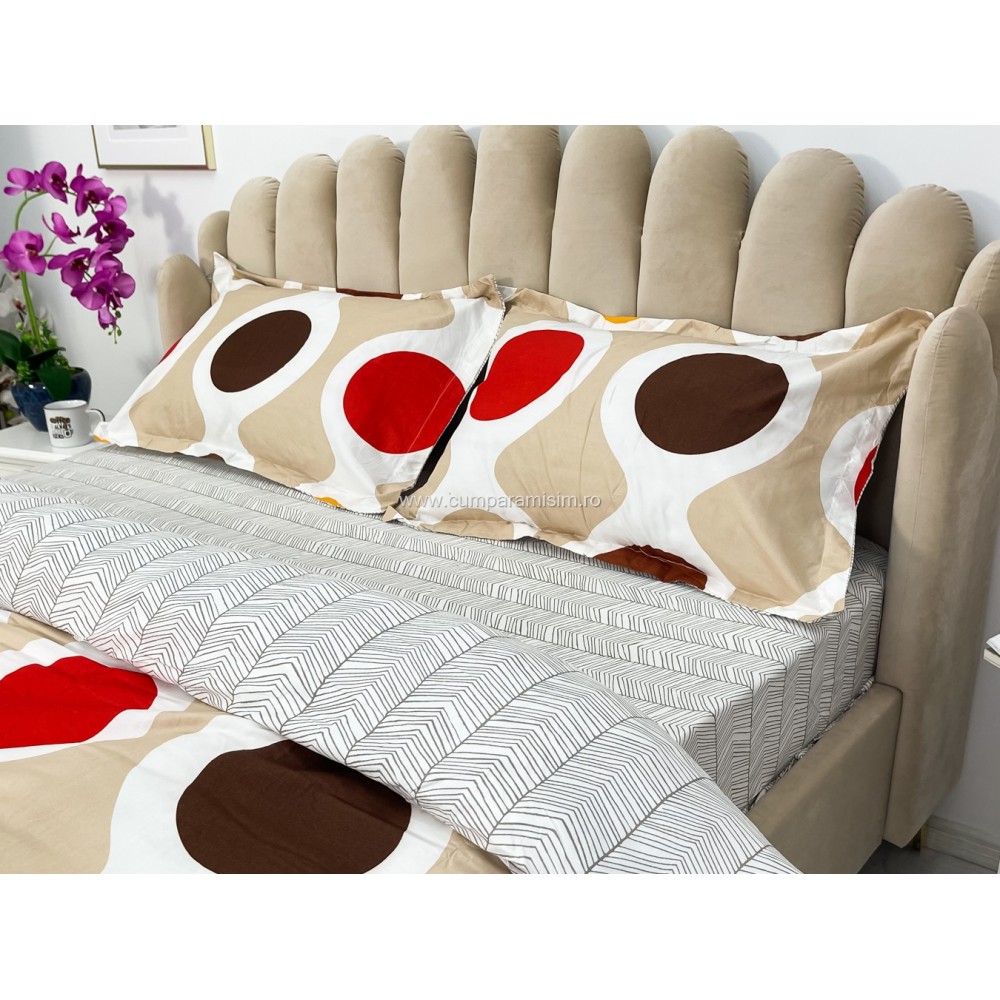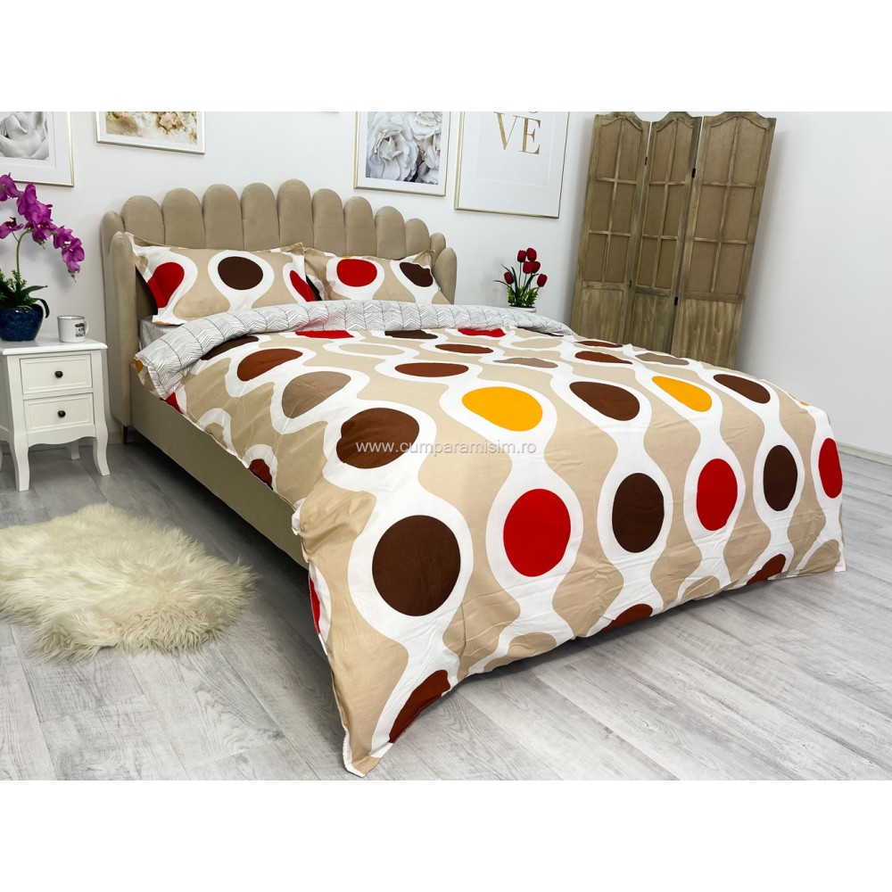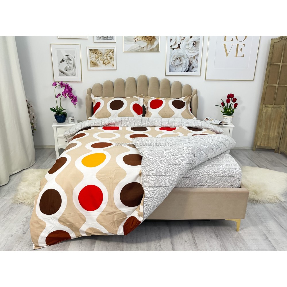 Lenjerie pat dublu cu doua feţe, bumbac satinat, 4 piese, Maro, cercuri, Johny Home Pucioasa, cod produs: SPR-A50-556