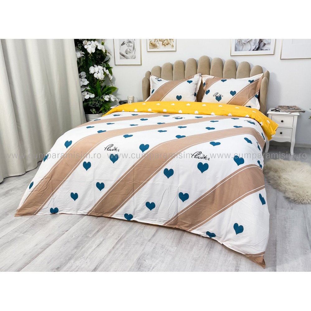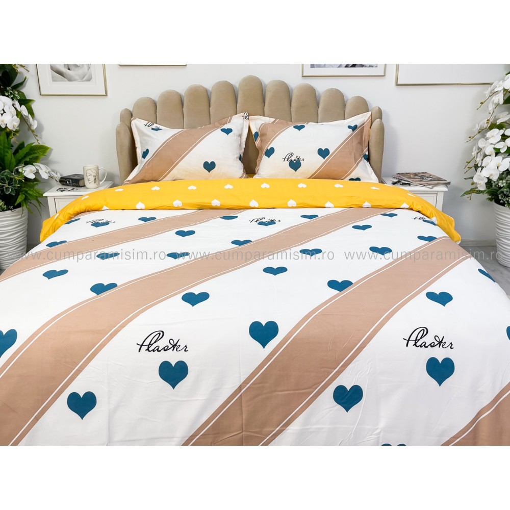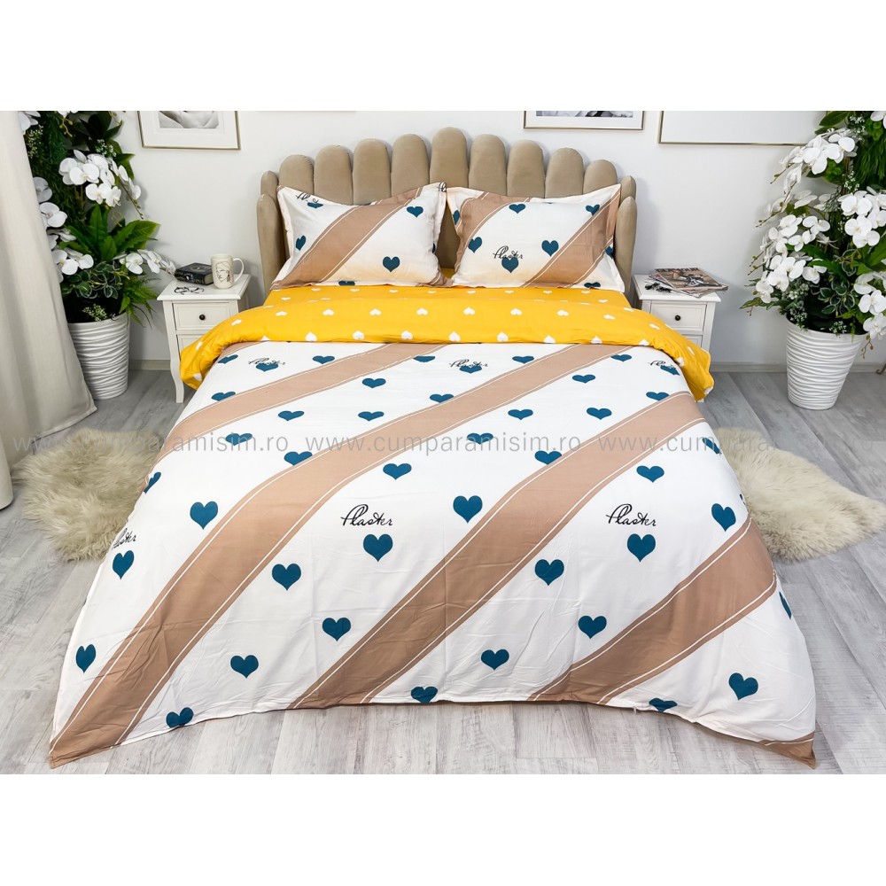 Lenjerie pat dublu cu doua feţe, bumbac satinat, 4 piese, Alb-Bej, inimioare, Johny Home Pucioasa, cod produs: SPR-A50-583