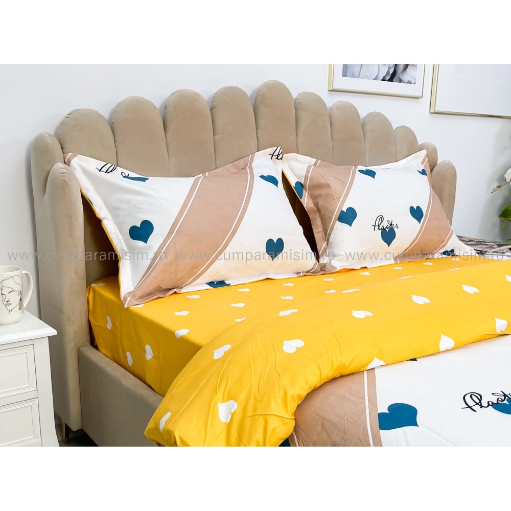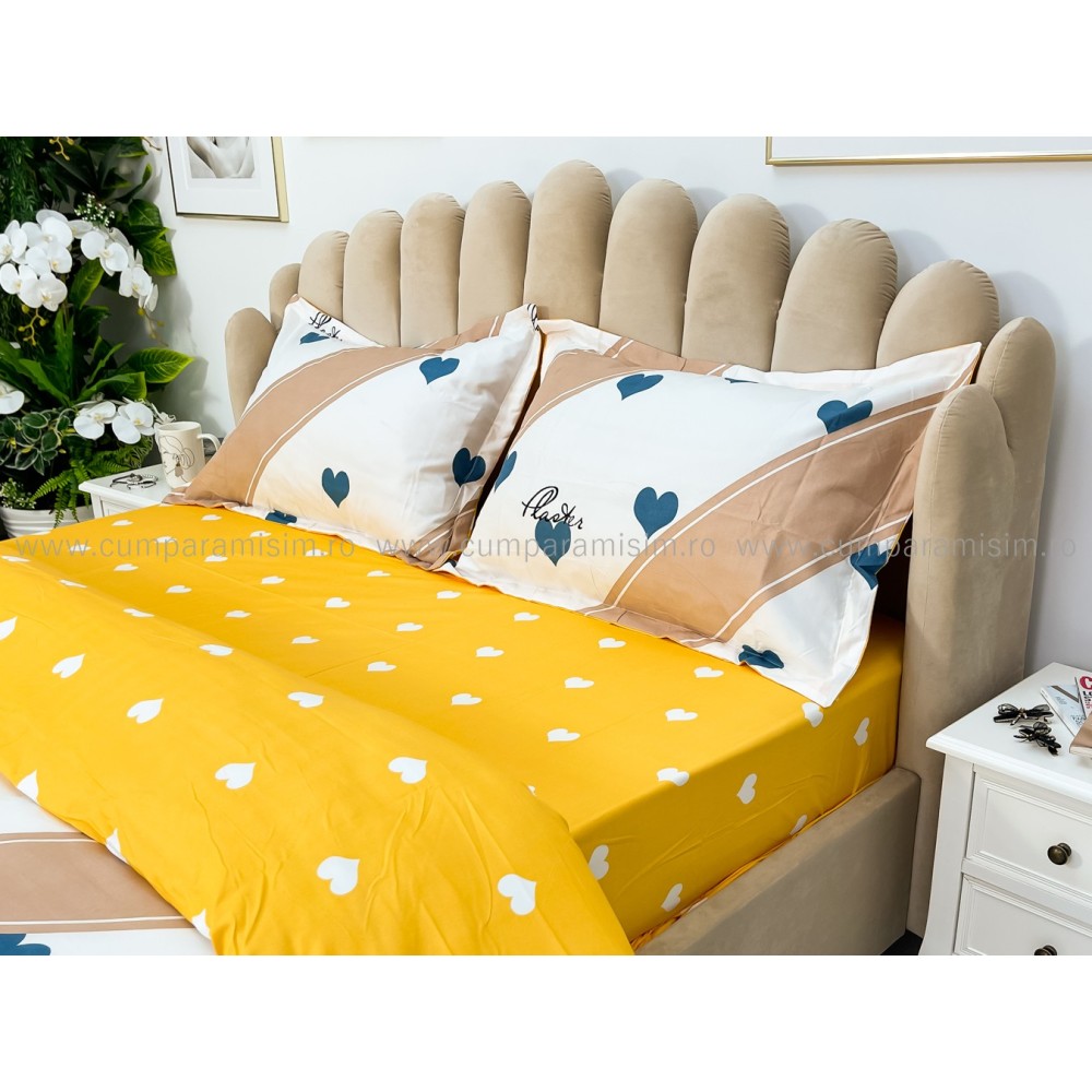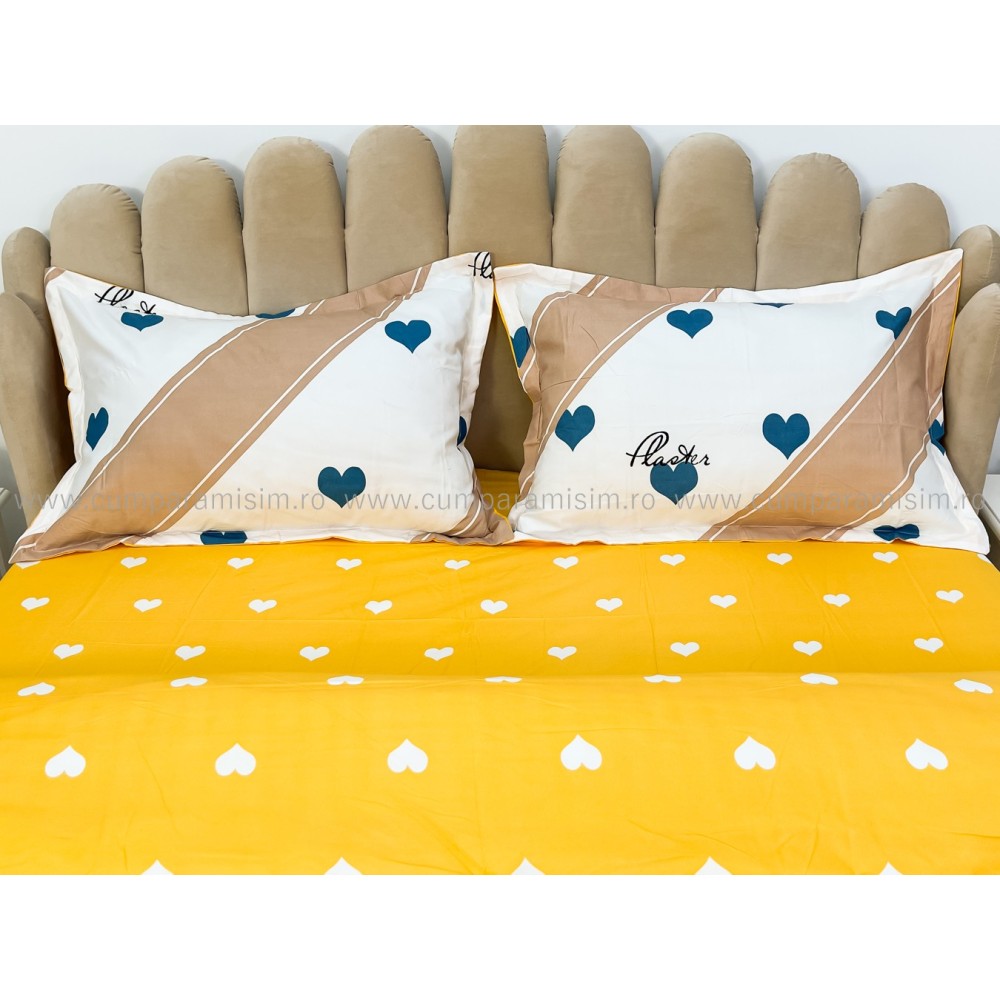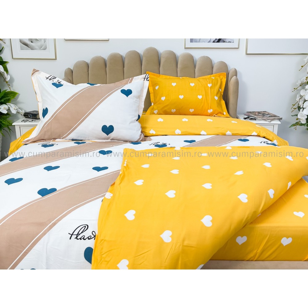 Lenjerie pat dublu cu doua feţe, bumbac satinat, 4 piese, Alb-Bej, inimioare, Johny Home Pucioasa, cod produs: SPR-A50-583