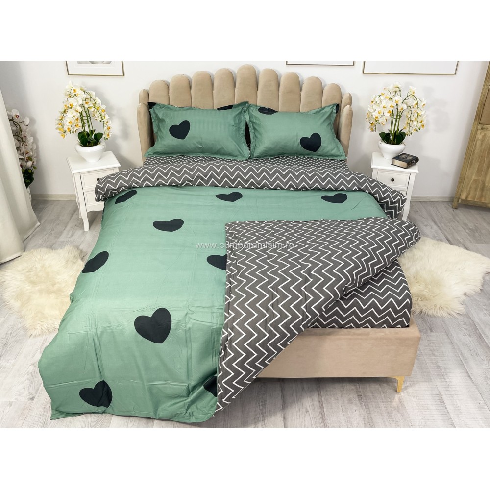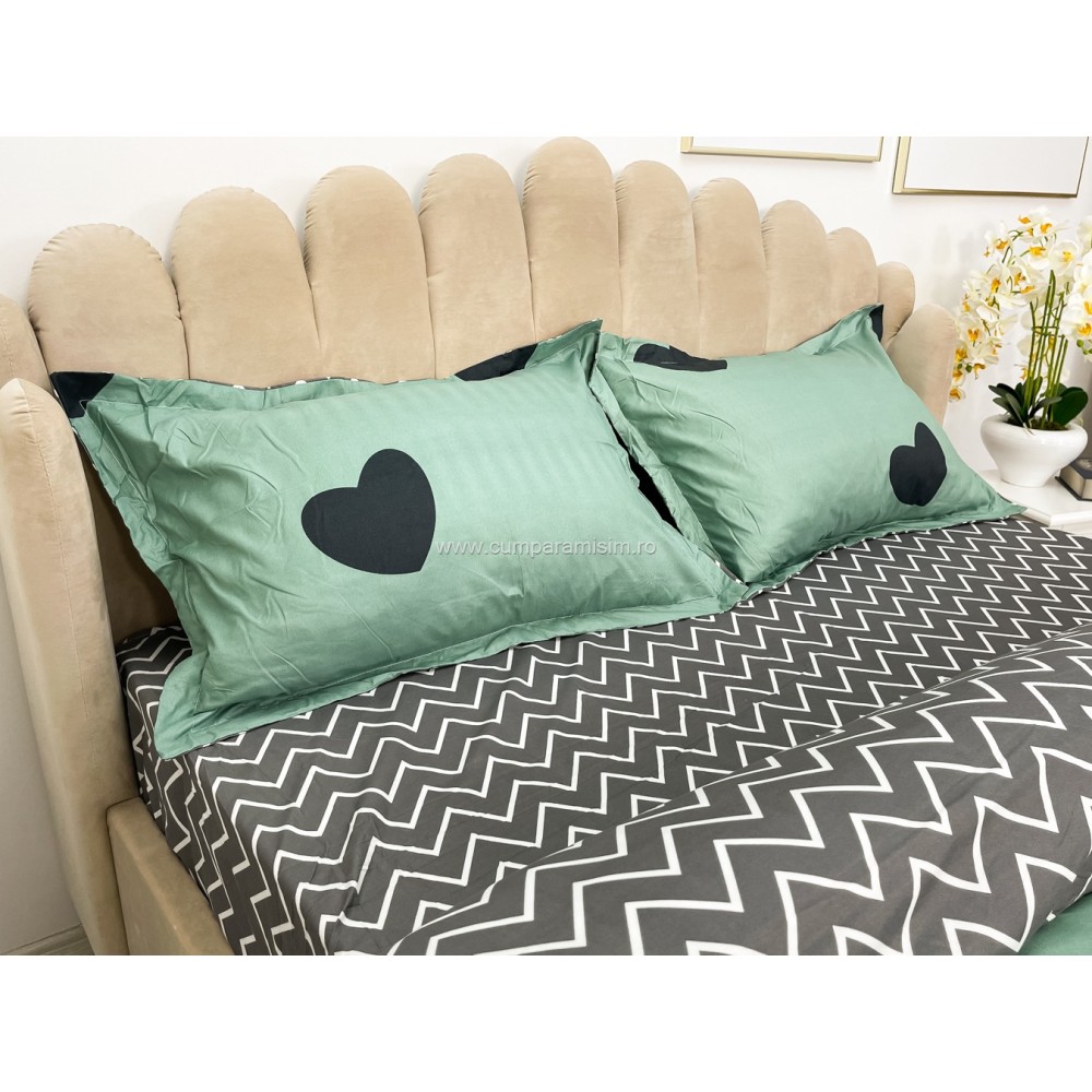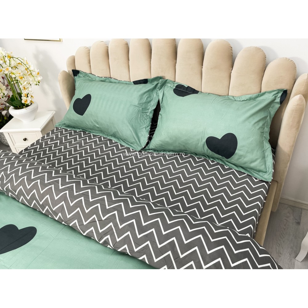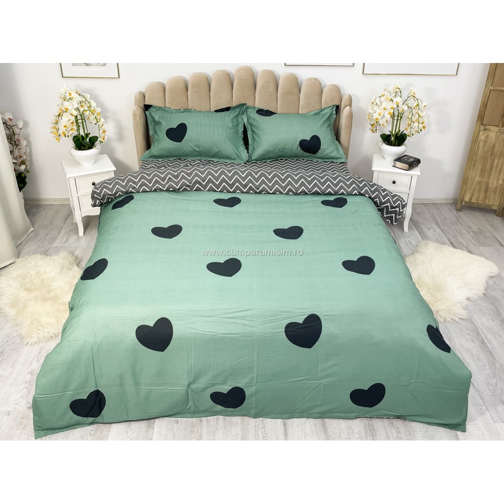 Lenjerie pat dublu, bumbac satinat, cu elastic, Verde, inimioare, Johny Home Pucioasa, cod produs: SPR-E-15