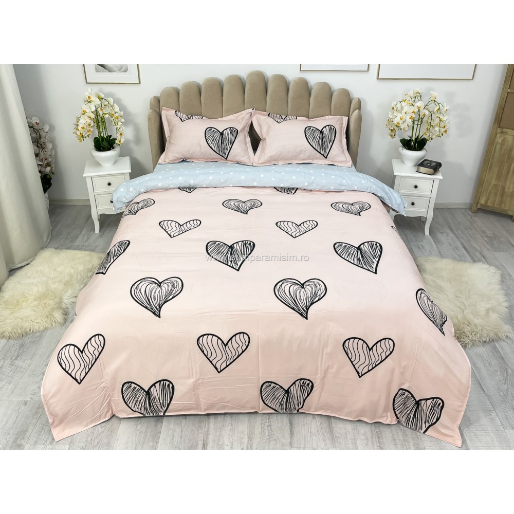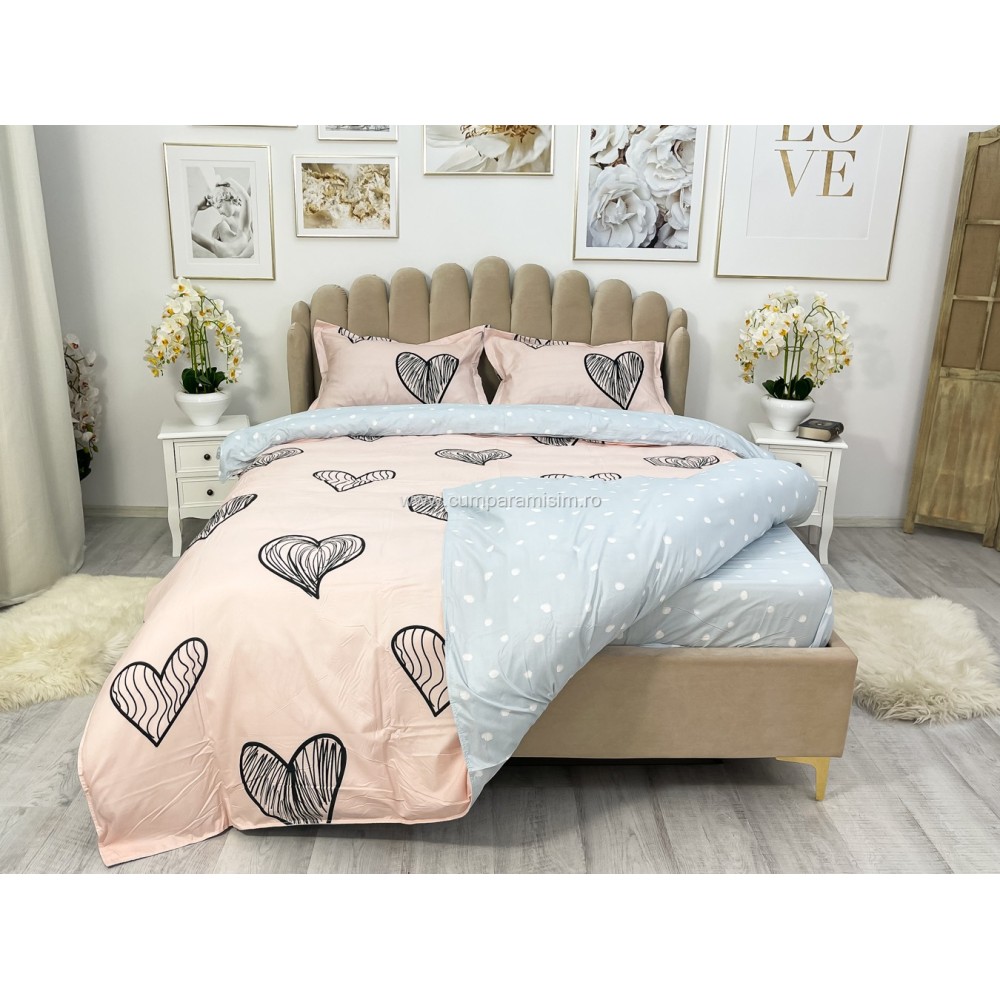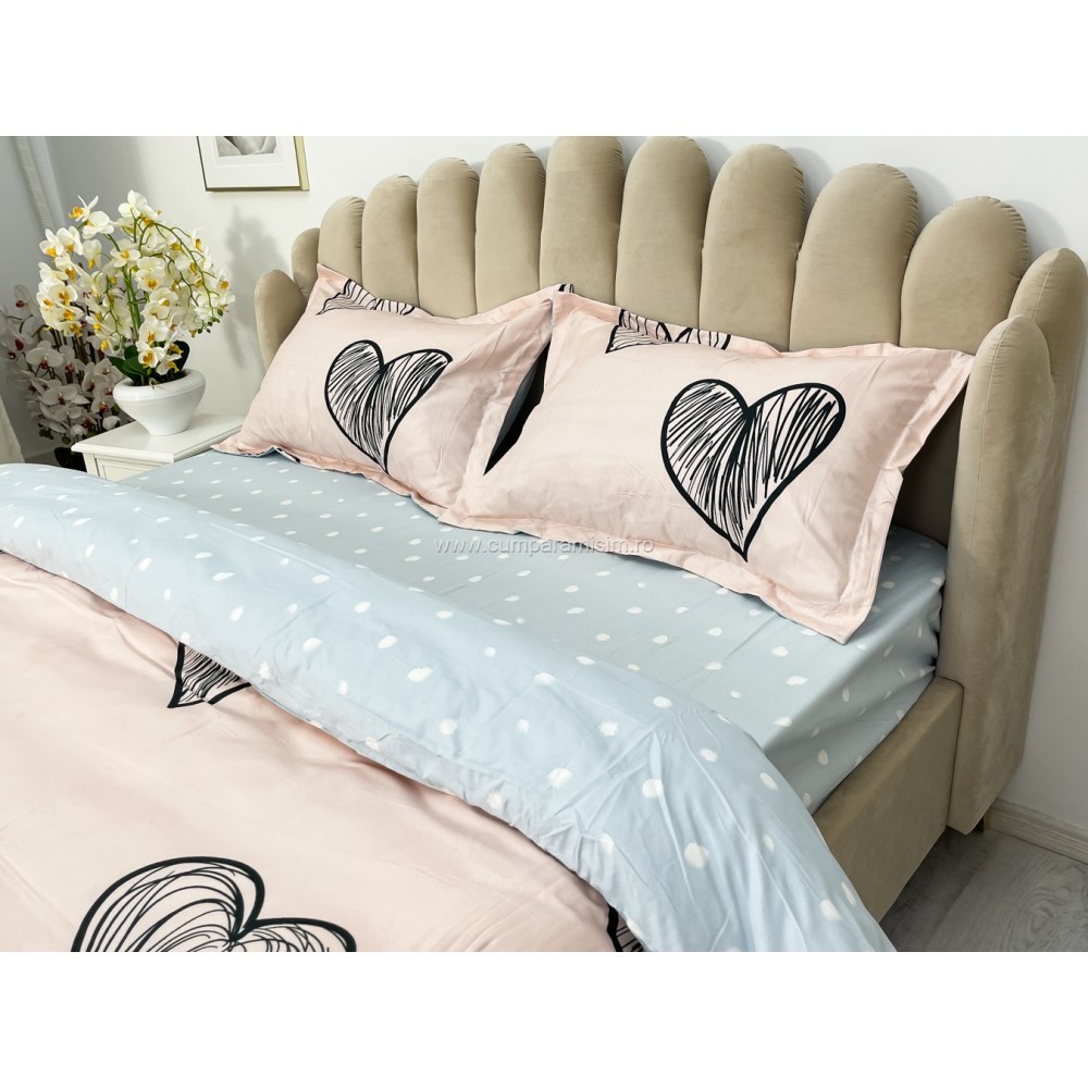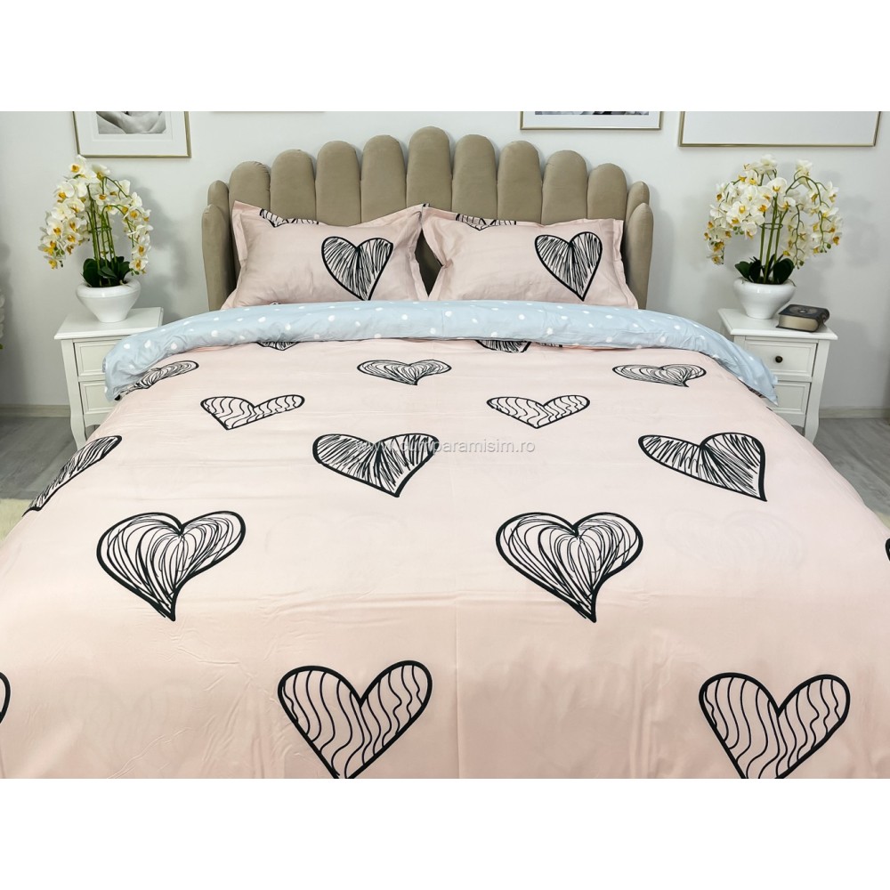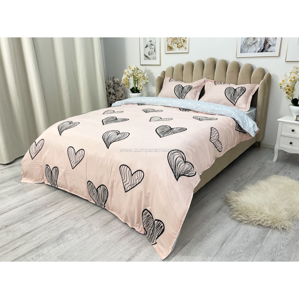 Lenjerie pat dublu, bumbac satinat, cu elastic, Roz, inimioare, Johny Home Pucioasa, cod produs: SPR-E-17