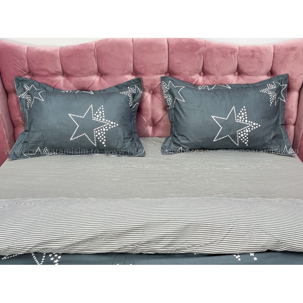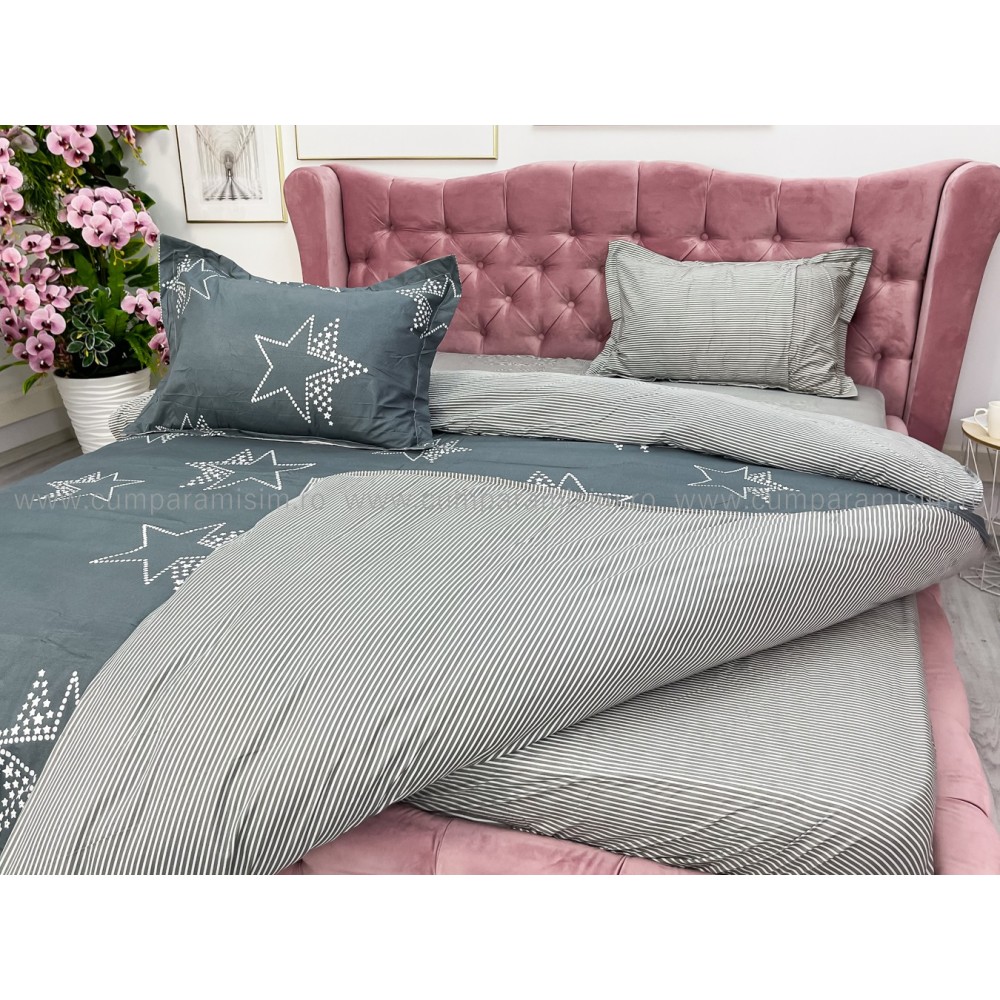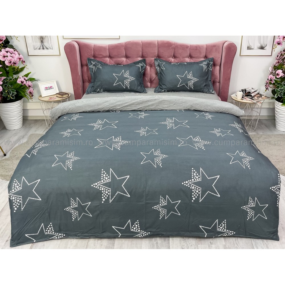 Lenjerie pat dublu, bumbac satinat, cu elastic, Gri, stelute, Johny Home Pucioasa, cod produs: SPR-E-19