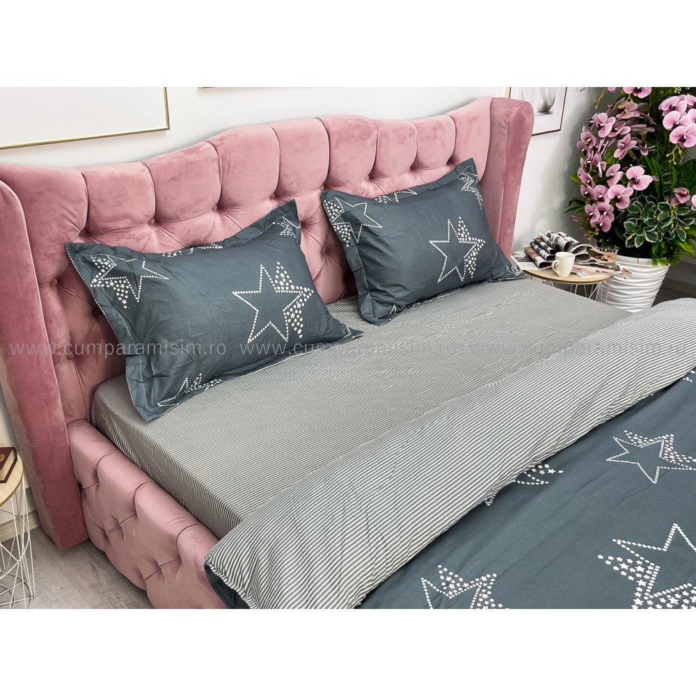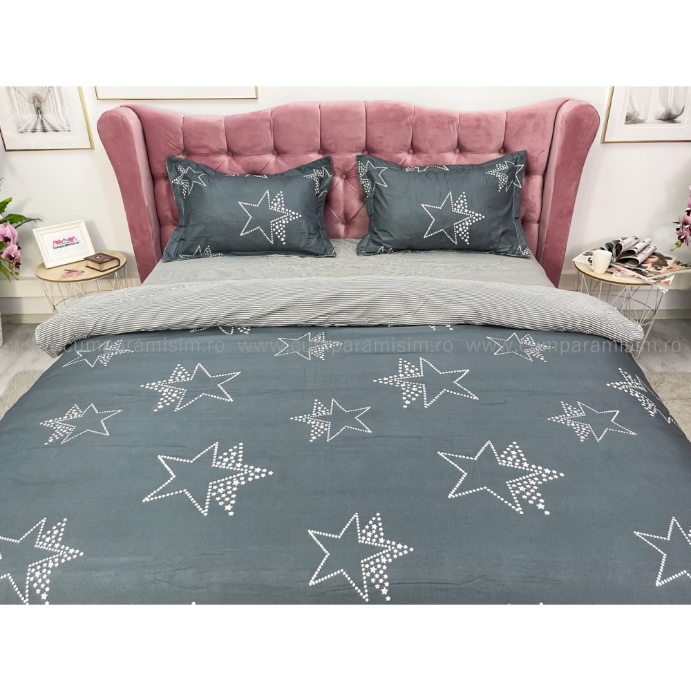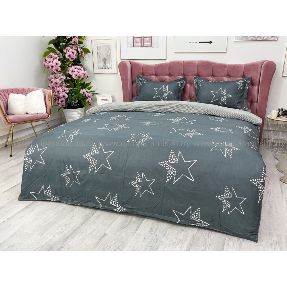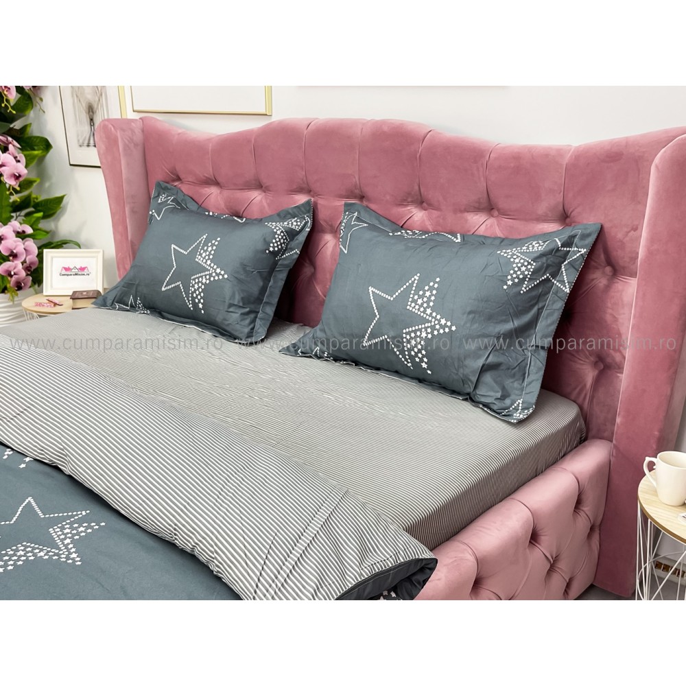 Lenjerie pat dublu, bumbac satinat, cu elastic, Gri, stelute, Johny Home Pucioasa, cod produs: SPR-E-19