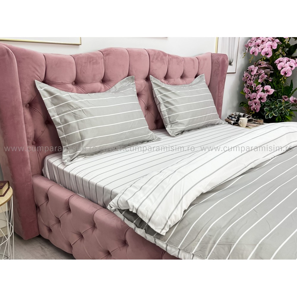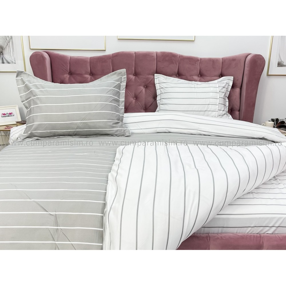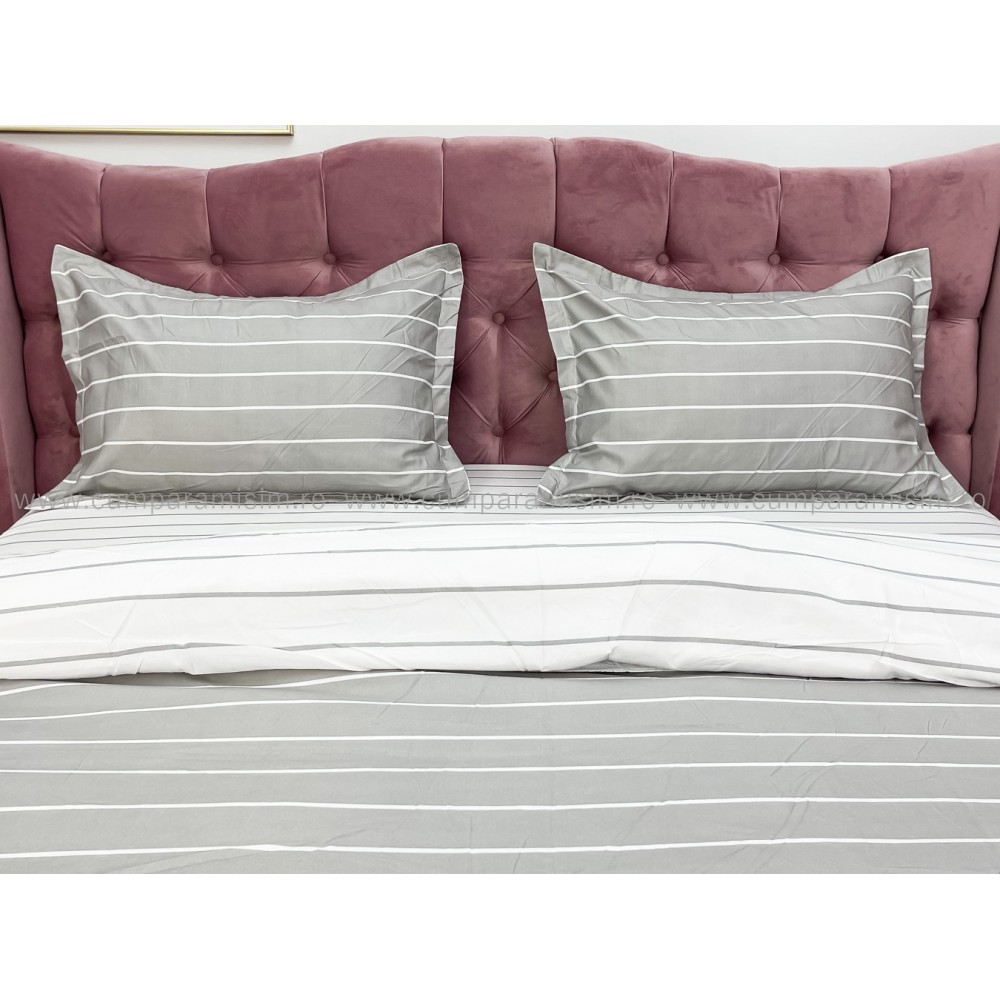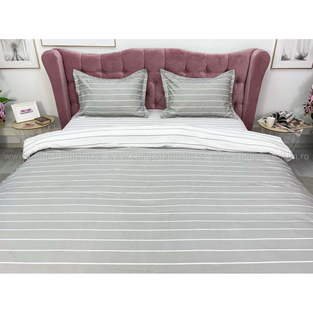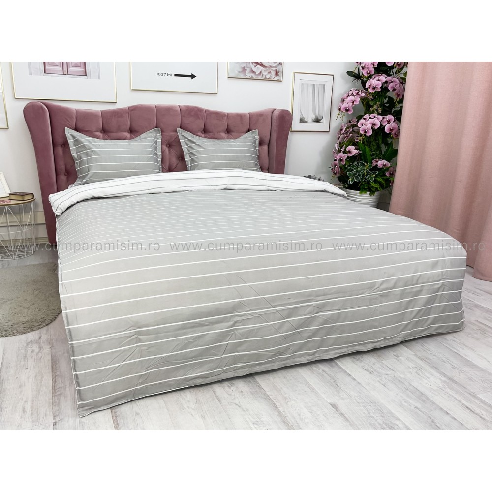 Lenjerie pat dublu, bumbac satinat, cu elastic, Gri, dungi, Johny Home Pucioasa, cod produs: SPR-E-25