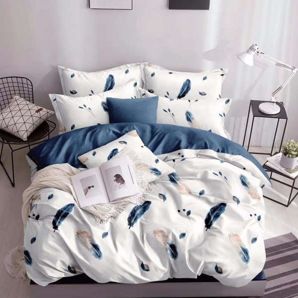 Lenjerie pat dublu, bumbac satinat, cu elastic, Albastru, pene, Johny Home Pucioasa, cod produs: SPR-E-29