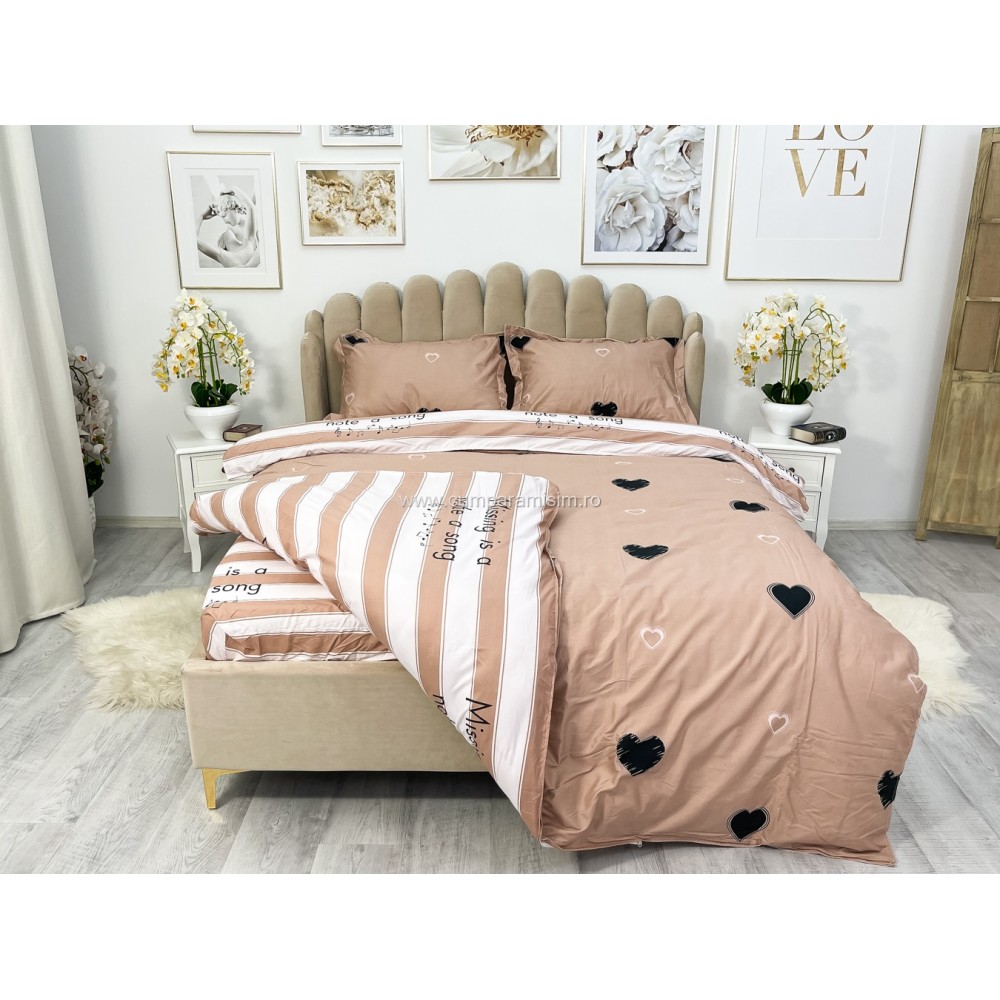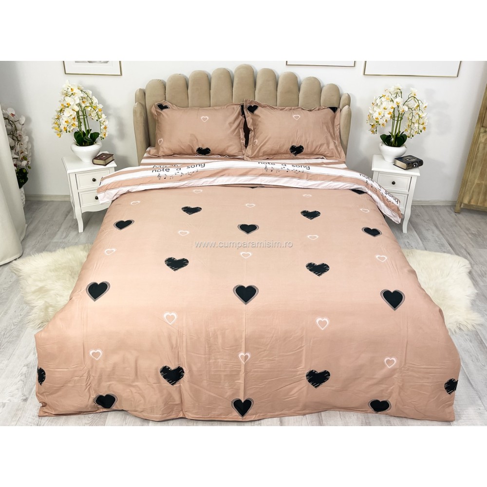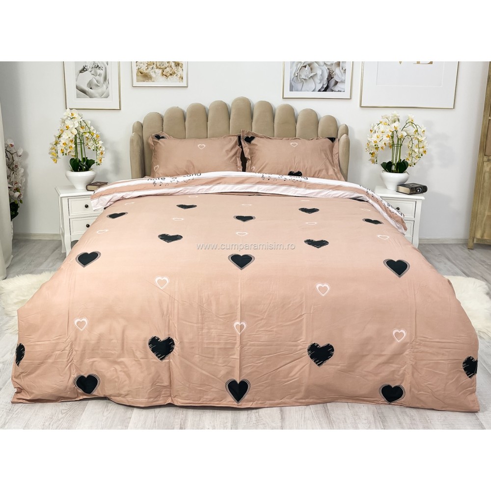 Lenjerie pat dublu, bumbac satinat, cu elastic, Pudra, inimioare, Johny Home Pucioasa, cod produs: SPR-E-10