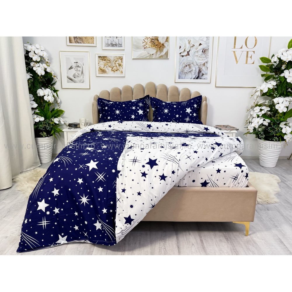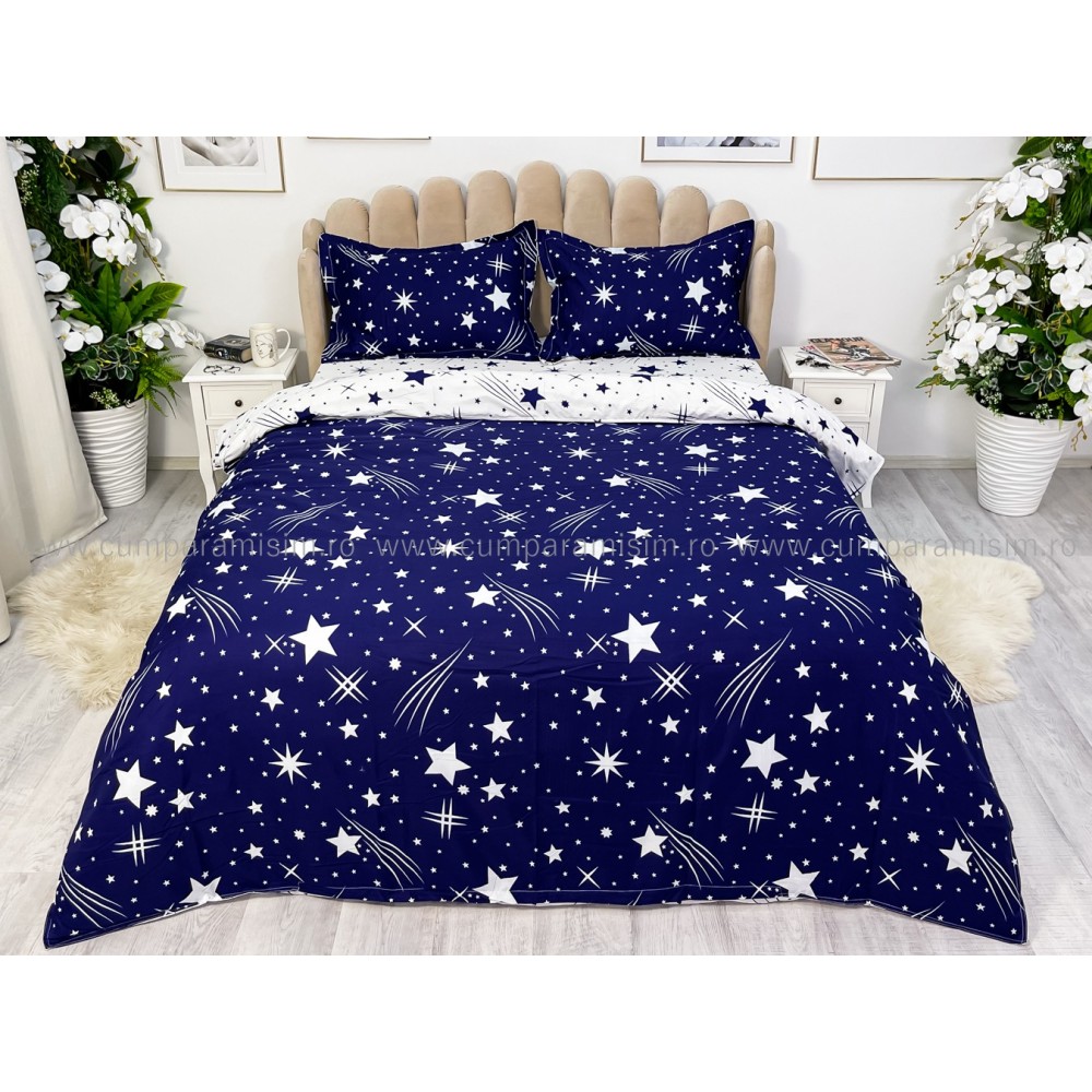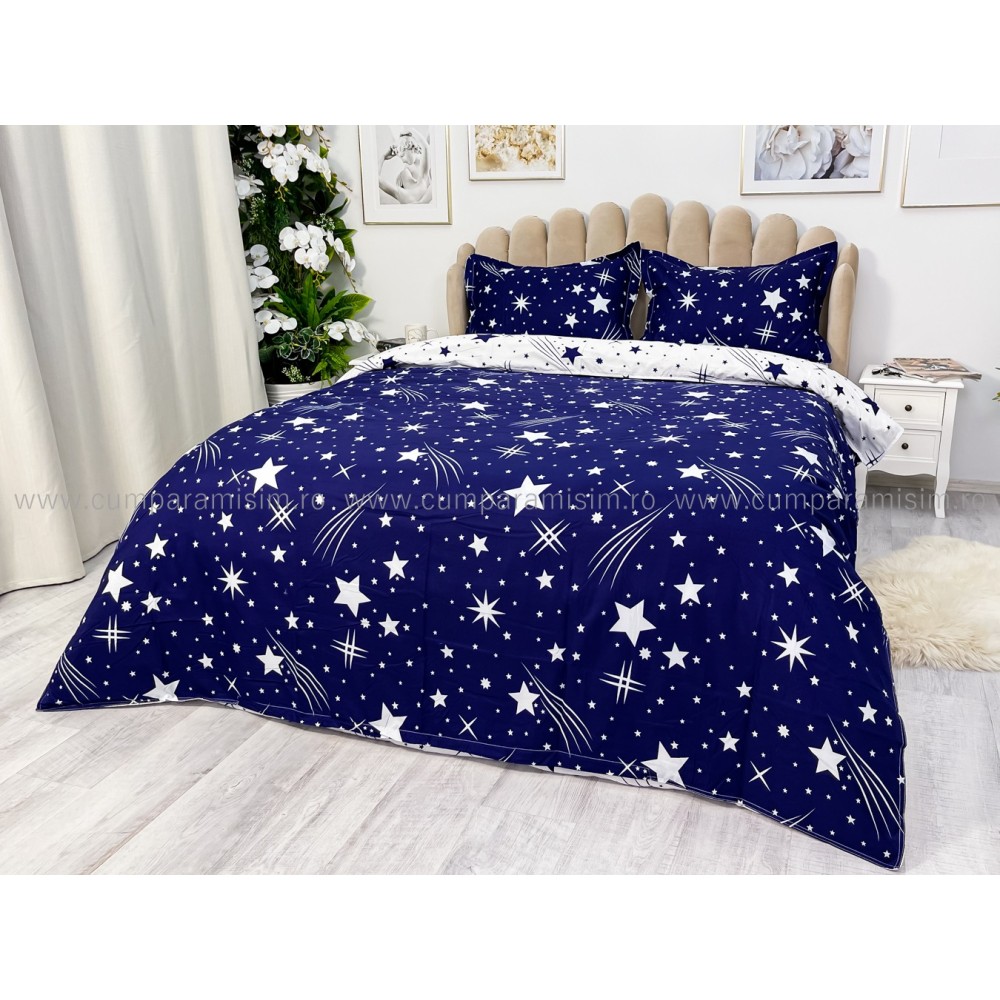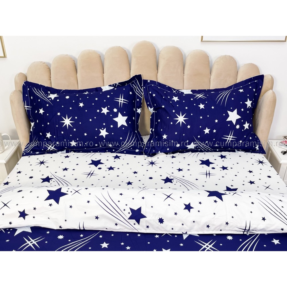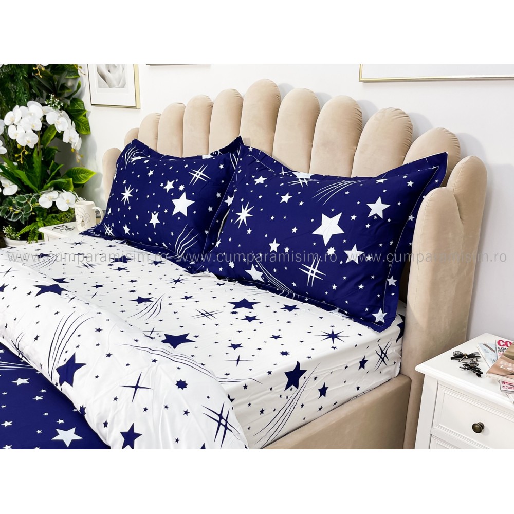 Lenjerie pat dublu, bumbac satinat, cu elastic, Albastru, stelute, Johny Home Pucioasa, cod produs: SPR-E-26