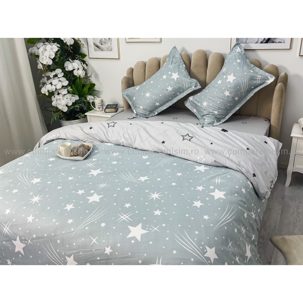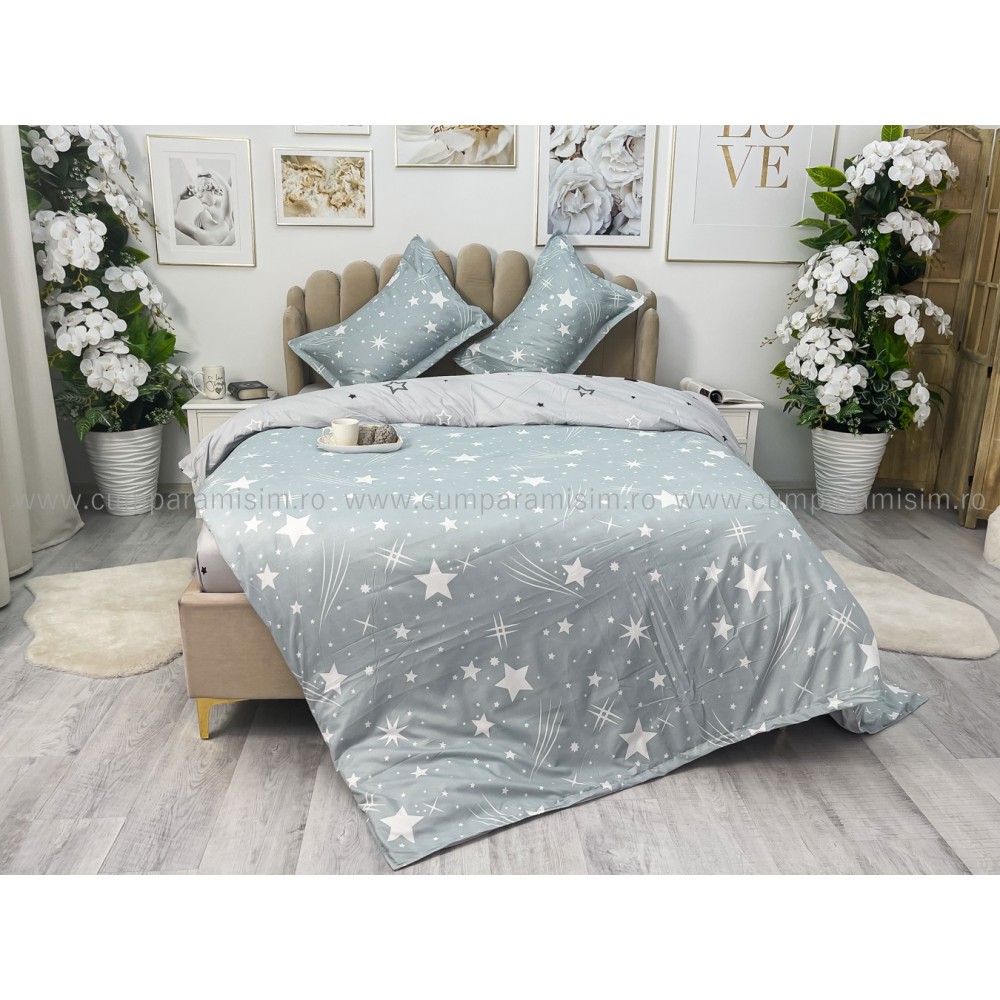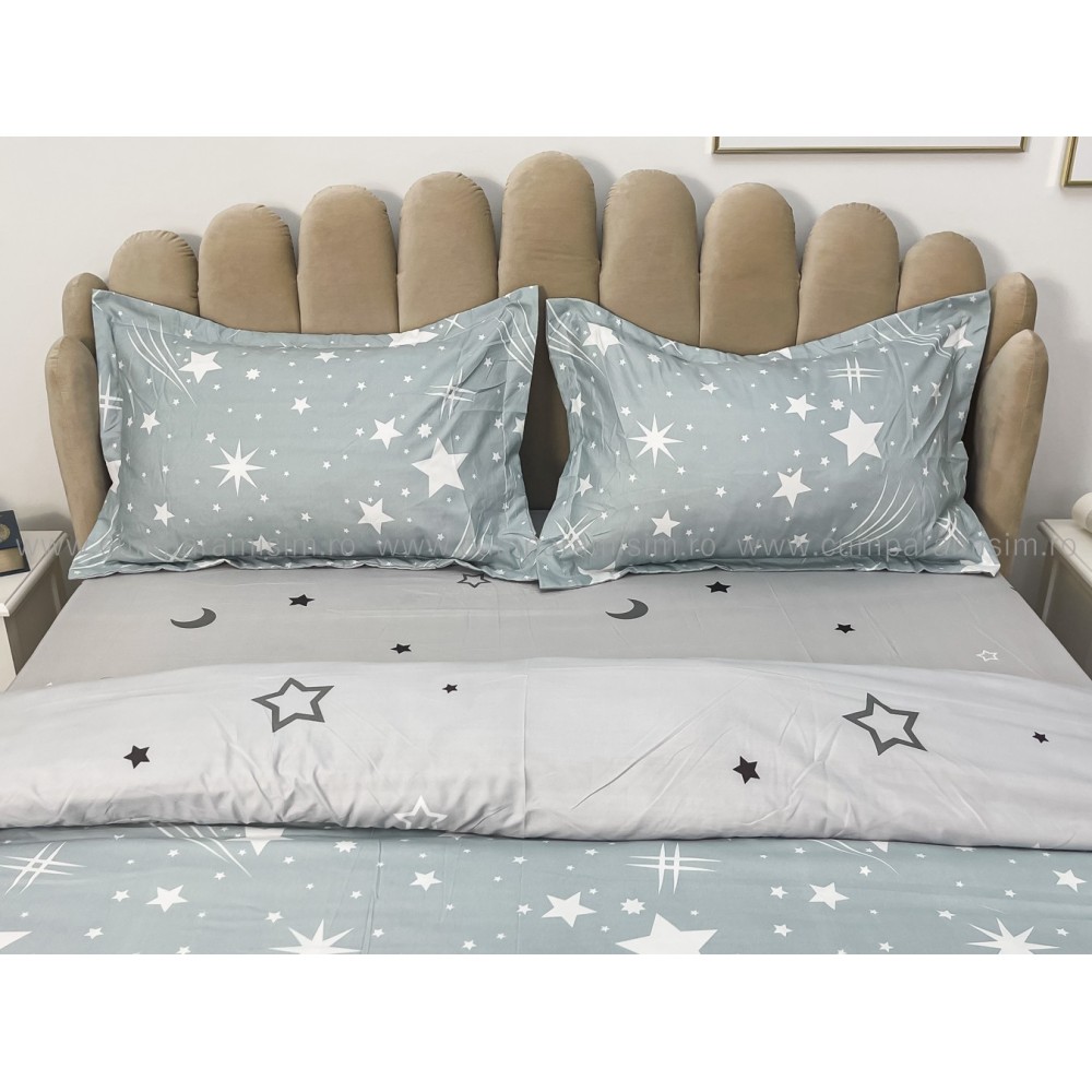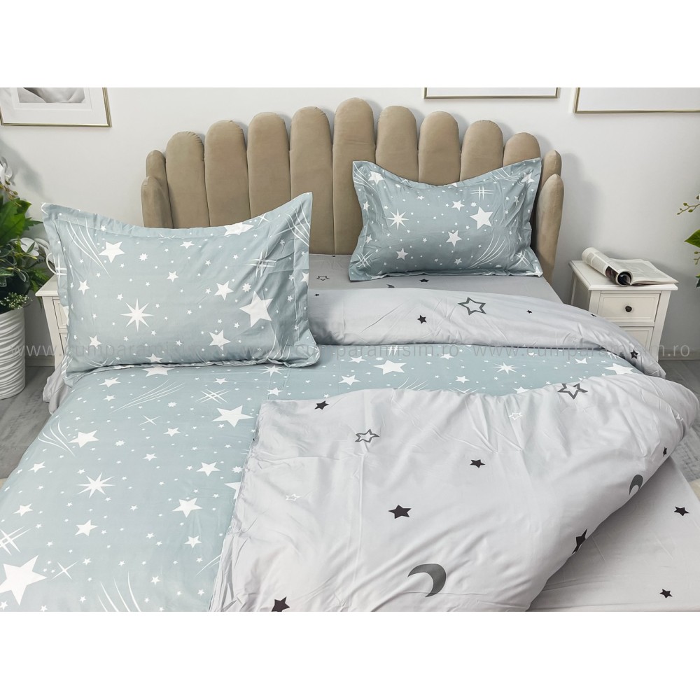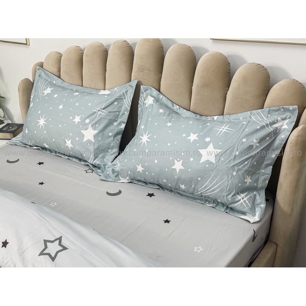 Lenjerie pat dublu, bumbac satinat, cu elastic, Gri, stelute, Johny Home Pucioasa, cod produs: SPR-E-31