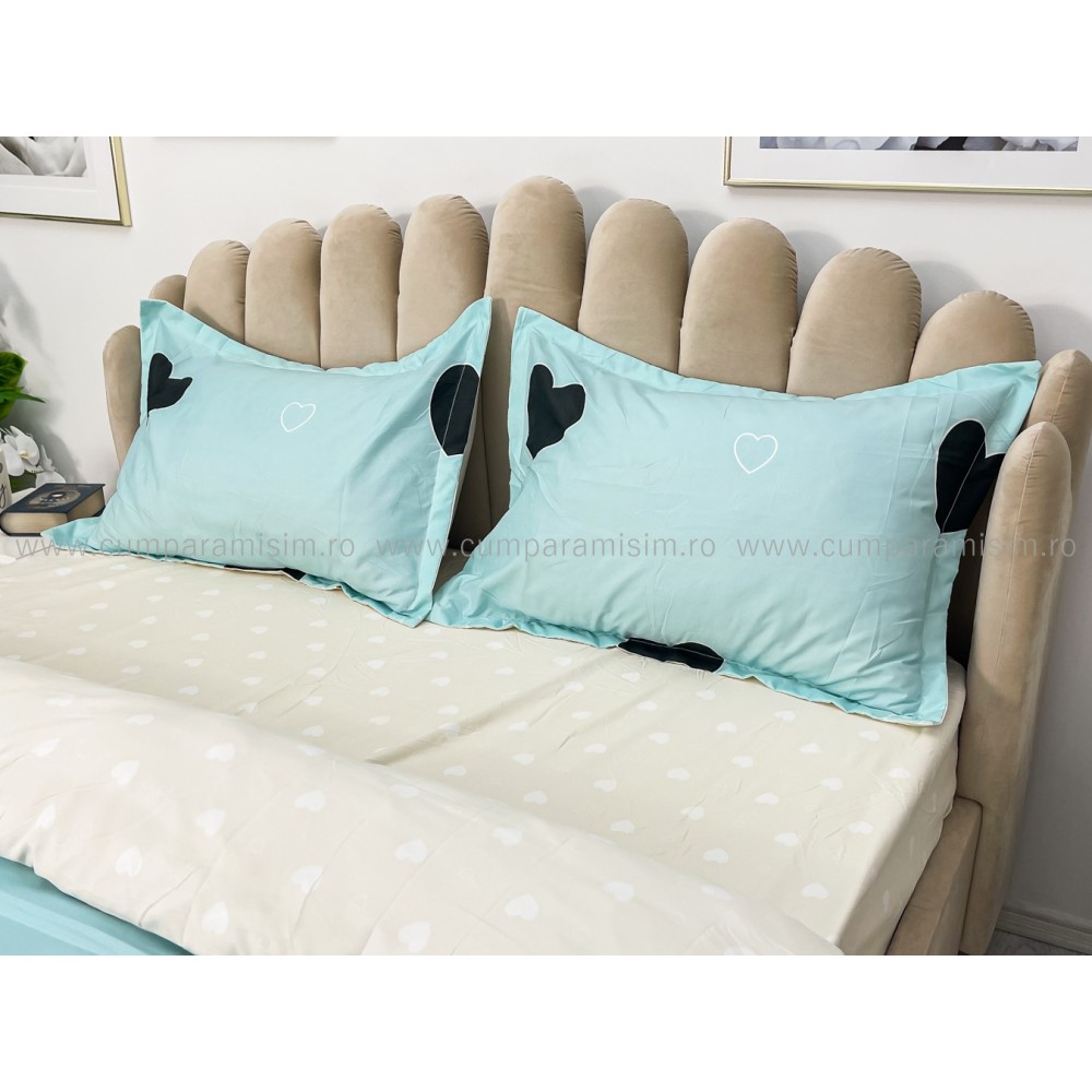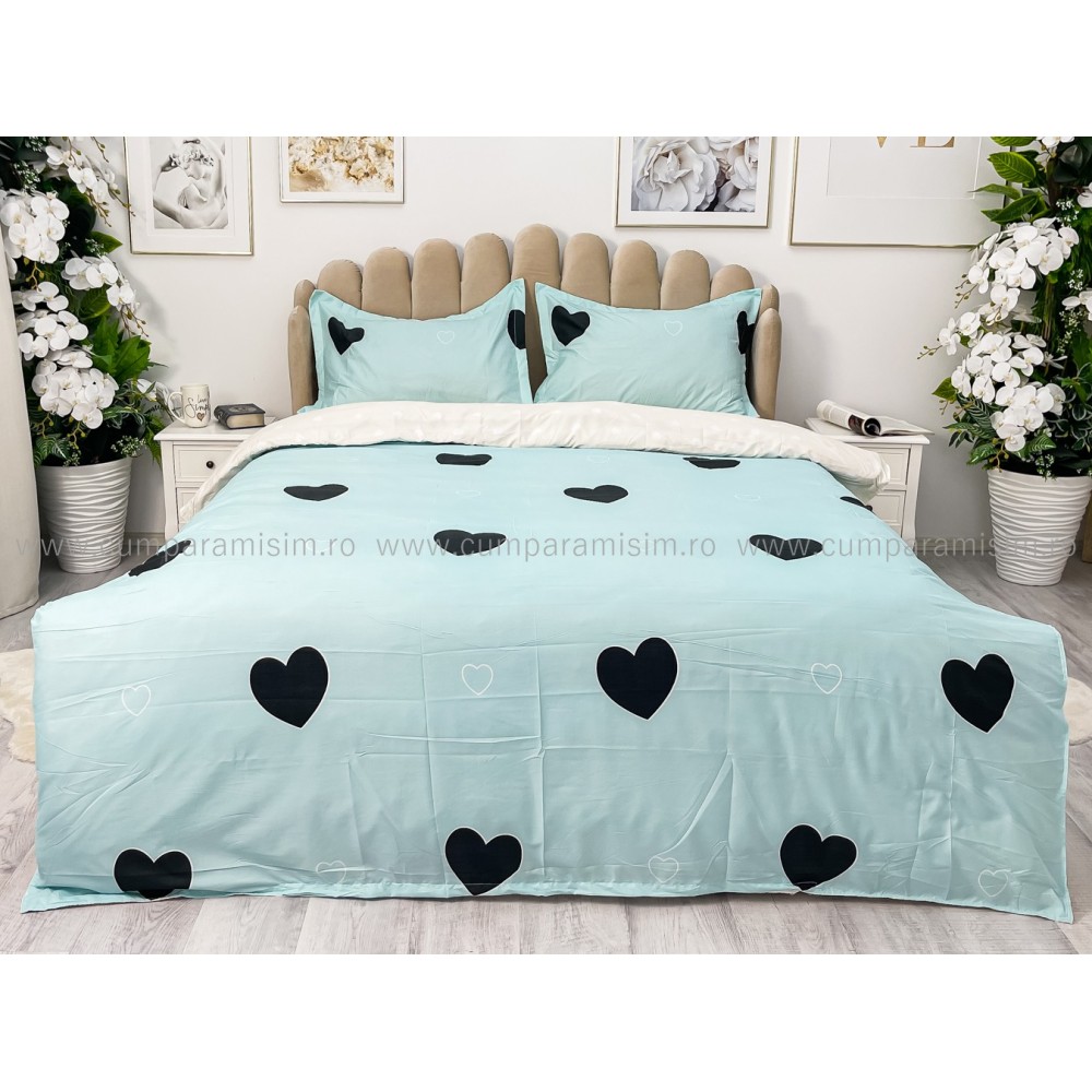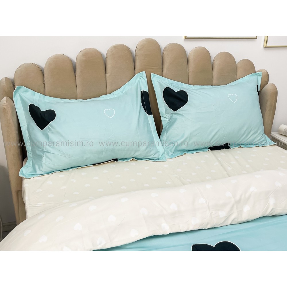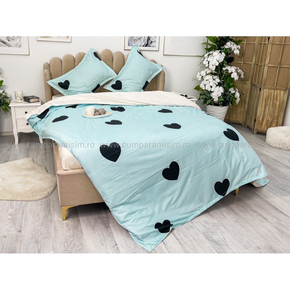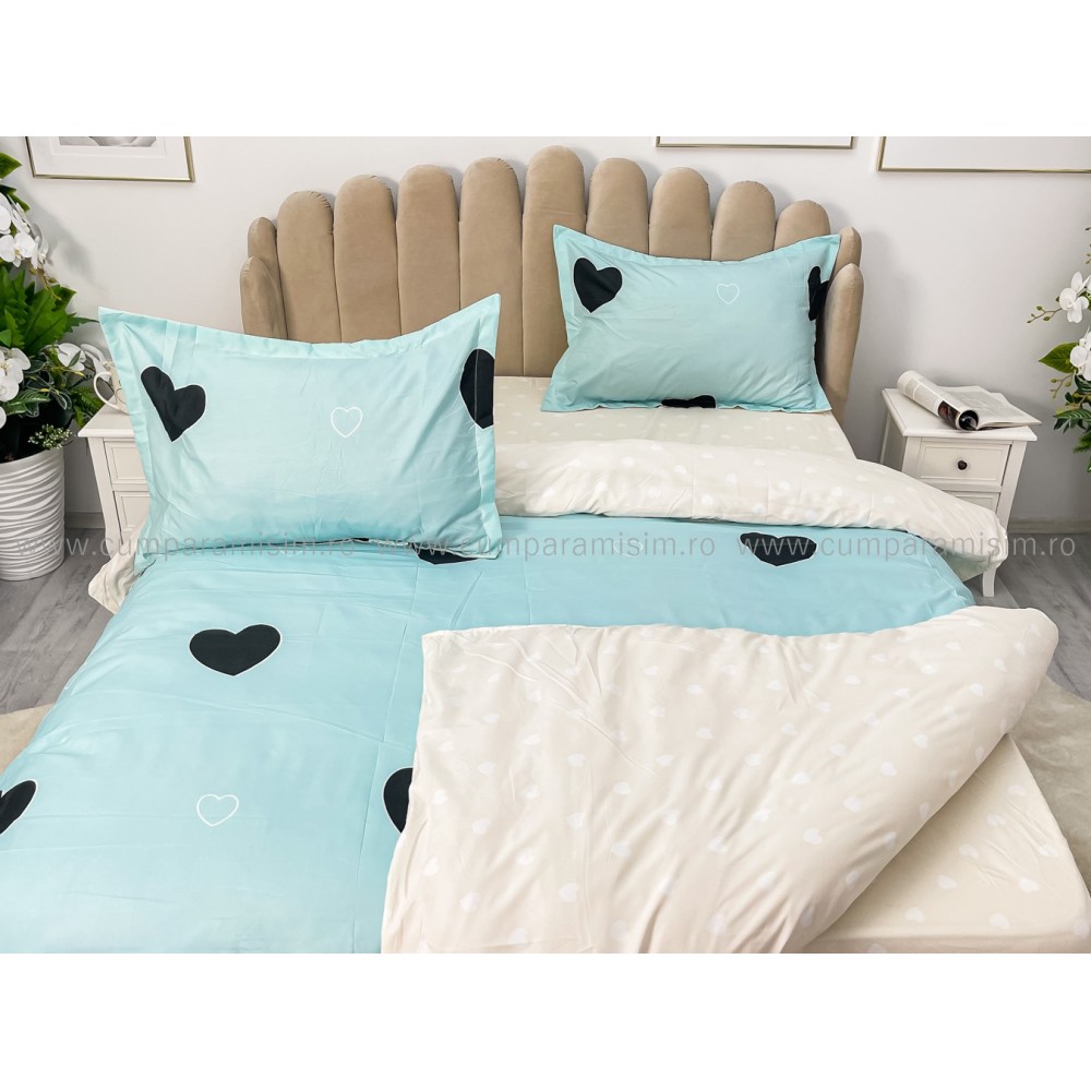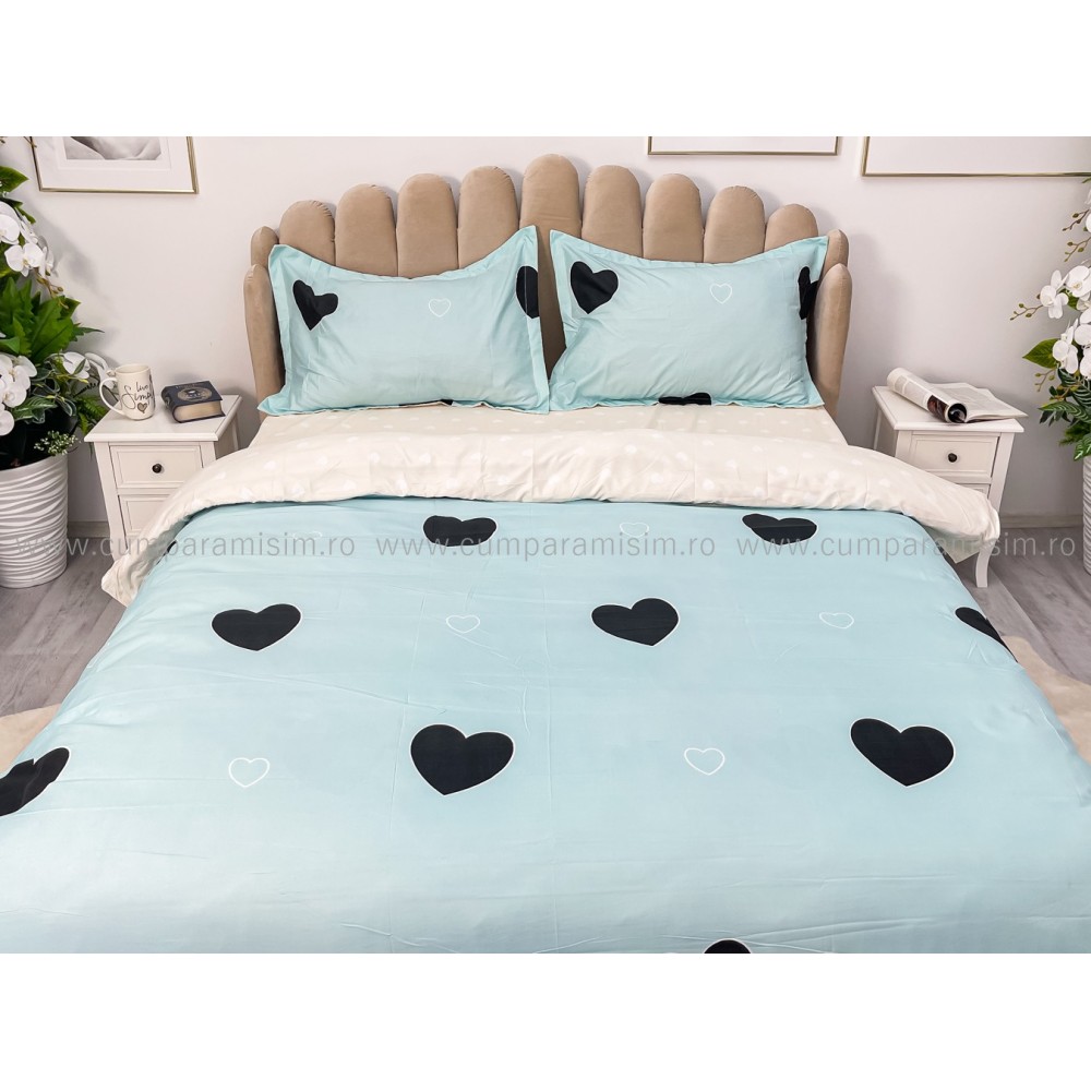 Lenjerie pat dublu, bumbac satinat, cu elastic, Bleu, inimioare, Johny Home Pucioasa, cod produs: SPR-E-33