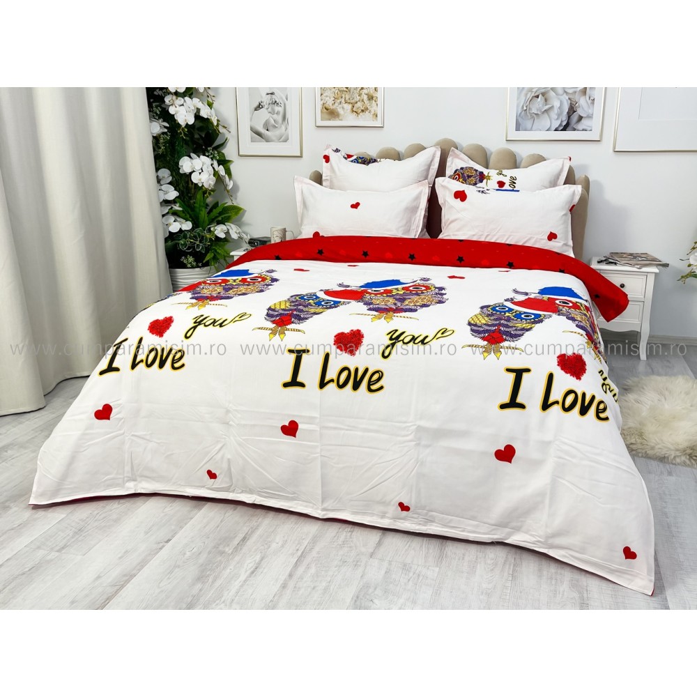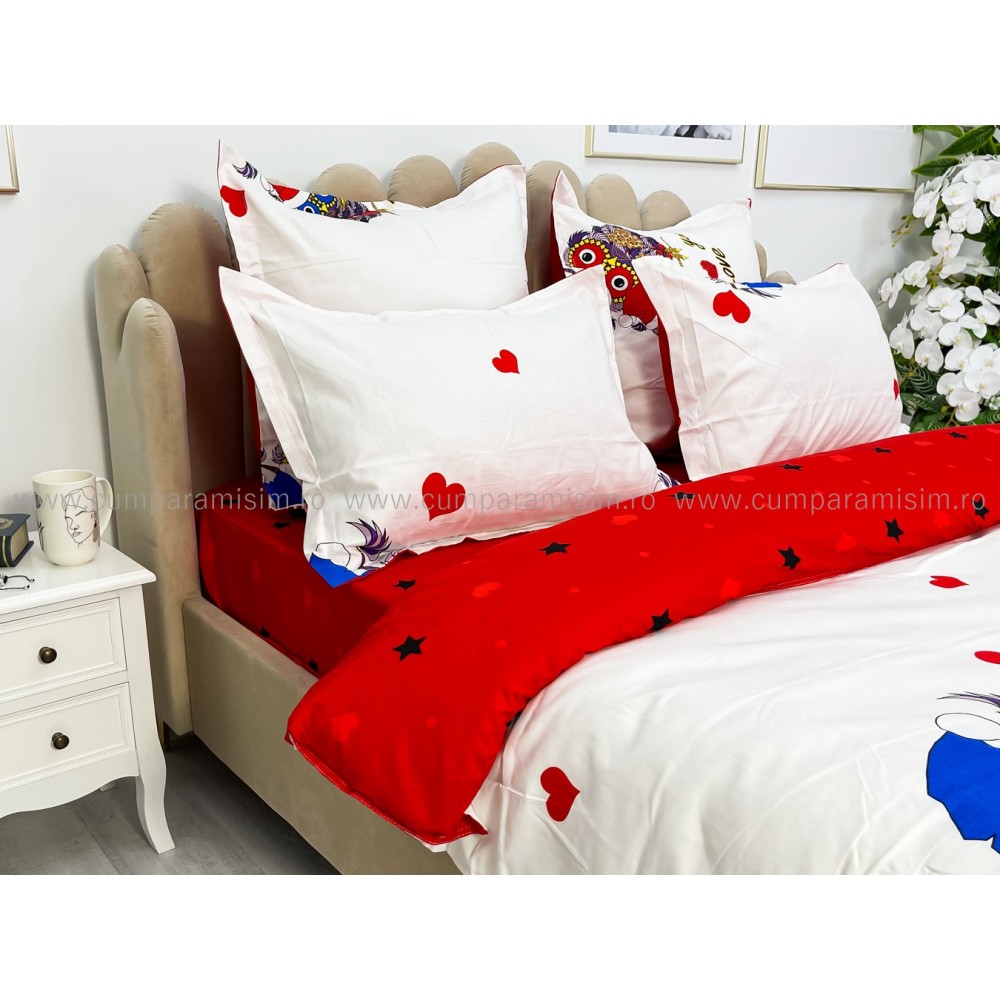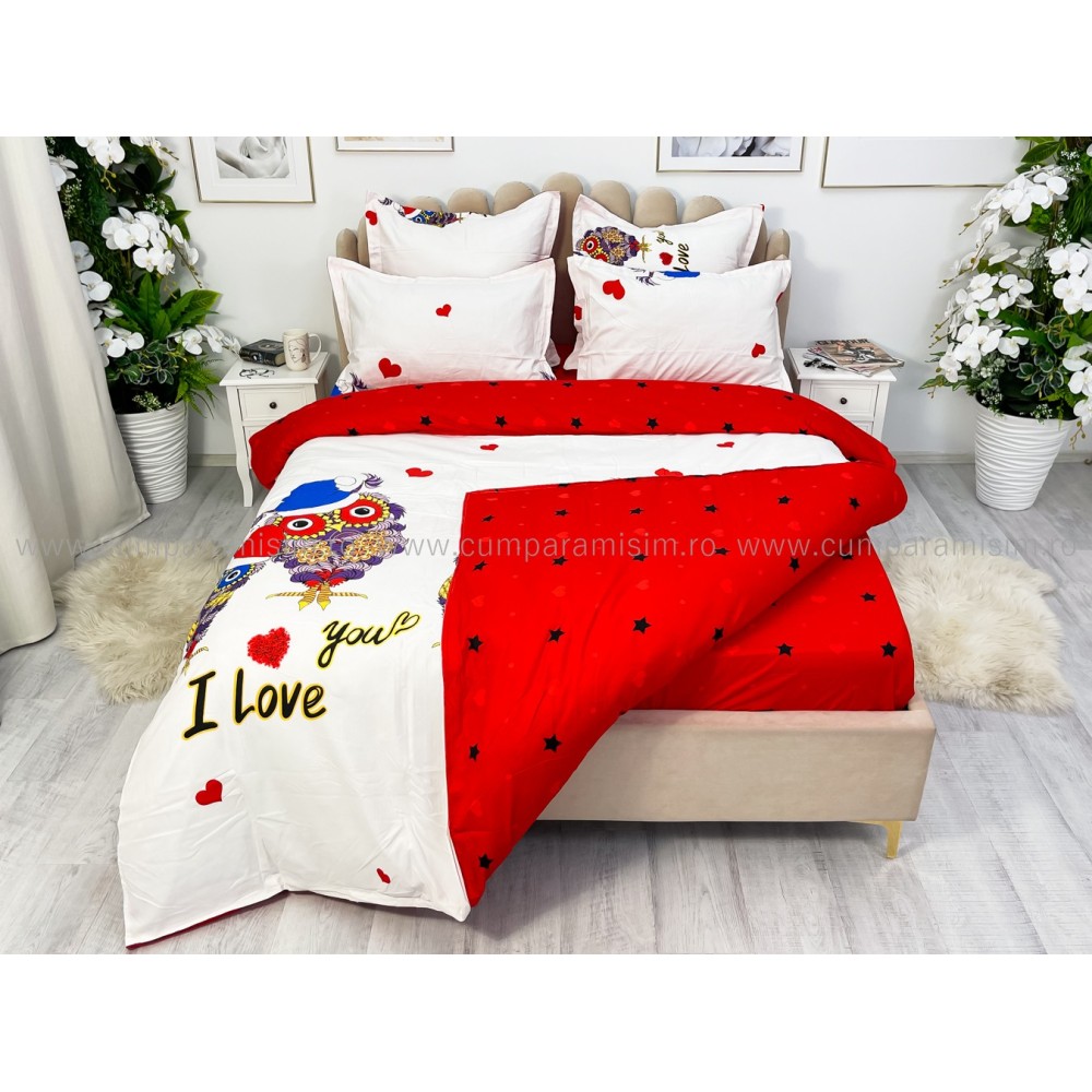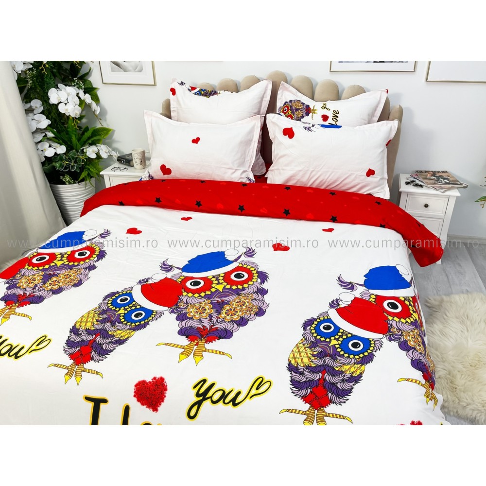 Lenjerie pat dublu, FINET, 6 piese, Alb-Rosu, bufnite, Johny Home Pucioasa, cod produs: SPR-R60-427