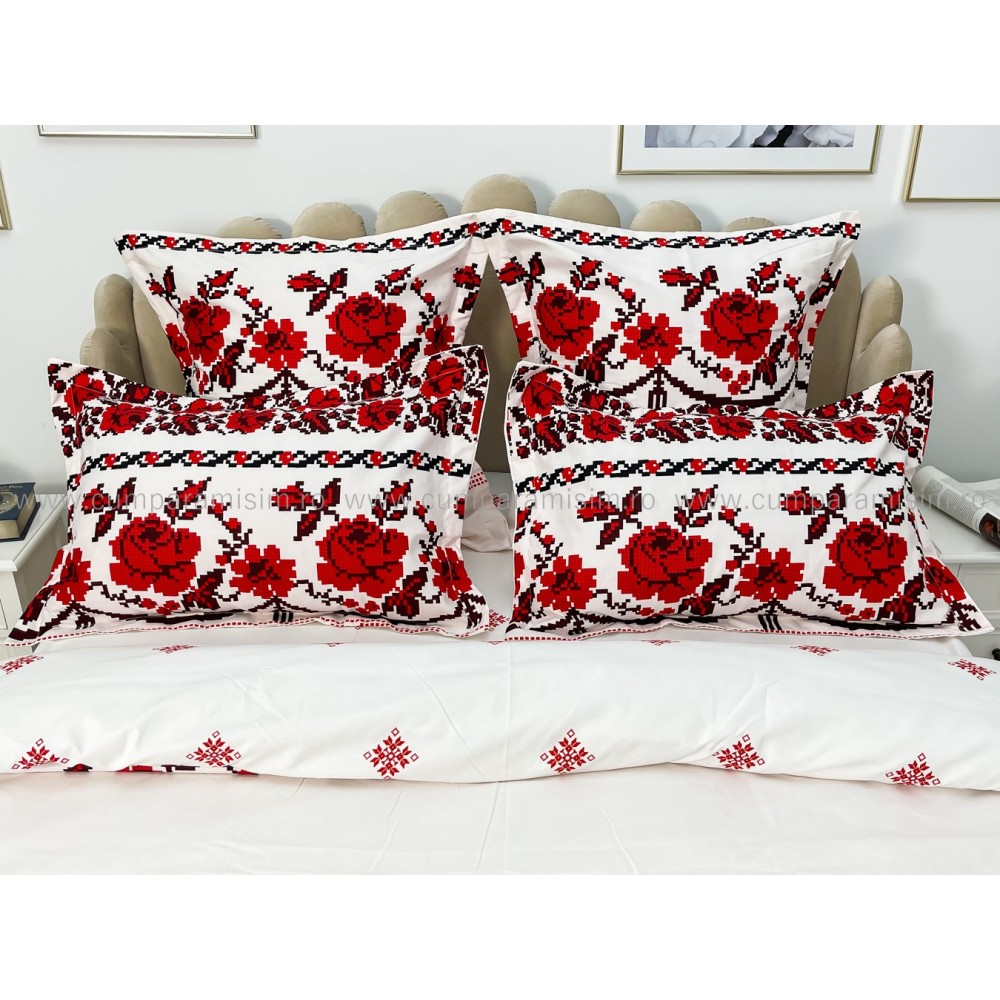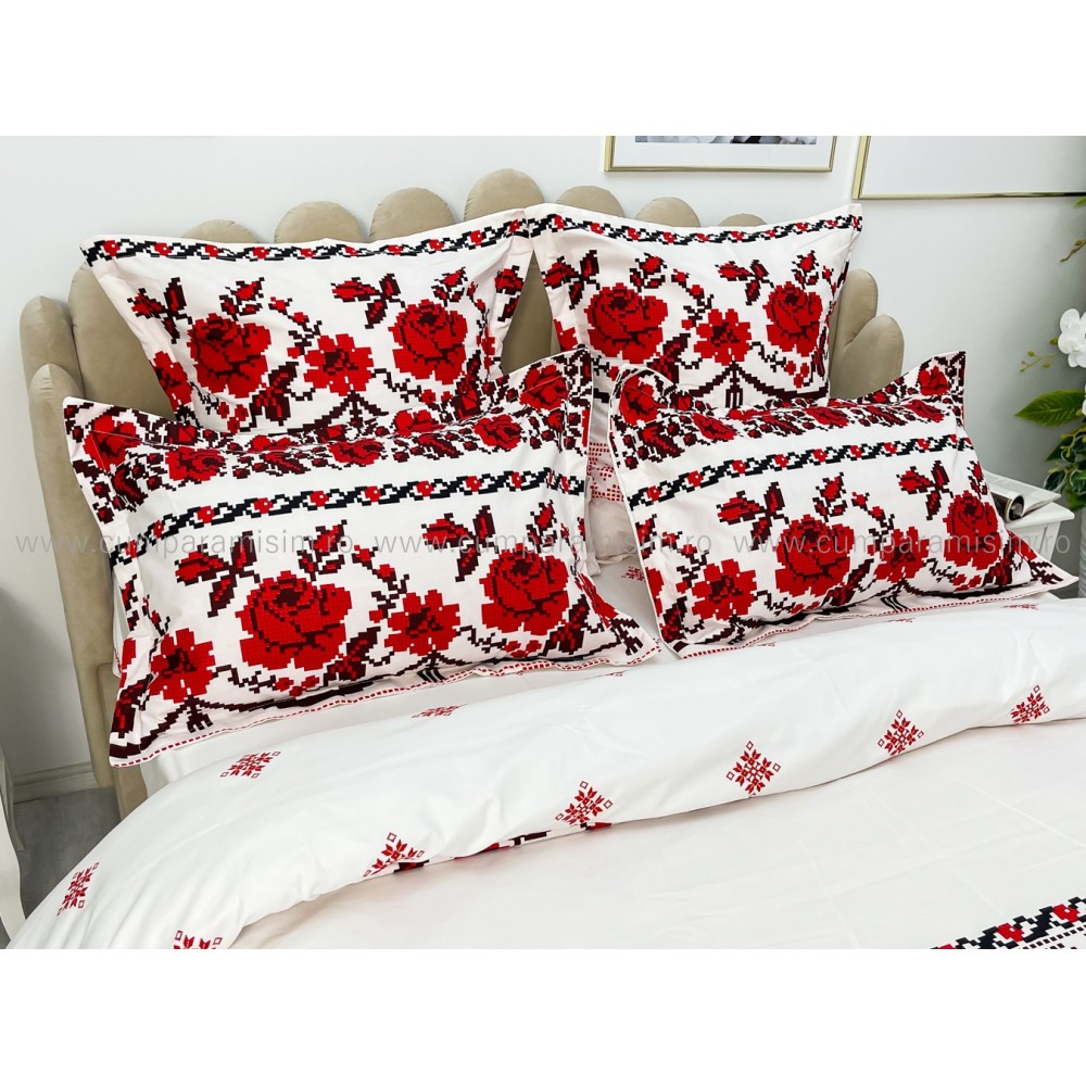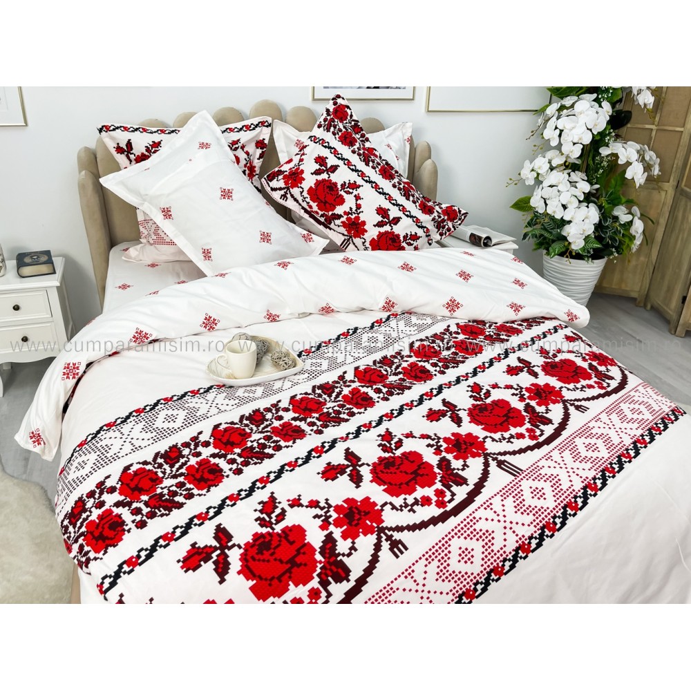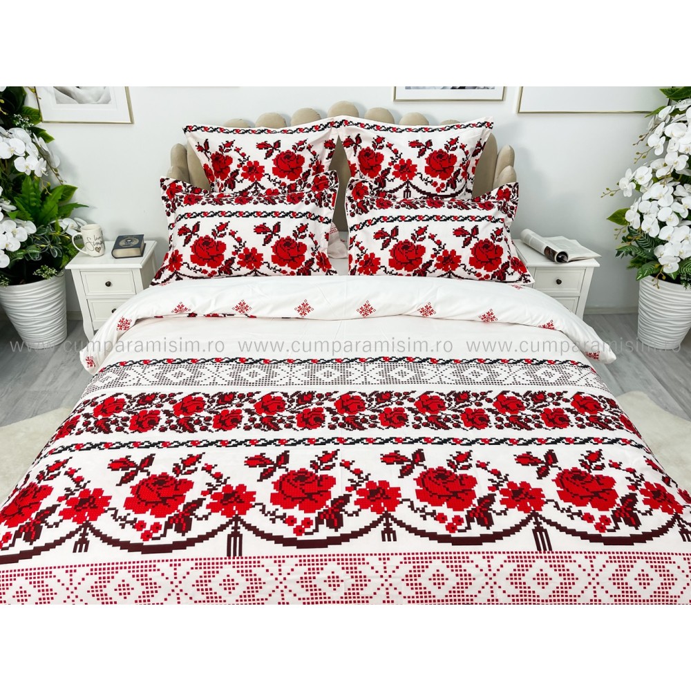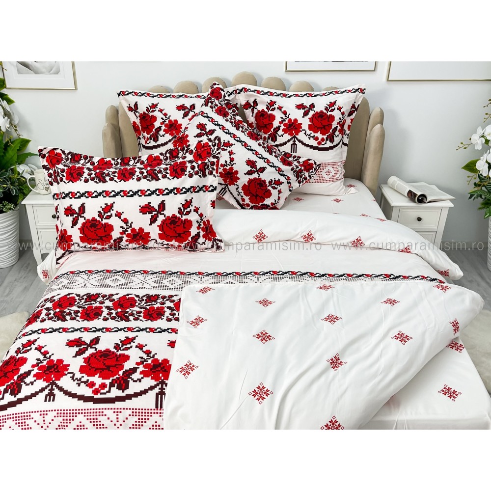 Lenjerie pat dublu, FINET, 6 piese, Alb-Rosu, model traditional, Johny Home Pucioasa, cod produs: SPR-R60-471