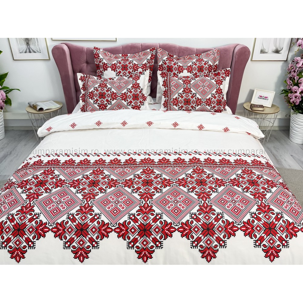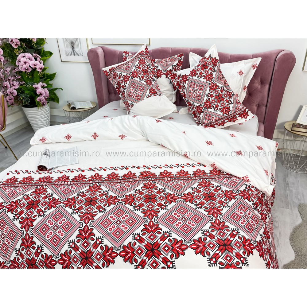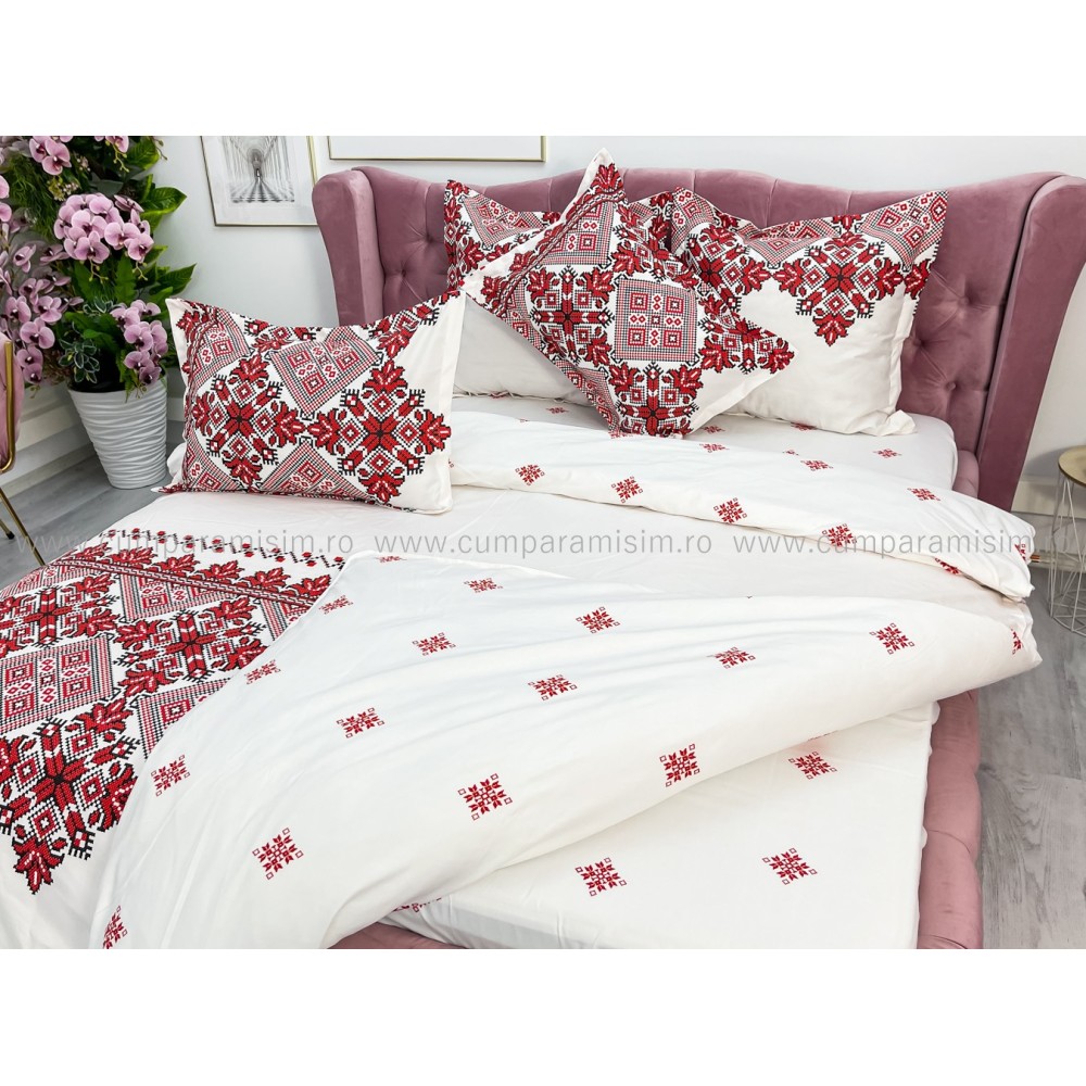 Lenjerie pat dublu, FINET, 6 piese, Alb-Rosu, model traditional, Johny Home Pucioasa, cod produs: SPR-R60-473