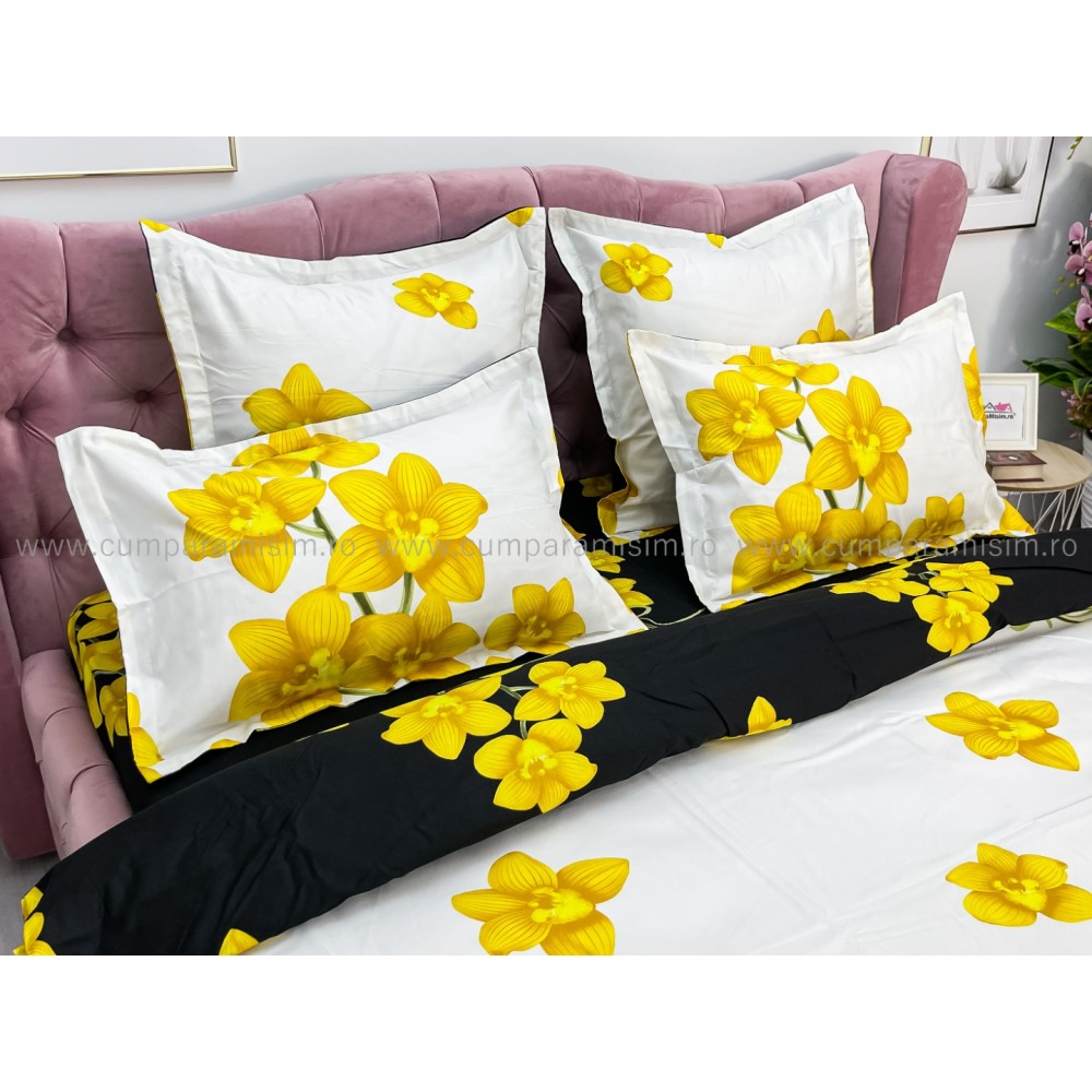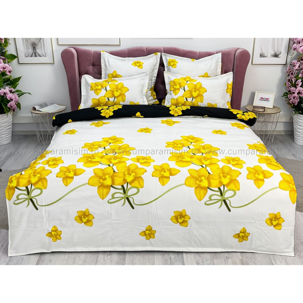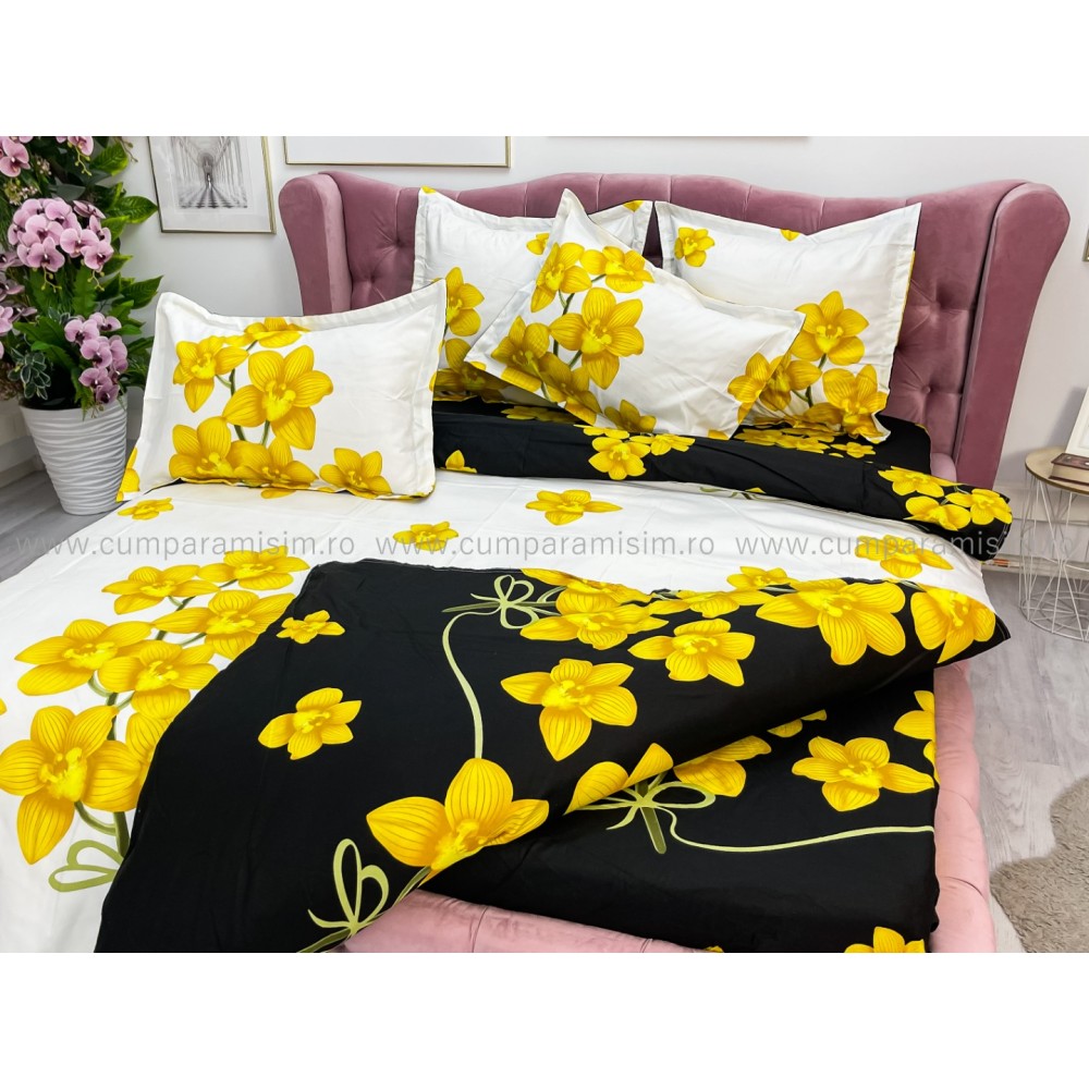 Lenjerie pat dublu, FINET, 6 piese, cu ELASTIC, Galben, flori, Johny Home Pucioasa, cod produs: SPR-T-104