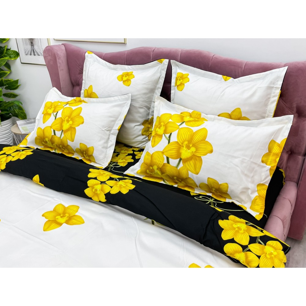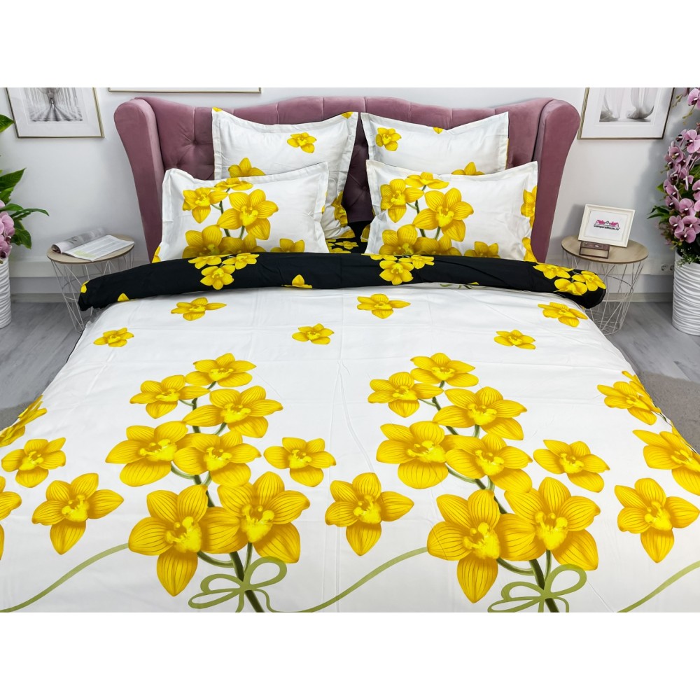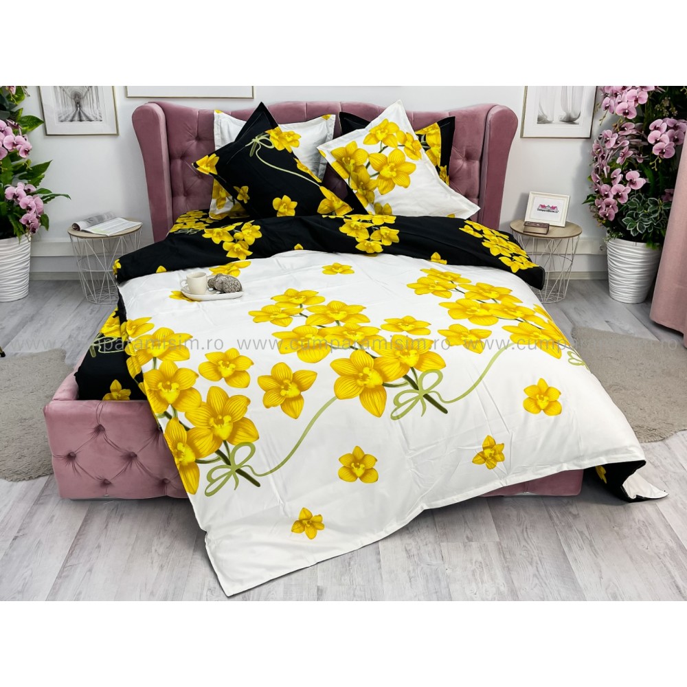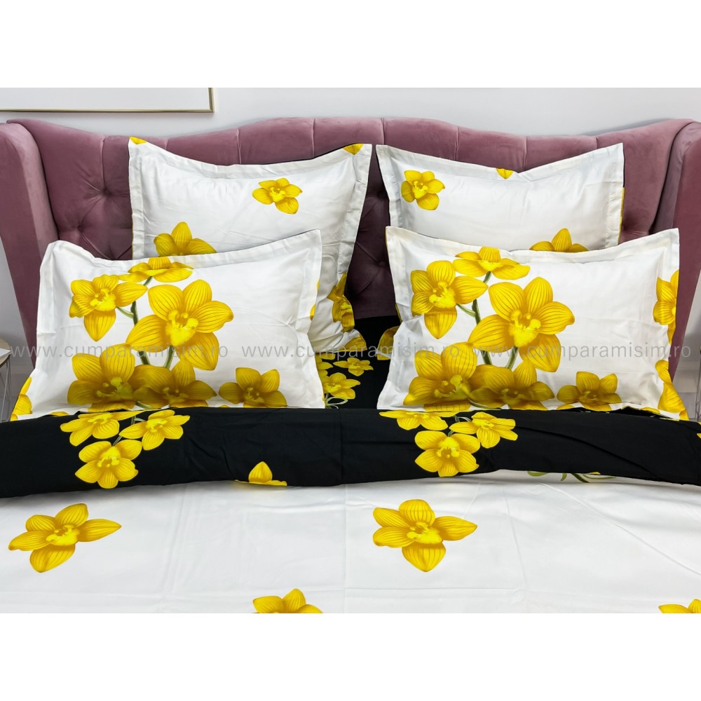 Lenjerie pat dublu, FINET, 6 piese, cu ELASTIC, Galben, flori, Johny Home Pucioasa, cod produs: SPR-T-104