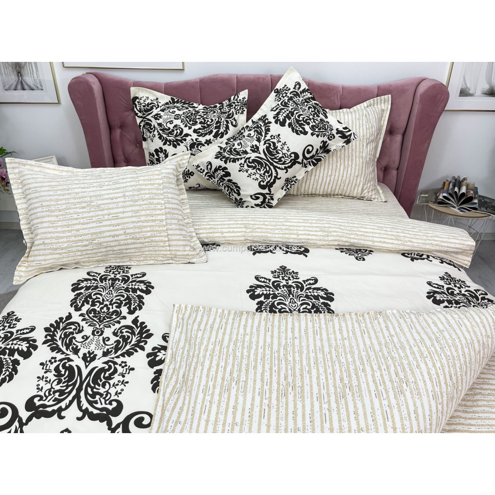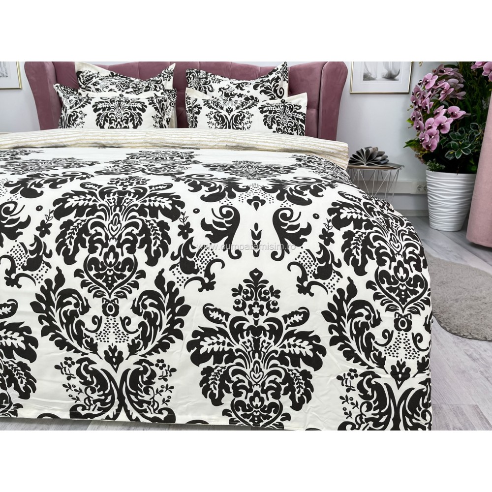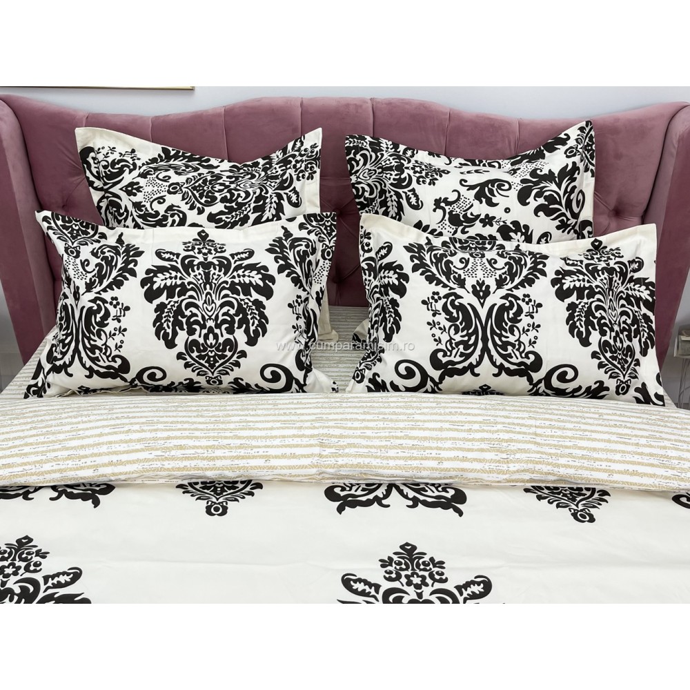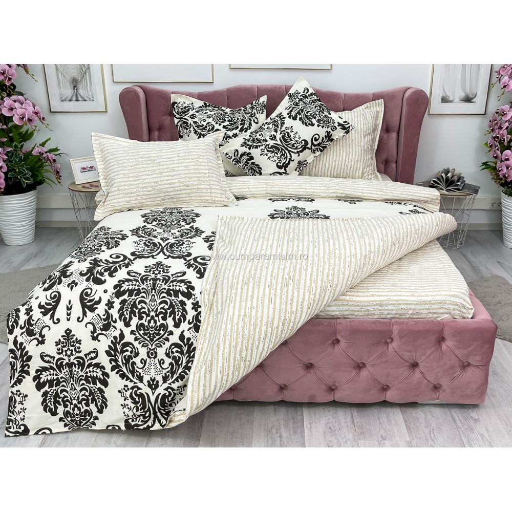 Lenjerie pat dublu, FINET, 6 piese, cu ELASTIC, Bej, model oriental, Johny Home Pucioasa, cod produs: SPR-T-109