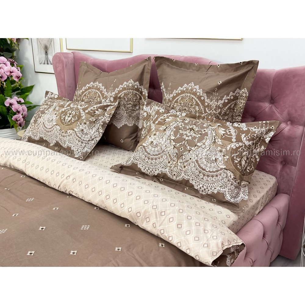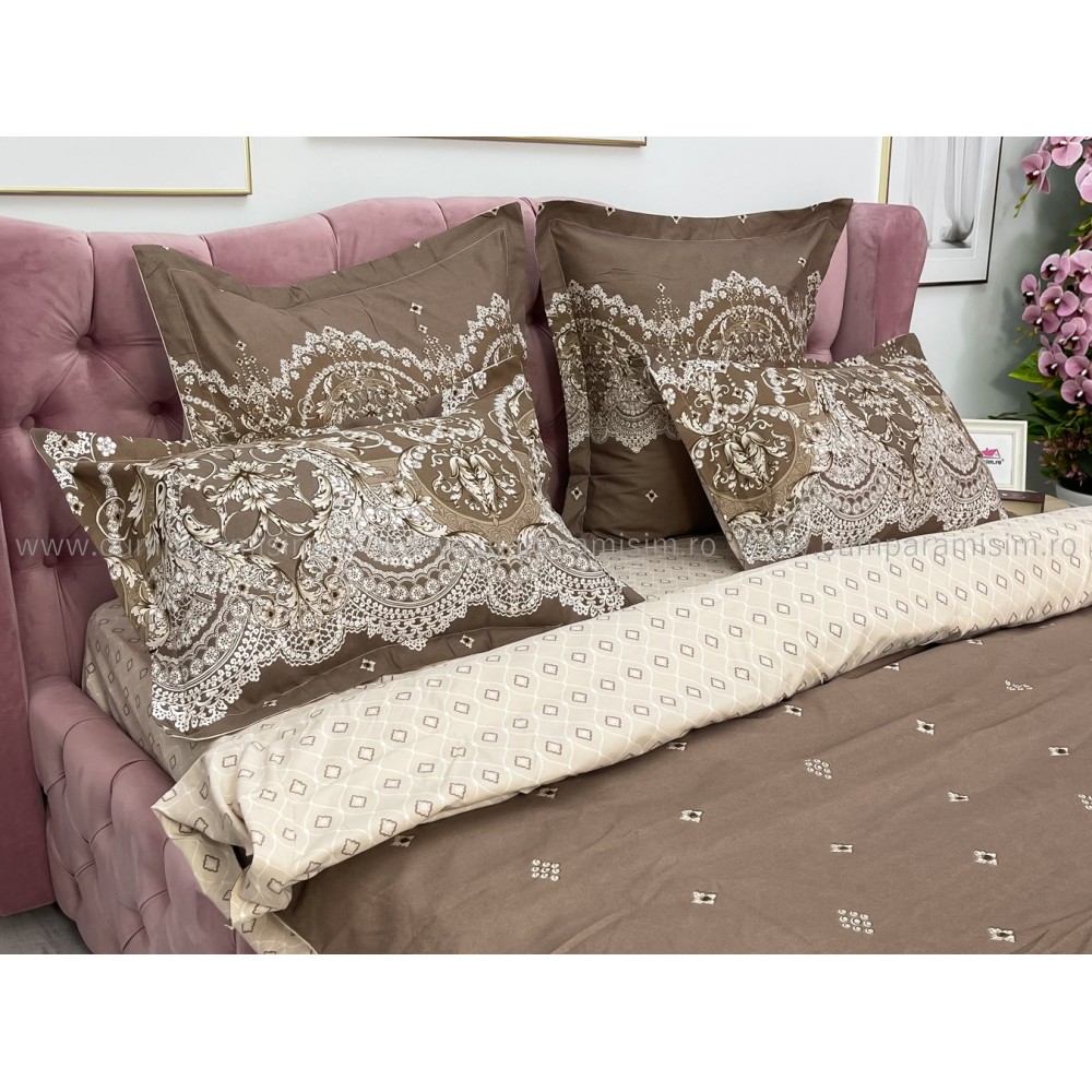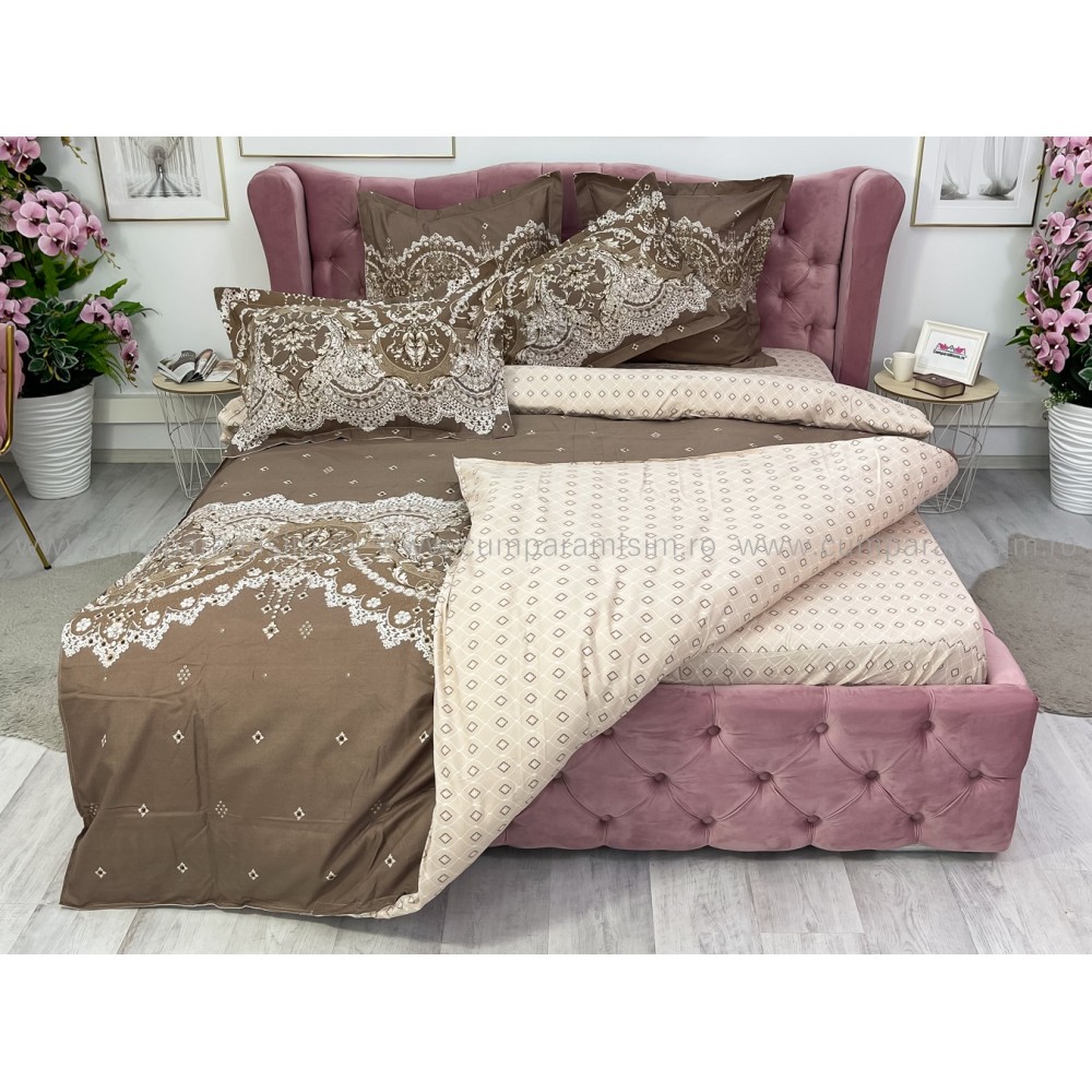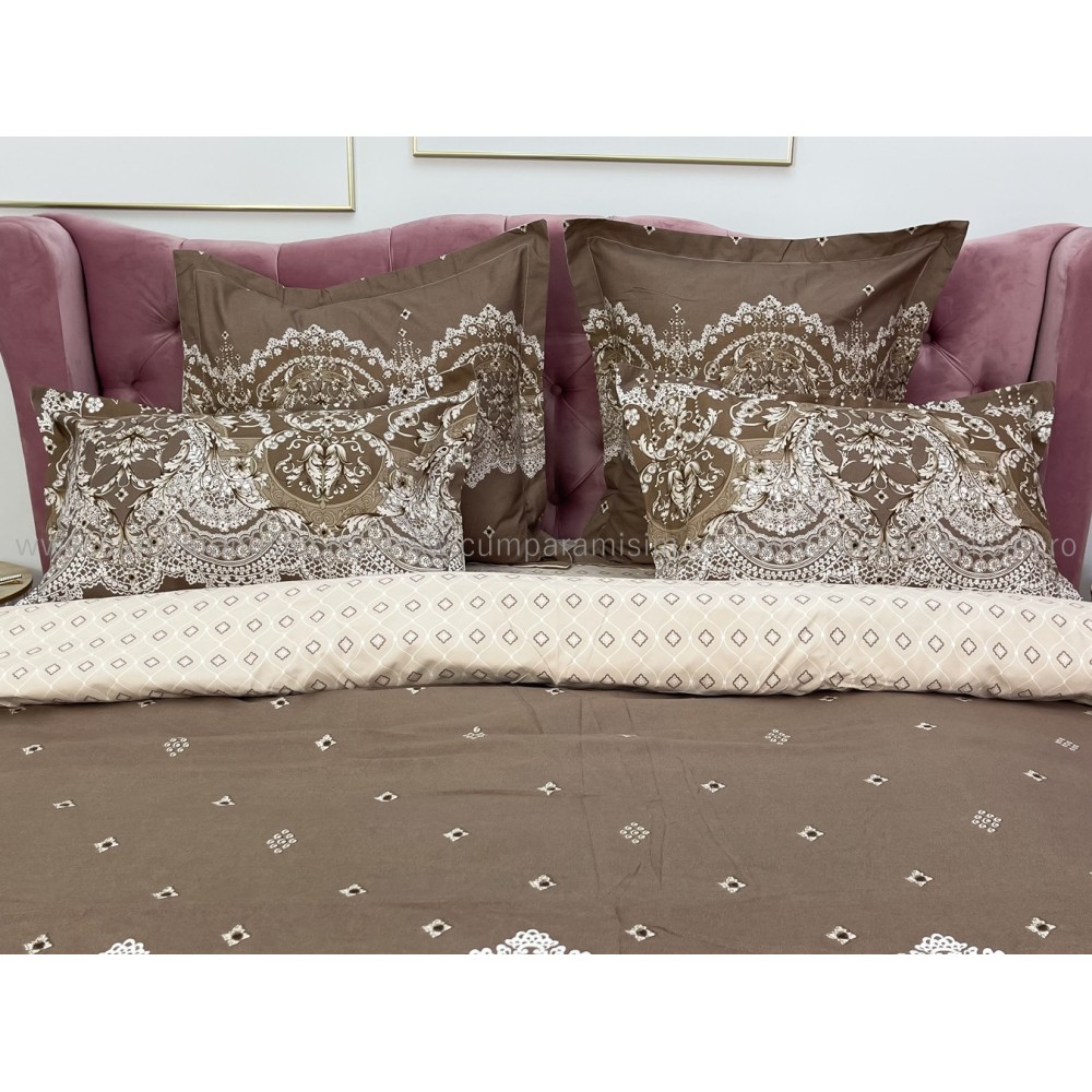 Lenjerie pat dublu, FINET, 6 piese, cu ELASTIC, Bej, oriental, Johny Home Pucioasa, cod produs: SPR-T-163