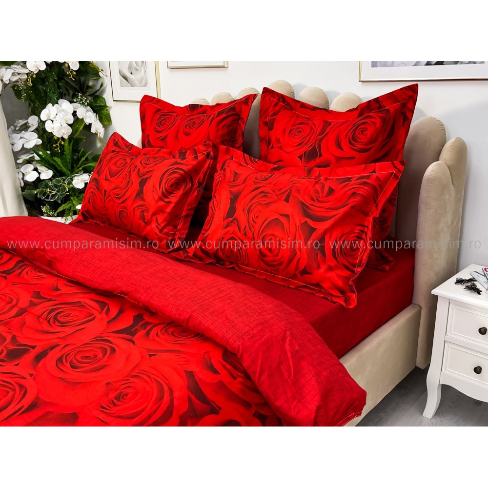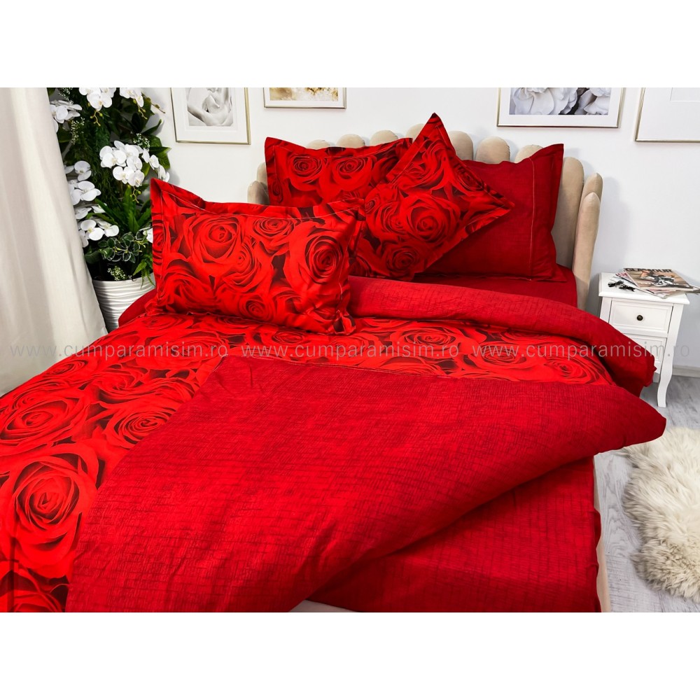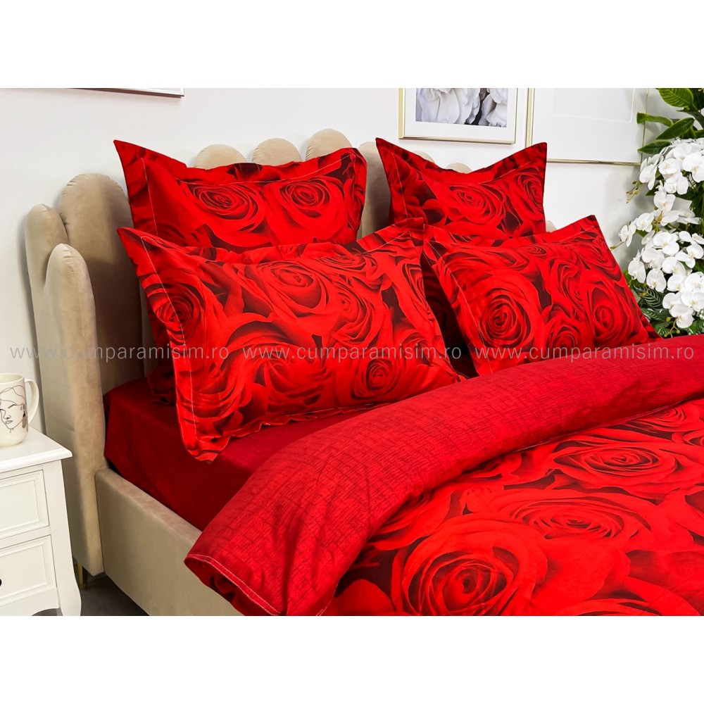 Lenjerie pat dublu, FINET, 6 piese, cu ELASTIC, Rosu, trandafiri, Johny Home Pucioasa, cod produs: SPR-T-168