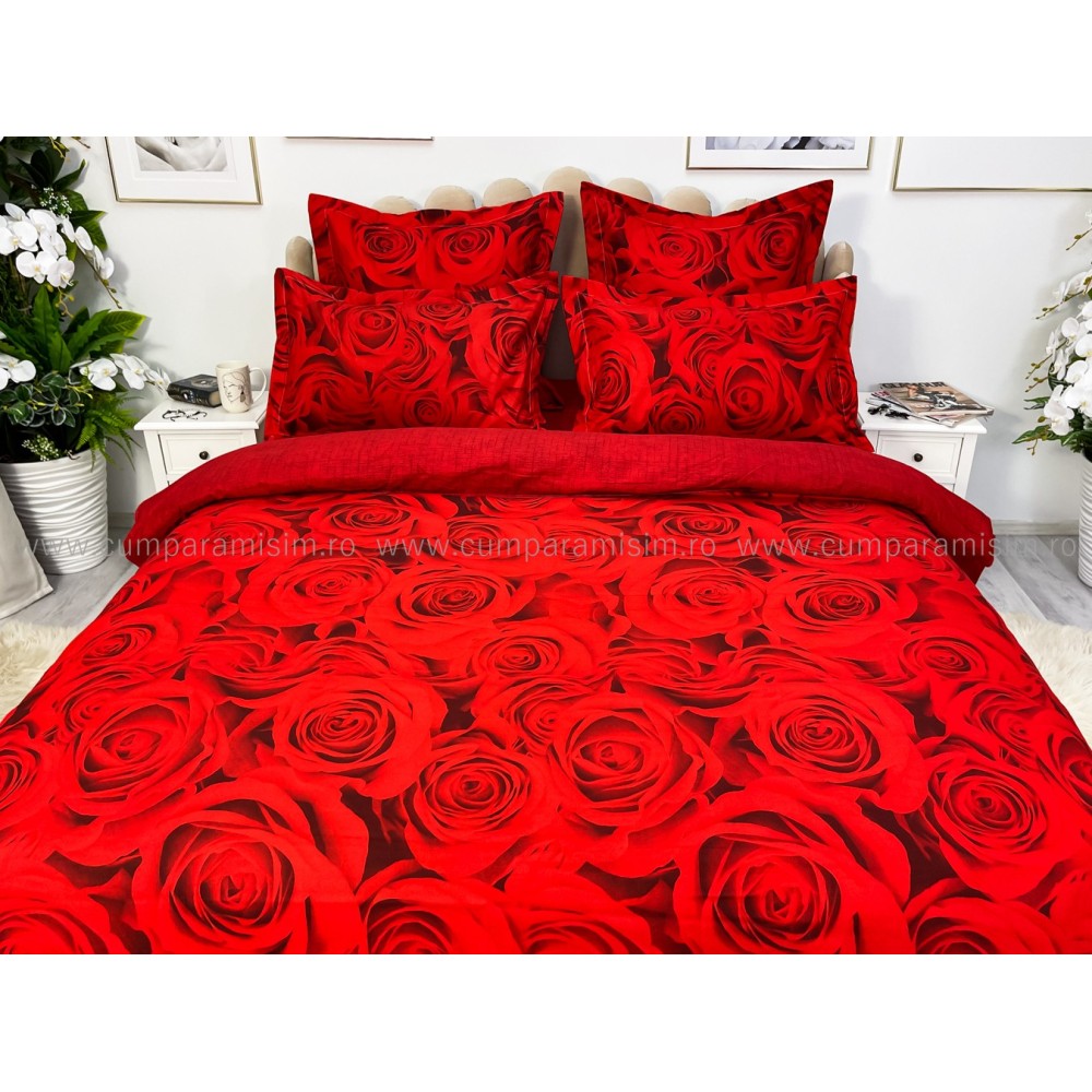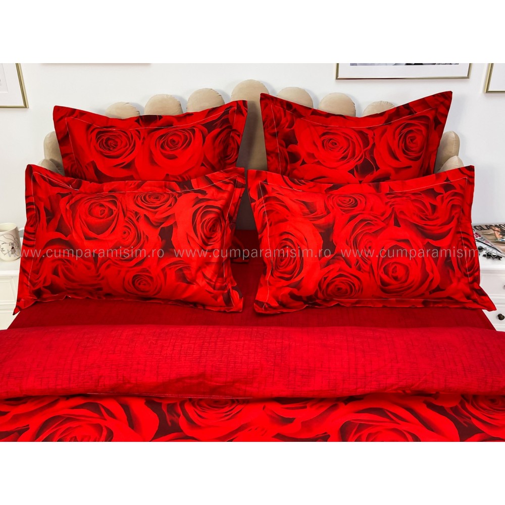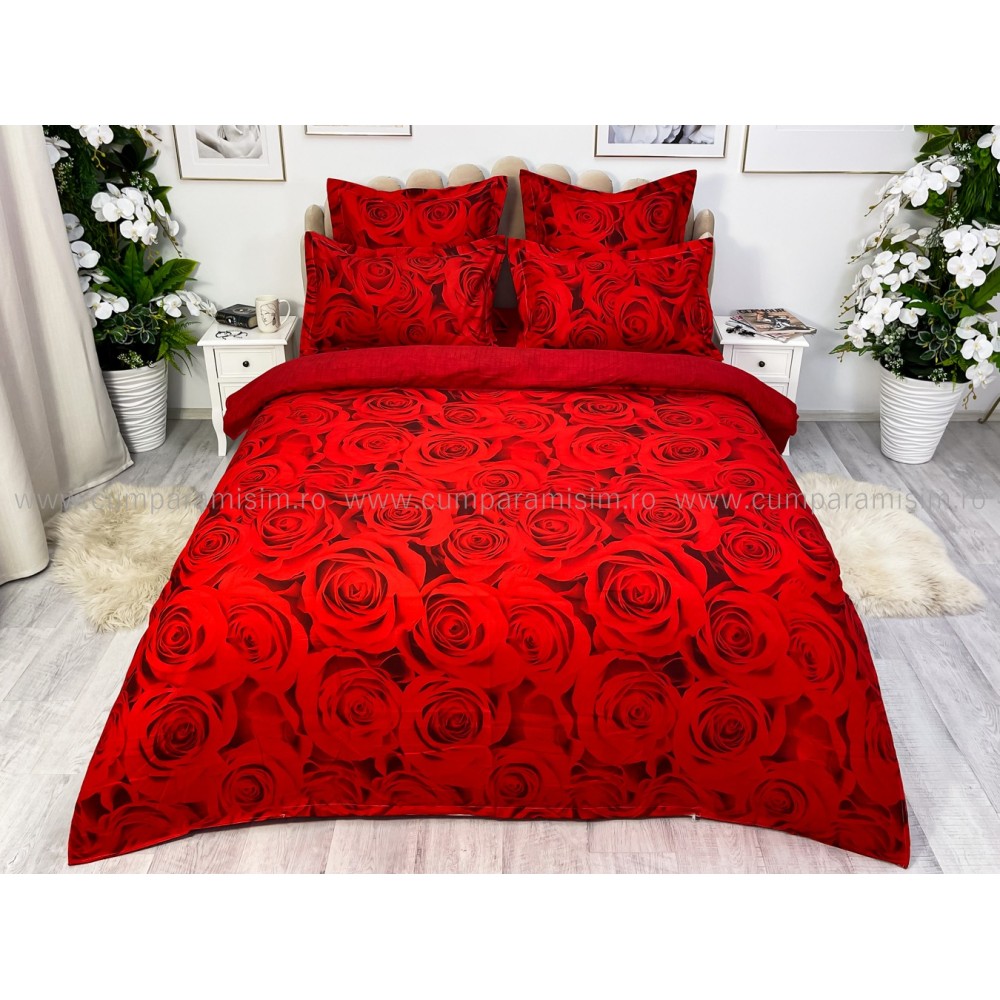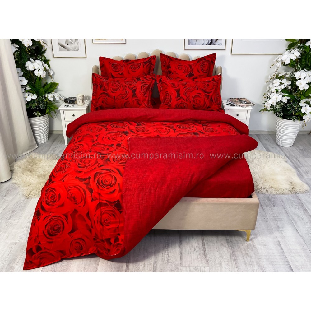 Lenjerie pat dublu, FINET, 6 piese, cu ELASTIC, Rosu, trandafiri, Johny Home Pucioasa, cod produs: SPR-T-168