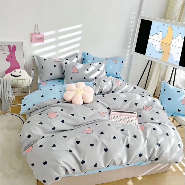 Lenjerie pat dublu, FINET, 6 piese, cu ELASTIC, Gri, inimioare, Johny Home Pucioasa, cod produs: SPR-T-241