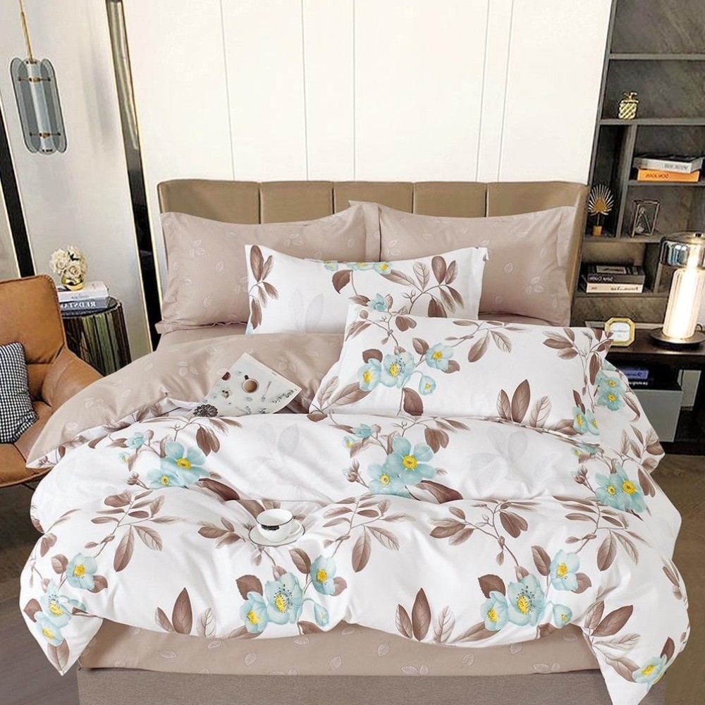 Lenjerie pat dublu, FINET, 6 piese, cu ELASTIC, Bej, flori, Johny Home Pucioasa, cod produs: SPR-T-247