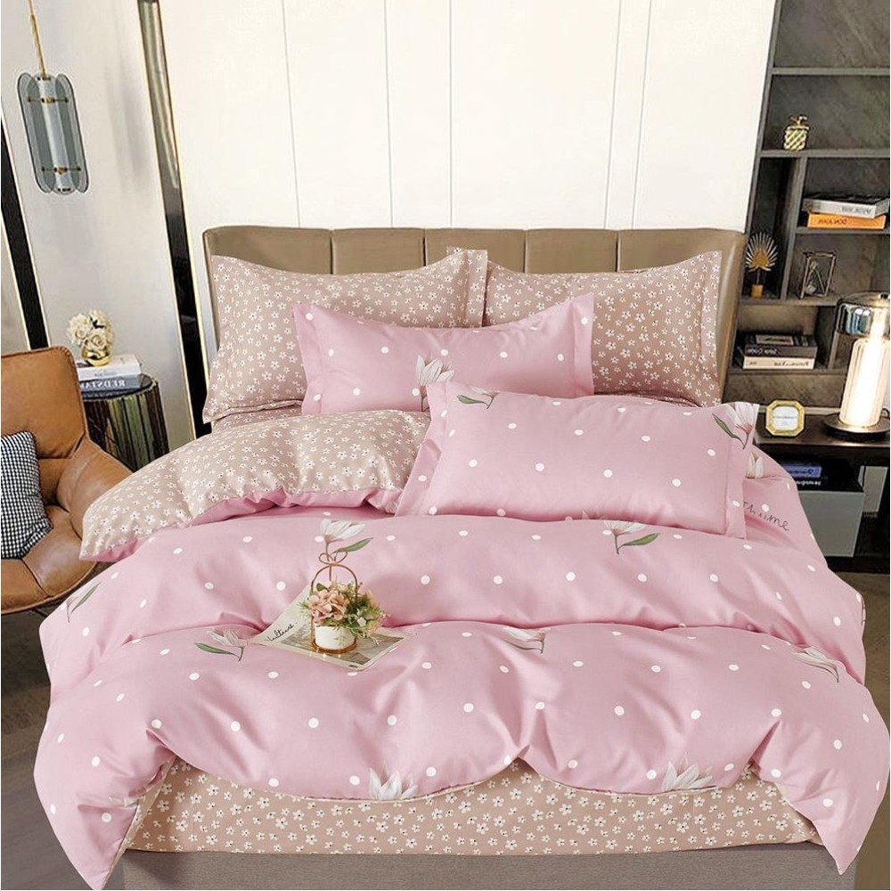 Lenjerie pat dublu, FINET, 6 piese, cu ELASTIC, Roz, magnolii, buline, Johny Home Pucioasa, cod produs: SPR-T-251